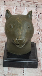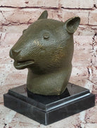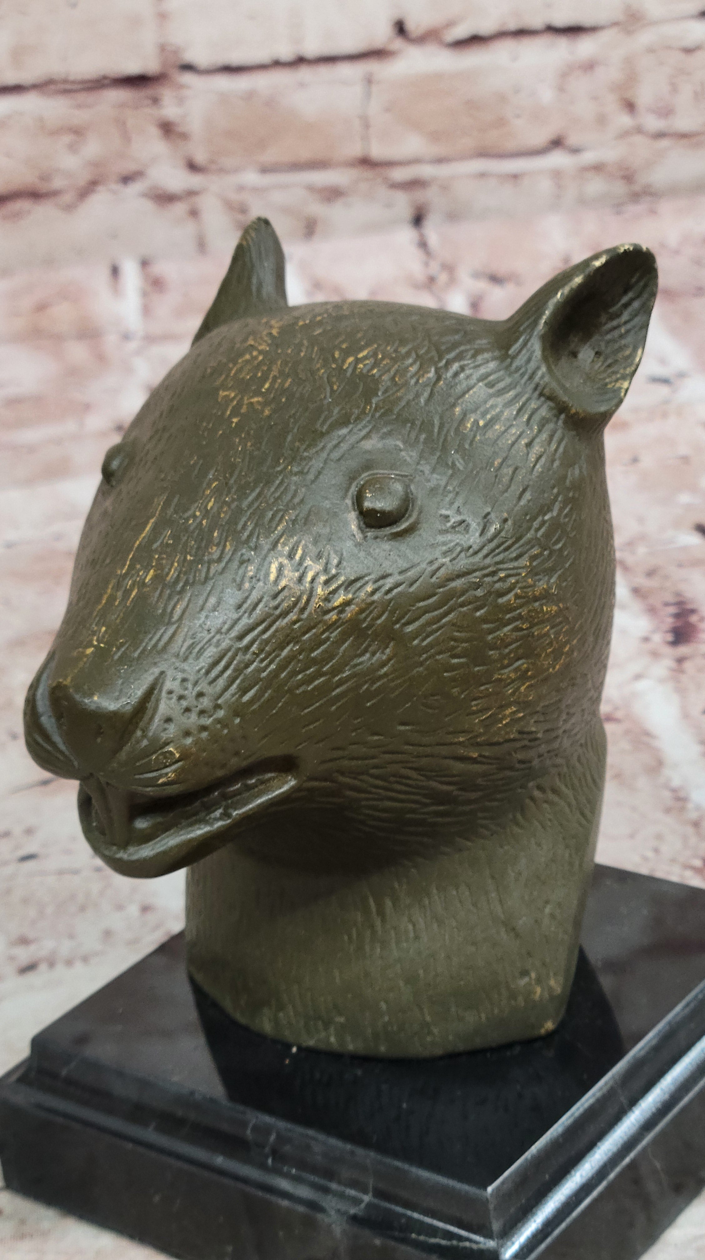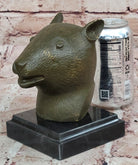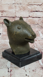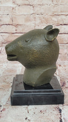This vintage bronze rat head bust sculpture, signed by artist Yanez, represents the first animal in the Chinese zodiac—the Rat. Known for symbolizing intelligence, resourcefulness, and adaptability, the Rat is admired for its sharp wit, charm, and social agility. With a focused and alert expression, this figurine captures the clever and perceptive nature of the zodiac sign, making it a meaningful addition to any space that values insight, strategy, and charm. Handcrafted using the traditional lost wax method, the sculpture is made from pure bronze and finished with a rich brown patina that enhances its rustic appeal. The fine detailing in the ears, whiskers, and facial features reflects exceptional craftsmanship, while the patina gives the piece a warm, vintage character. Its artistic style is both classic and timeless, suited for collectors and admirers of zodiac symbolism and antique-style decor. Mounted on a sleek black marble base, this sculpture blends rustic charm with elegance. Perfect for home, cabin, or farm-style settings, it also holds significance as a Fengshui piece or thoughtful gift. As a signed work by Yanez, it offers authenticity and collectible value—honoring the quick-thinking, adaptable spirit of those born under the Year of the Rat.