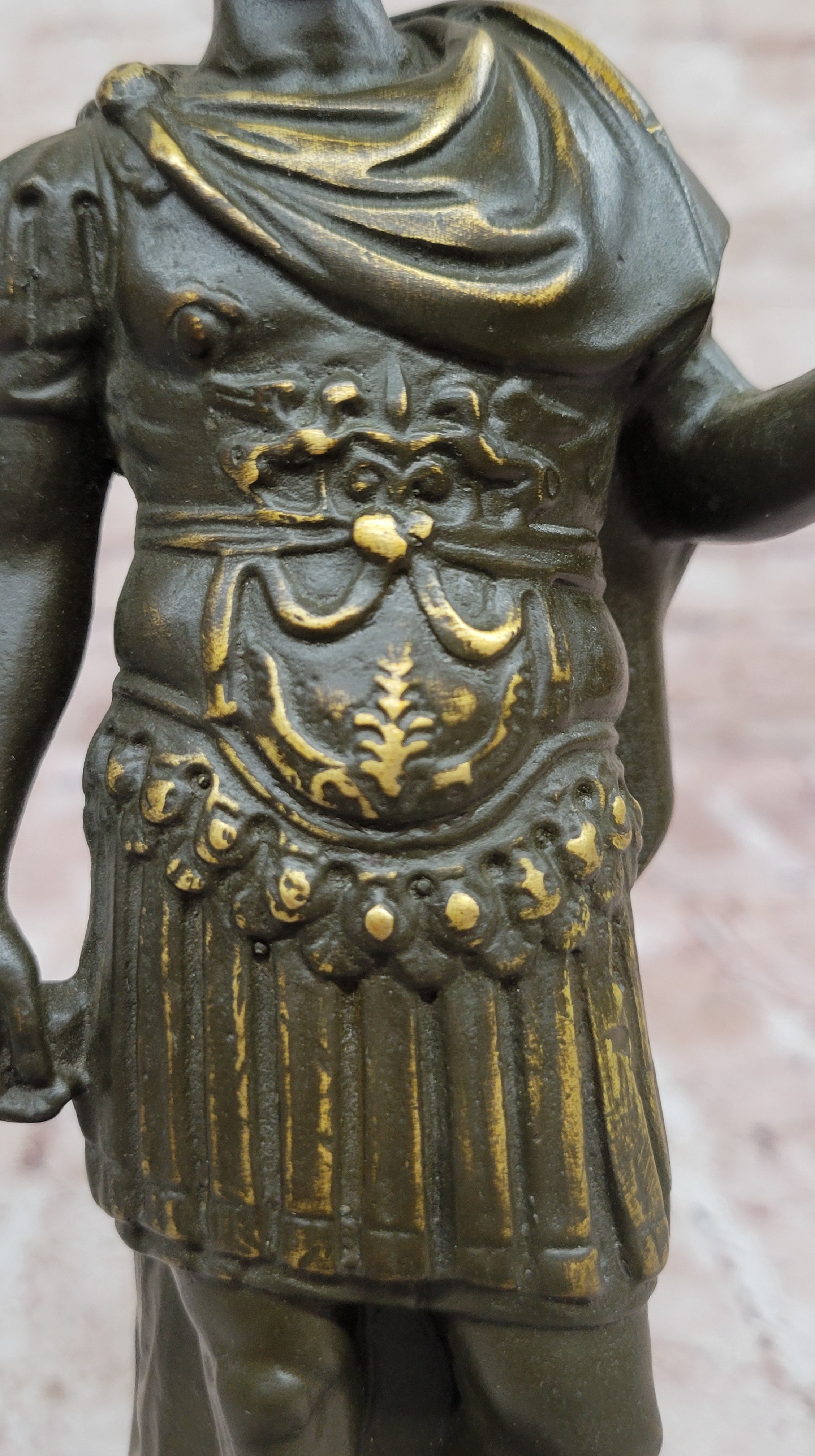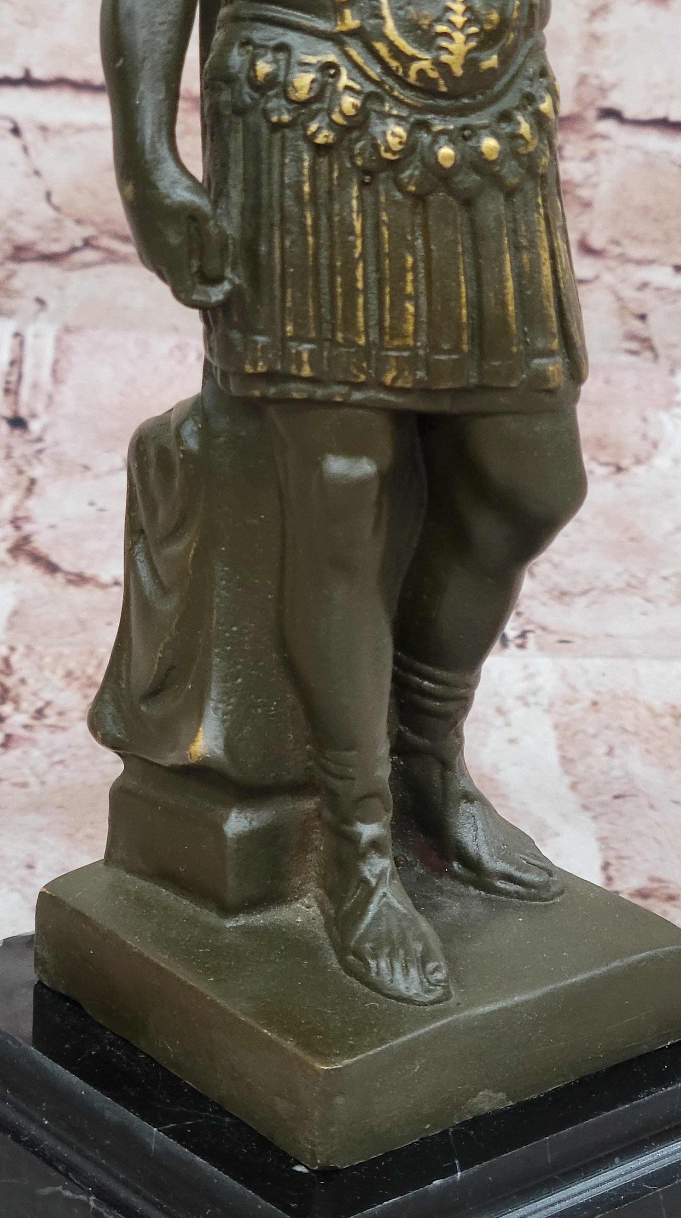 Handcrafted using the time-honored lost wax method, this sculpture showcases exceptional detail and craftsmanship. The two-tone brown patina adds depth and contrast, emphasizing the intricate textures of Caesar’s armor, robes, and facial features. The careful blending of tones enhances the realism of the piece, highlighting the artist’s dedication to historical accuracy and artistic precision.