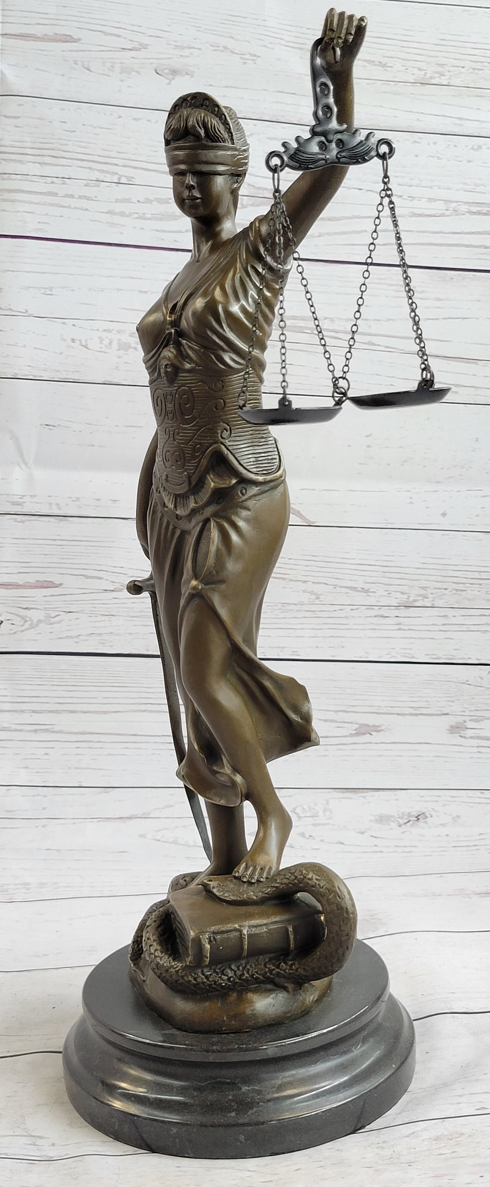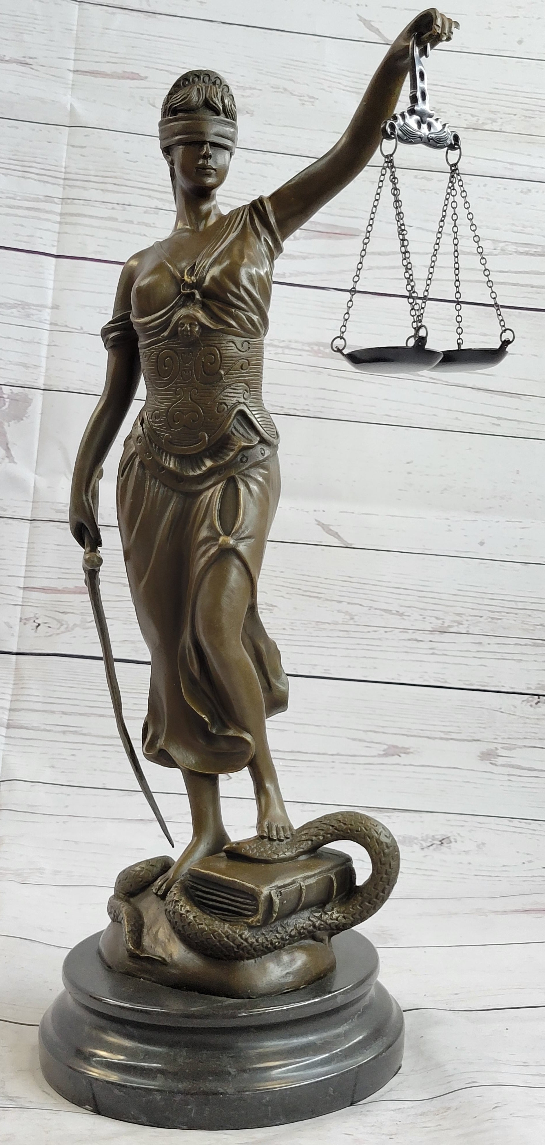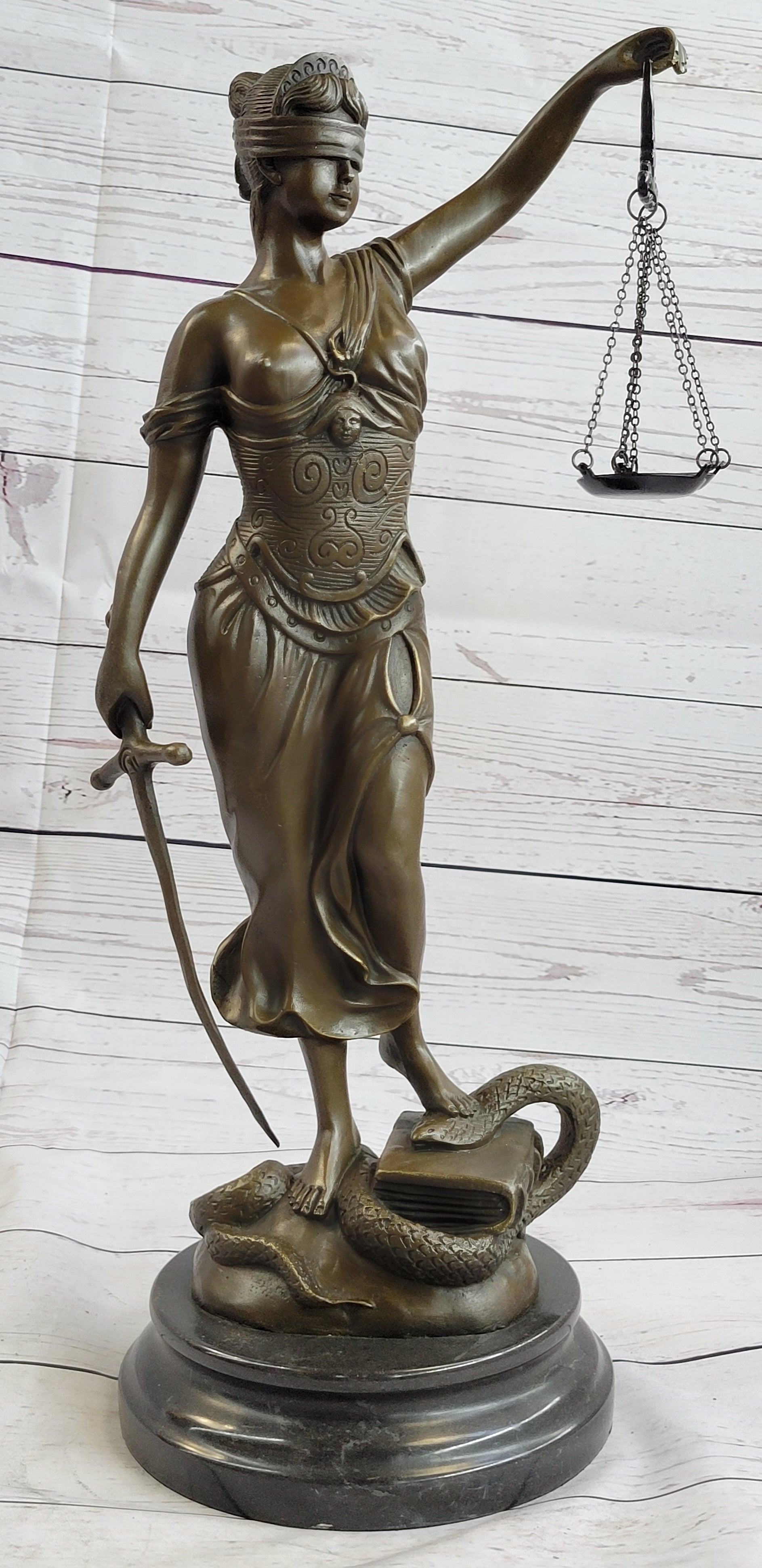This bronze sculpture portrays Lady Justice, the symbolic embodiment of moral force in judicial systems, representing truth, fairness, and objectivity. With an ancient depiction, Lady Justice stands blindfolded, delicately balancing the scales of truth and fairness in her left hand, while firmly holding a sword. As she steps upon a book and a coiled snake, her presence exudes strength and authority. The scales symbolize the weighing of evidence and arguments, determining the strength of a case's support and opposition. The blindfold emphasizes the importance of objectivity, ensuring that justice is administered without biases. The sword embodies the power of reason and justice, capable of being wielded for or against any party. The book represents history, serving as a testament to standing against wrongdoing or in support of past virtuous deeds. Lastly, the snake symbolizes hatred, and Lady Justice's foot firmly prevents it from gaining a foothold. This exceptional sculpture was meticulously created using the traditional lost-wax casting technique and finished with a rich brown patina. It proudly rests upon a black marble base, adding an elegant touch to its display.