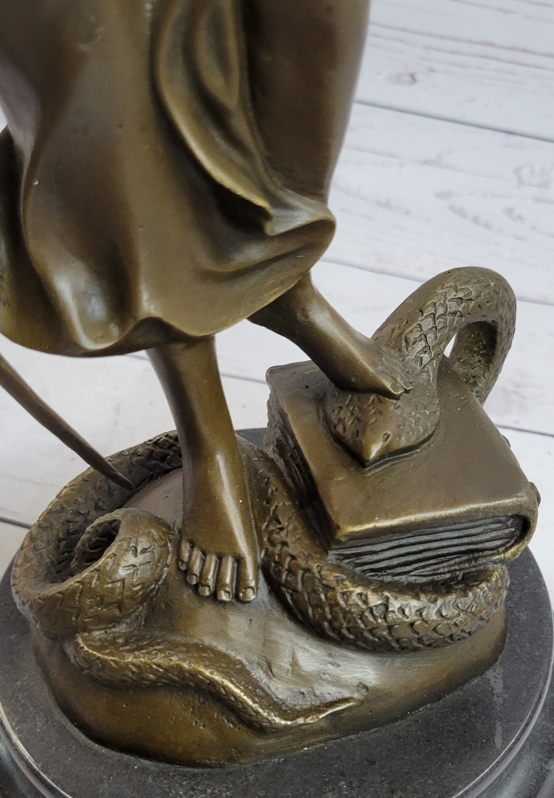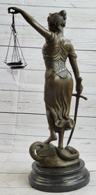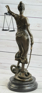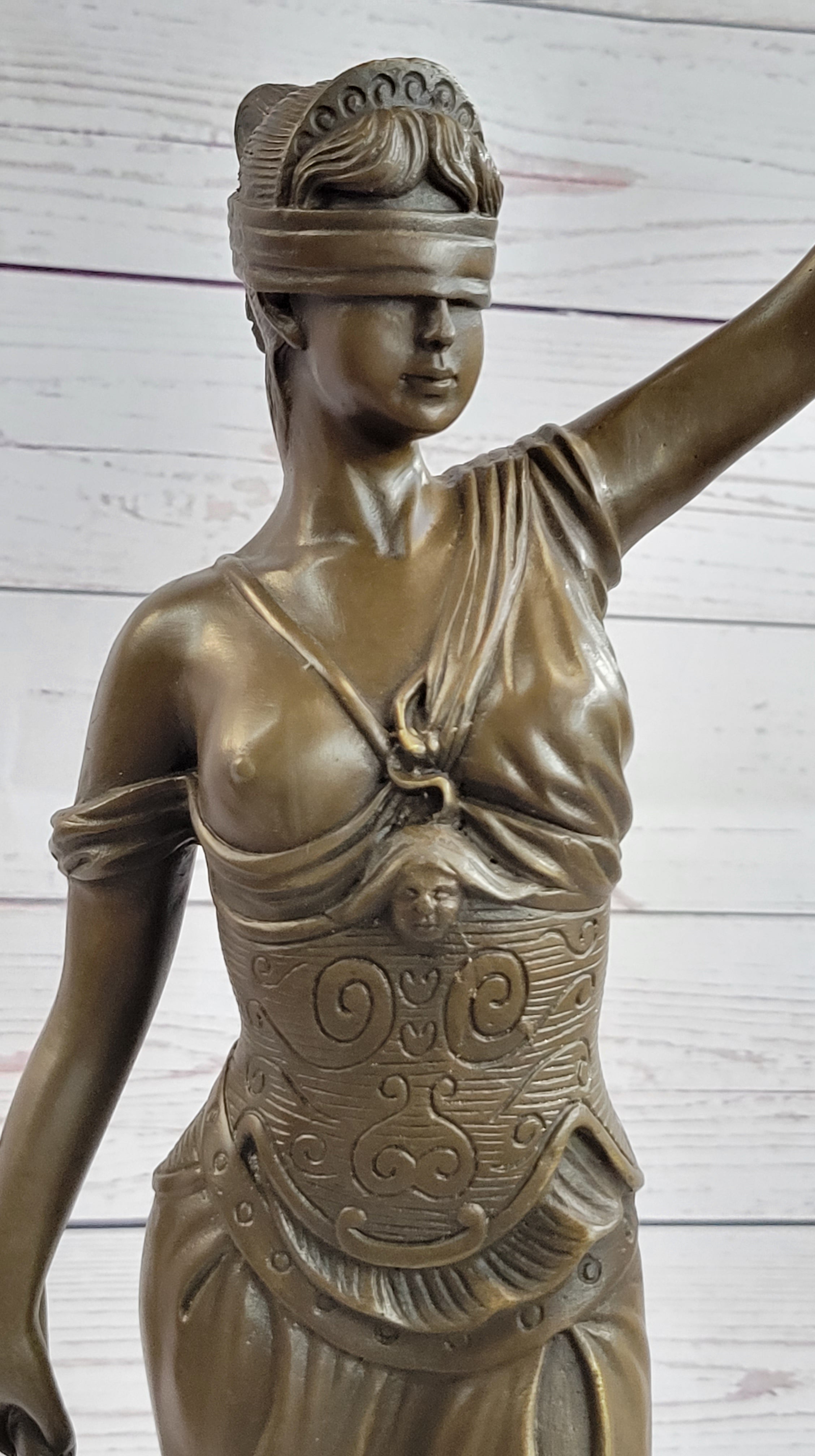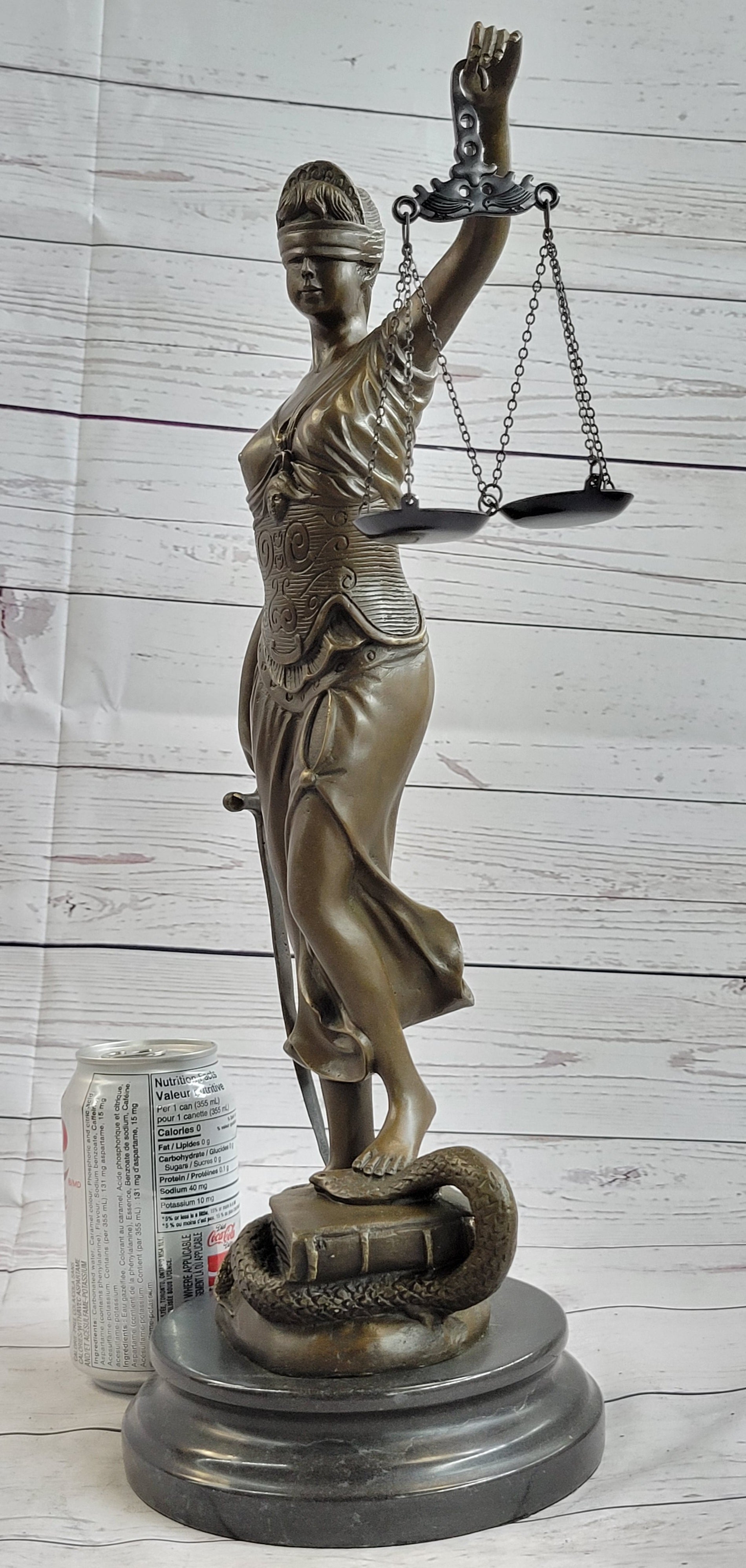 This bronze sculpture portrays Lady Justice, the symbolic embodiment of moral force in judicial systems, representing truth, fairness, and objectivity. With an ancient depiction, Lady Justice stands blindfolded, delicately balancing the scales of truth and fairness in her left hand, while firmly holding a sword. As she steps upon a book and a coiled snake, her presence exudes strength and authority. The scales symbolize the weighing of evidence and arguments, determining the strength of a case's support and opposition. The blindfold emphasizes the importance of objectivity, ensuring that justice is administered without biases. The sword embodies the power of reason and justice, capable of being wielded for or against any party. The book represents history, serving as a testament to standing against wrongdoing or in support of past virtuous deeds. Lastly, the snake symbolizes hatred, and Lady Justice's foot firmly prevents it from gaining a foothold. This exceptional sculpture was meticulously created using the traditional lost-wax casting technique and finished with a rich brown patina. It proudly rests upon a black marble base, adding an elegant touch to its display.