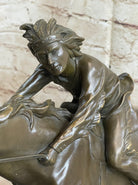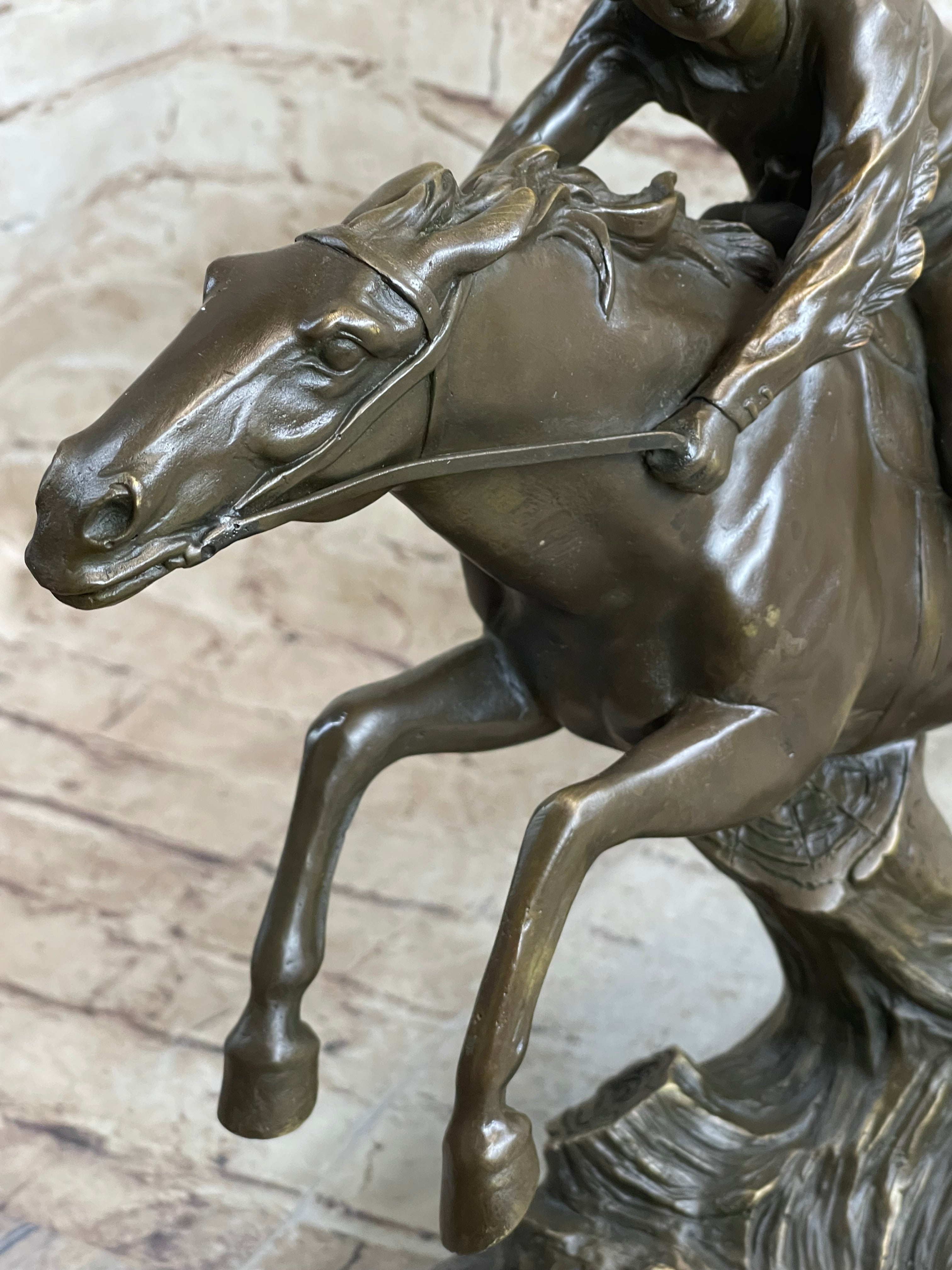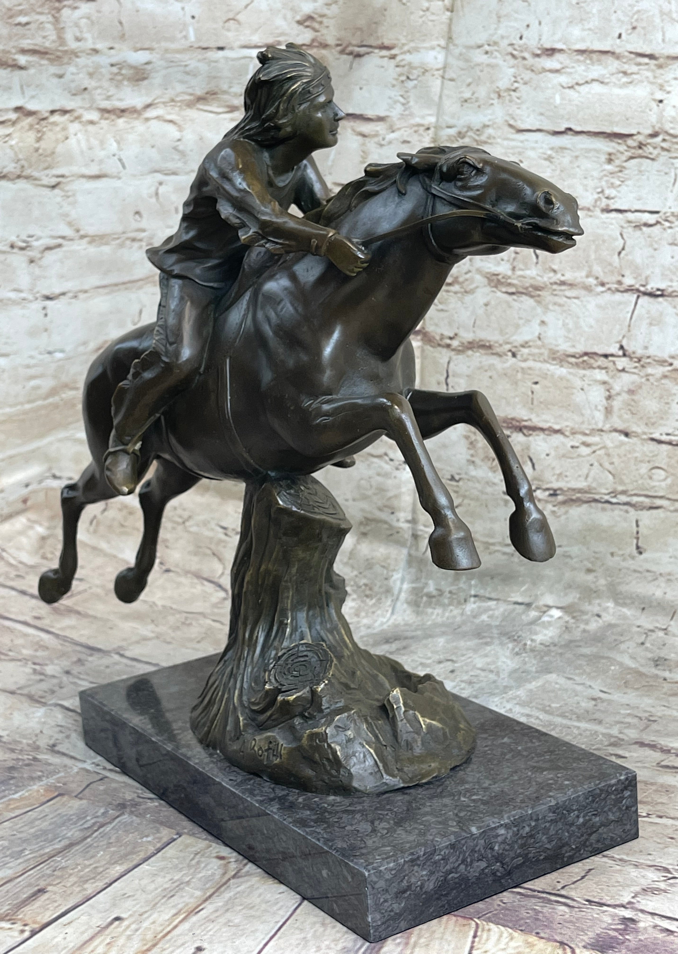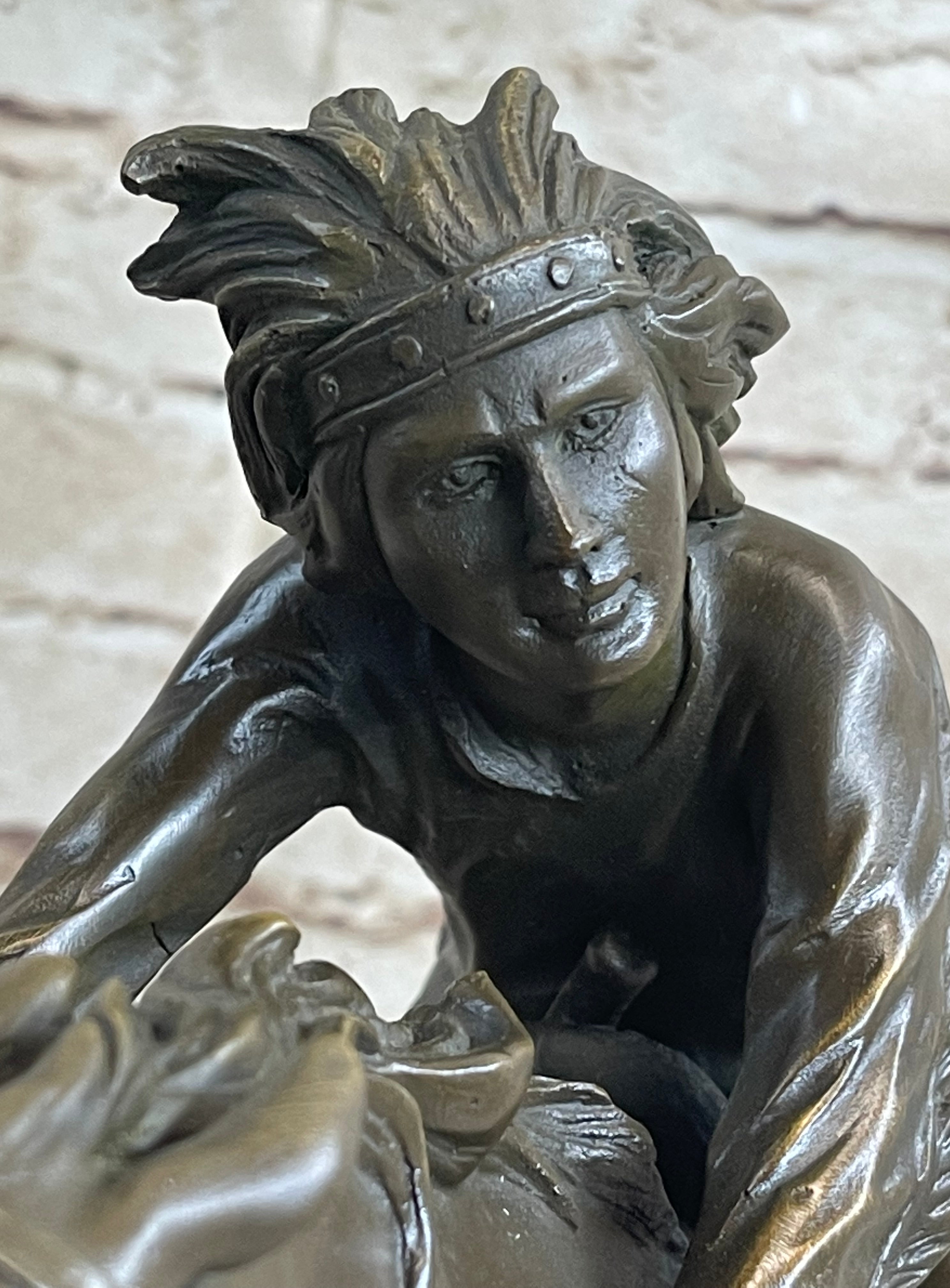 Antoine Bofill, a student of the Academy of Beaux-Arts in Barcelona, specialized in small figurines and groups, and his expertise shines through in this remarkable sculpture. The "Indian Warrior" stands as a testament to Bofill's mastery in bronze sculpture, capturing the essence of Native American culture and the spirit of the warrior. This piece is not only a beautiful addition to any collection but also a tribute to the timeless art of bronze sculpting.Bronze Dimensions with Marble Base: Height 13.5" X Width 16.5"