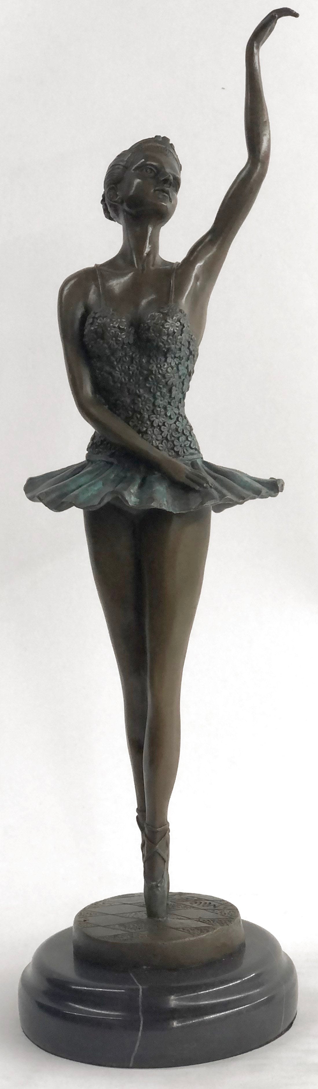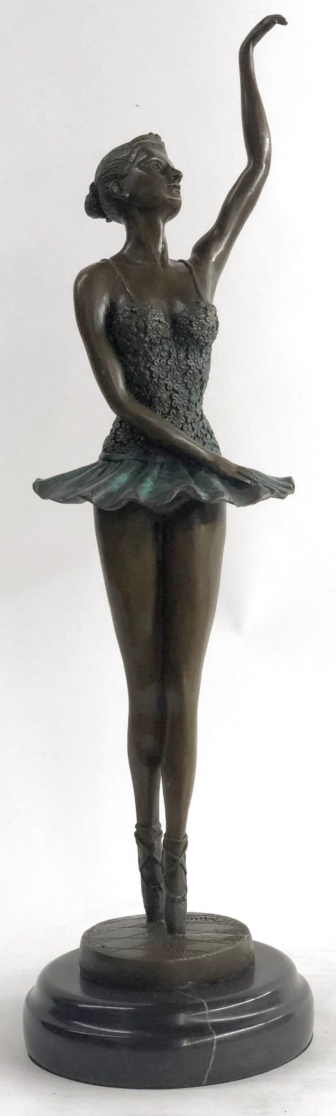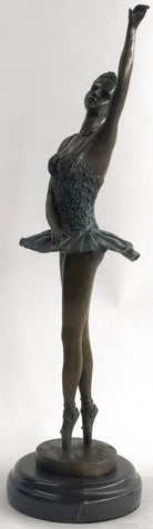 Whether displayed as a centerpiece or gifted to someone who appreciates the beauty and grace of ballet, this bronze ballerina statue is a timeless symbol of artistry and dedication. Its combination of delicate details, expert craftsmanship, and elegant presentation make it a truly captivating piece that will be treasured by ballet lovers and art enthusiasts alike.Bronze Dimensions with Marble Base: Height 16" X Width 9"