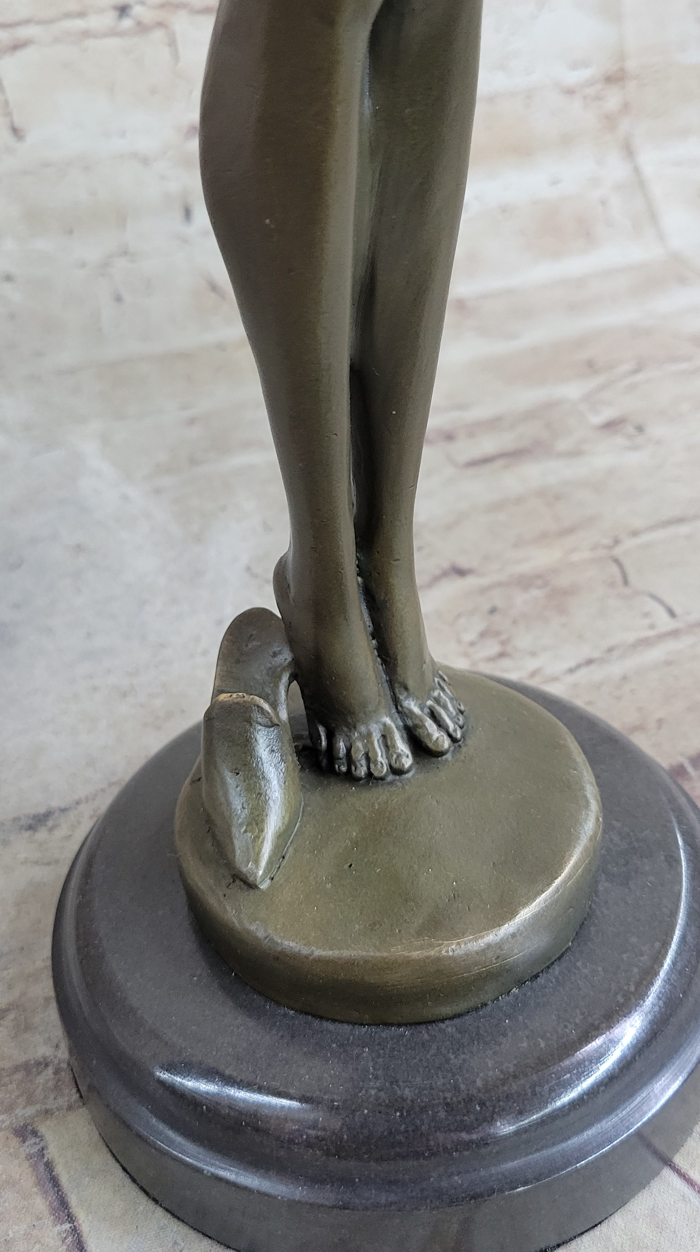 For collectors and art enthusiasts alike, this sculpture is a celebration of feminine beauty and the art of seduction. It captures a moment of playful confidence, inviting viewers to appreciate the skill and craftsmanship inherent in its creation. As it graces any space with its presence, it invites contemplation and admiration of its timeless allure.Bronze Dimensions with Marble Base: Height 17" X Width 5"