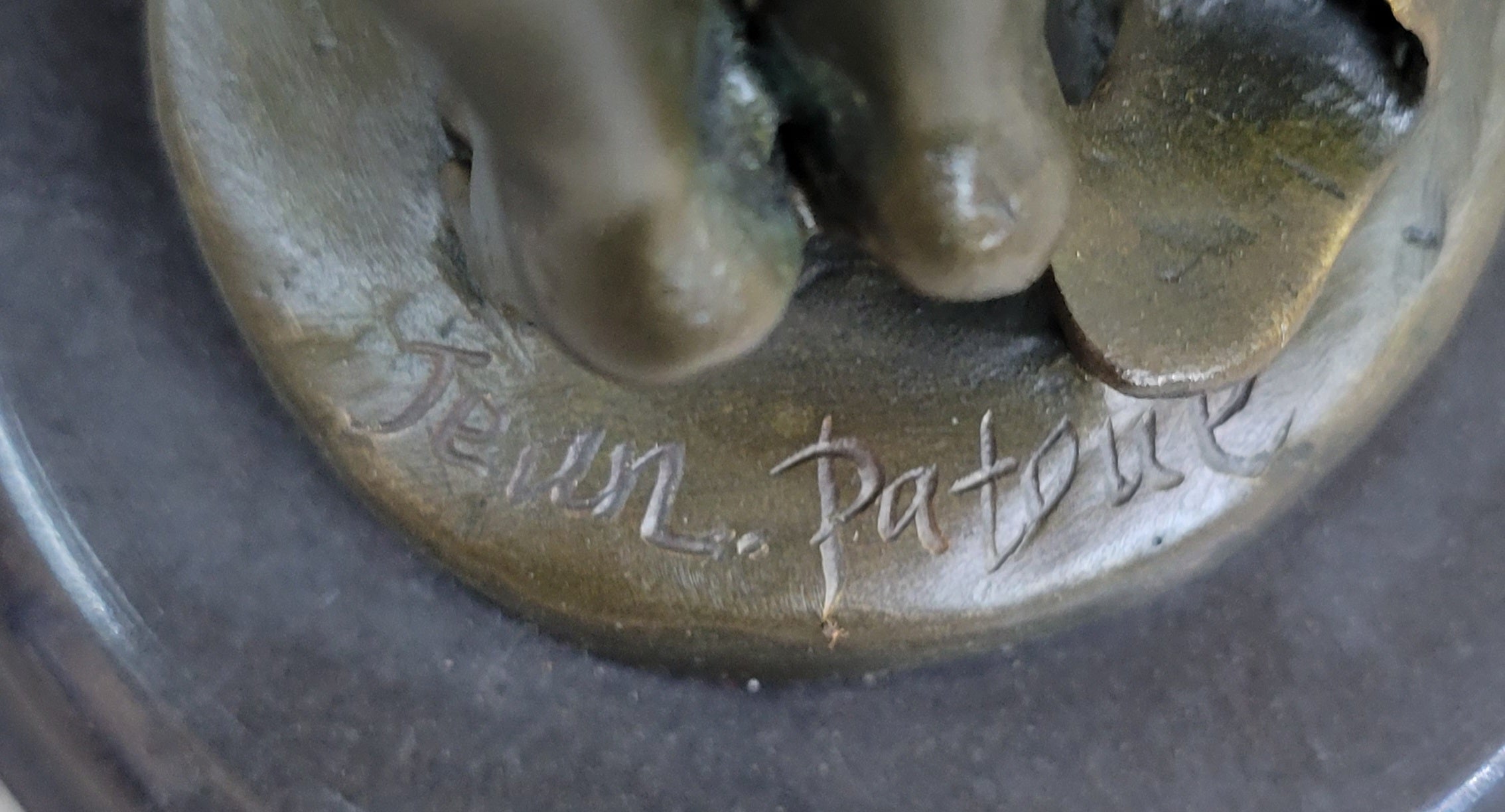 This exquisite sculpture is a testament to the timeless artistry of the lost wax method, meticulously crafted to preserve every nuanced detail of the subject. The artist's skill is evident in the portrayal of the woman's curvaceous and graceful form. Resting elegantly upon a black marble base, it enhances the sculpture's aesthetic appeal while ensuring its stability and endurance. The inclusion of Jean Patoue's signature serves as a mark of authenticity, affirming its place within the artist's distinguished body of work.