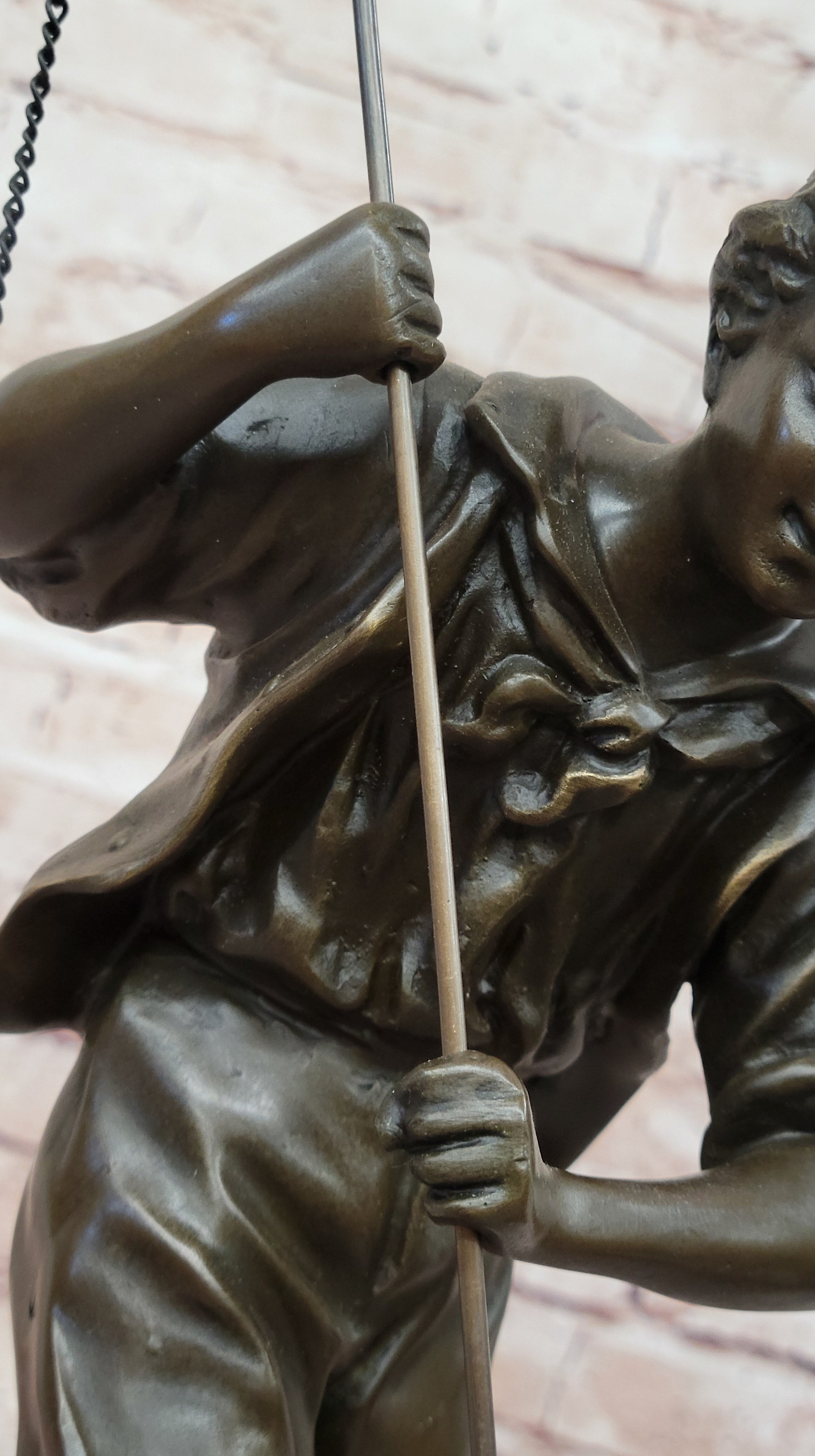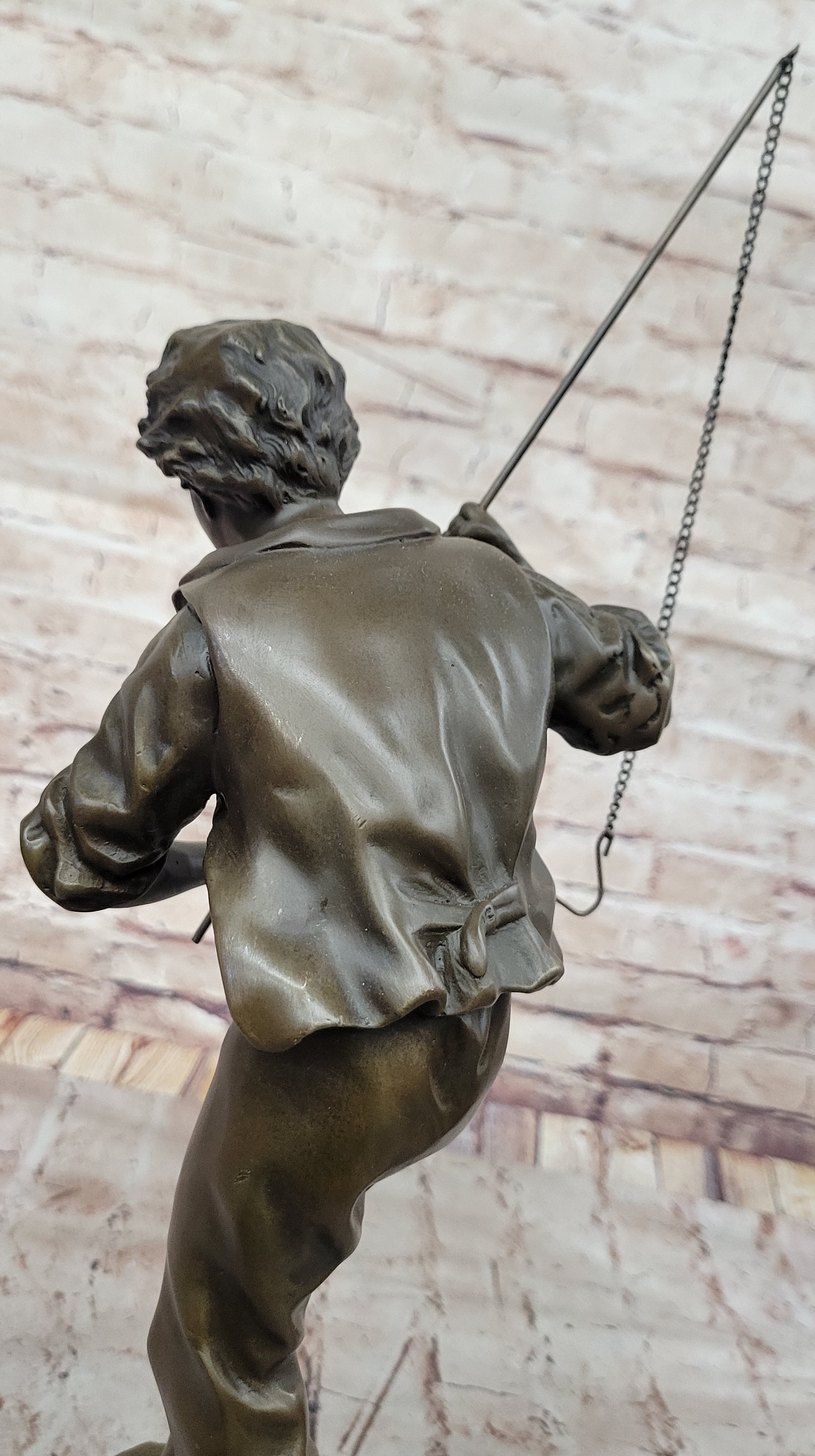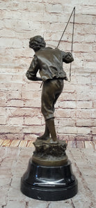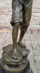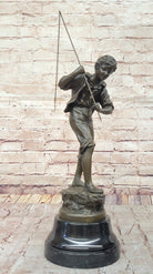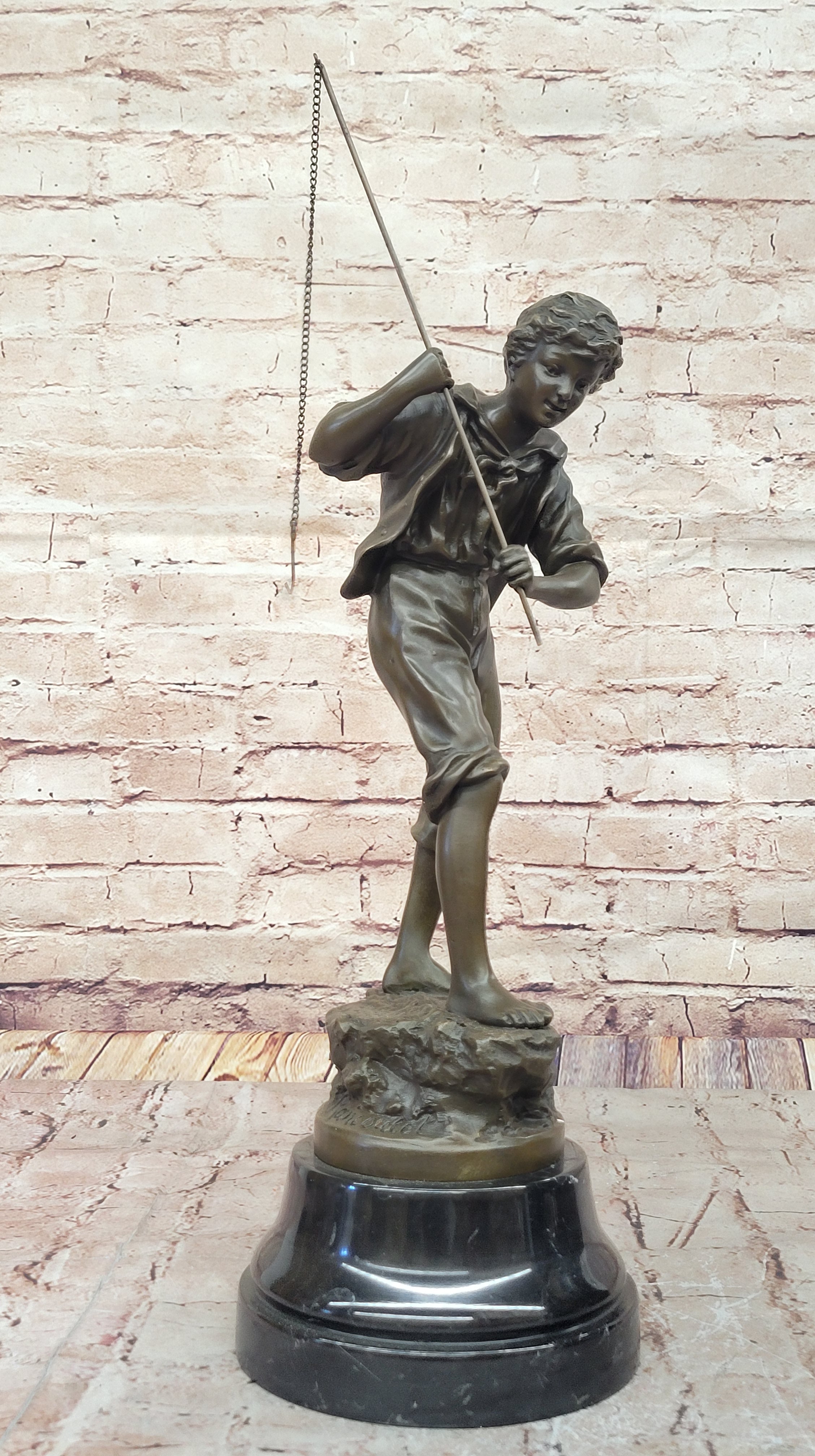Bronze Sculpture of a Boy Fishing by Rancoulet - Handmade Statue on Marble Base