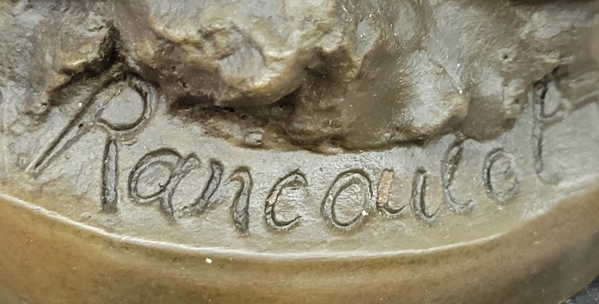Mounted on a polished round black marble base, this statuette exudes elegance and stability. Signed by Rancoulet, it is a testament to the artist's skill and dedication to capturing the beauty of everyday life. This sculpture makes a perfect addition to any art collection or a thoughtful gift for fishing enthusiasts and collectors of fine bronze art.Bronze Dimensions with Marble Base: Height 20.5" X Width 7"