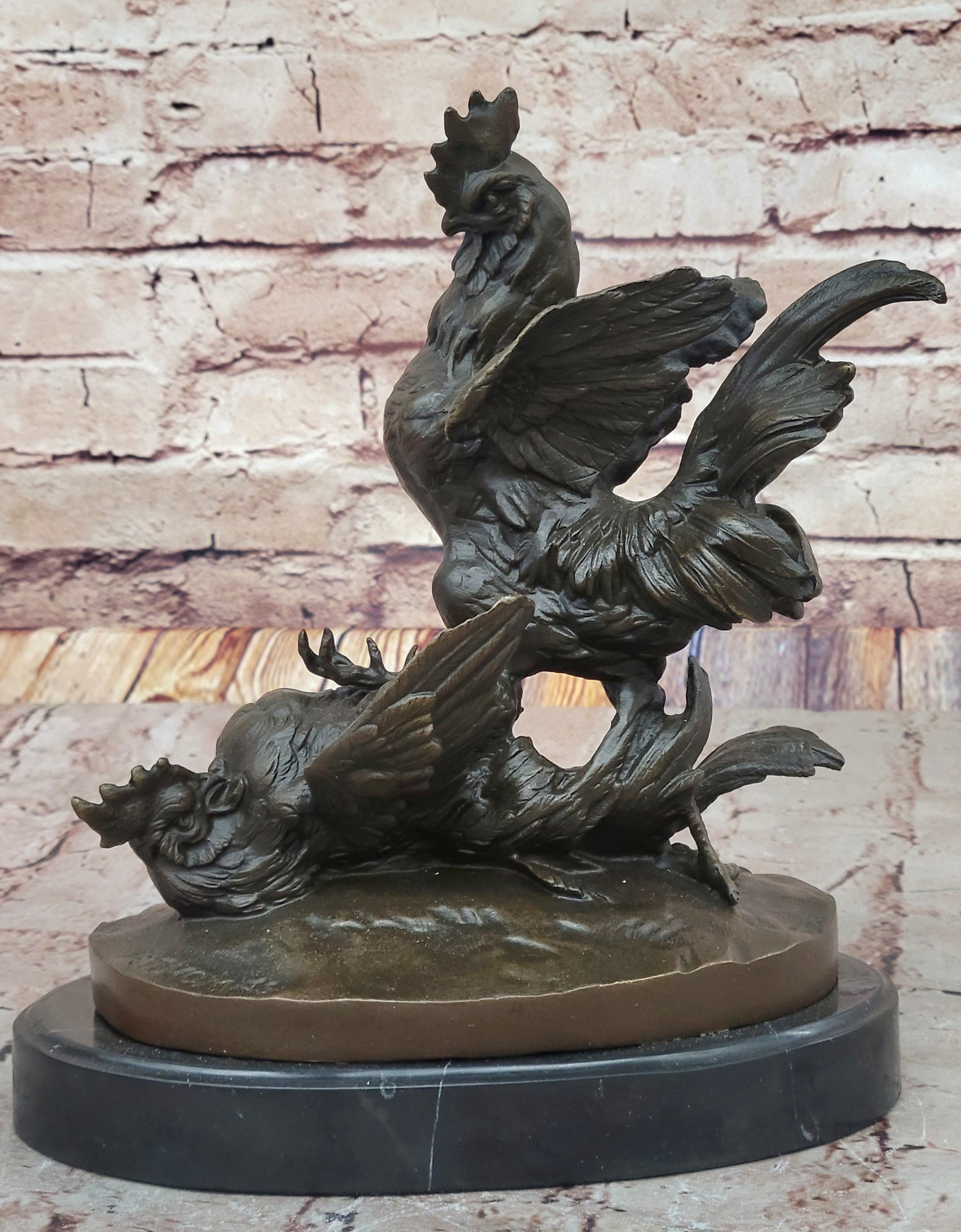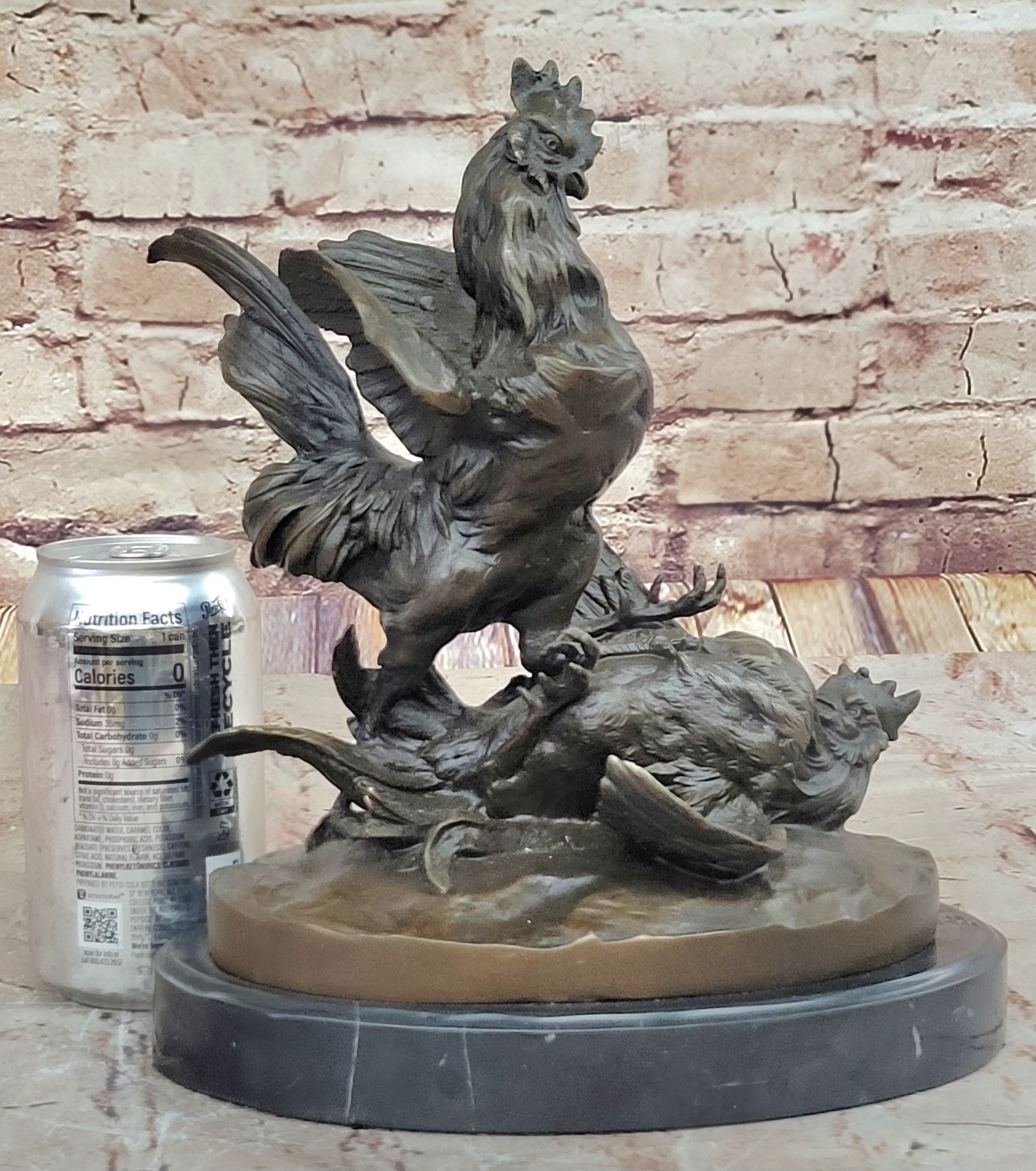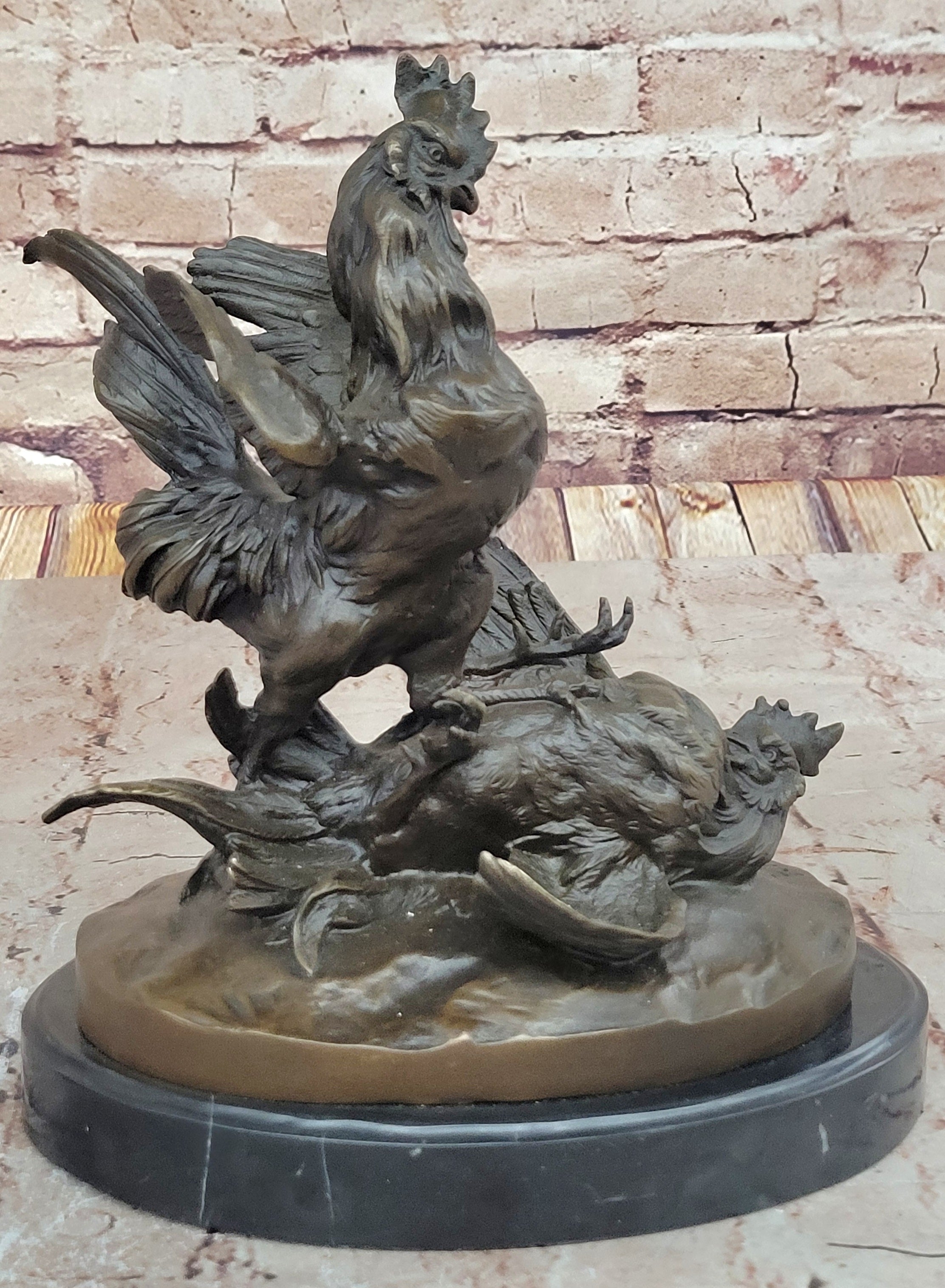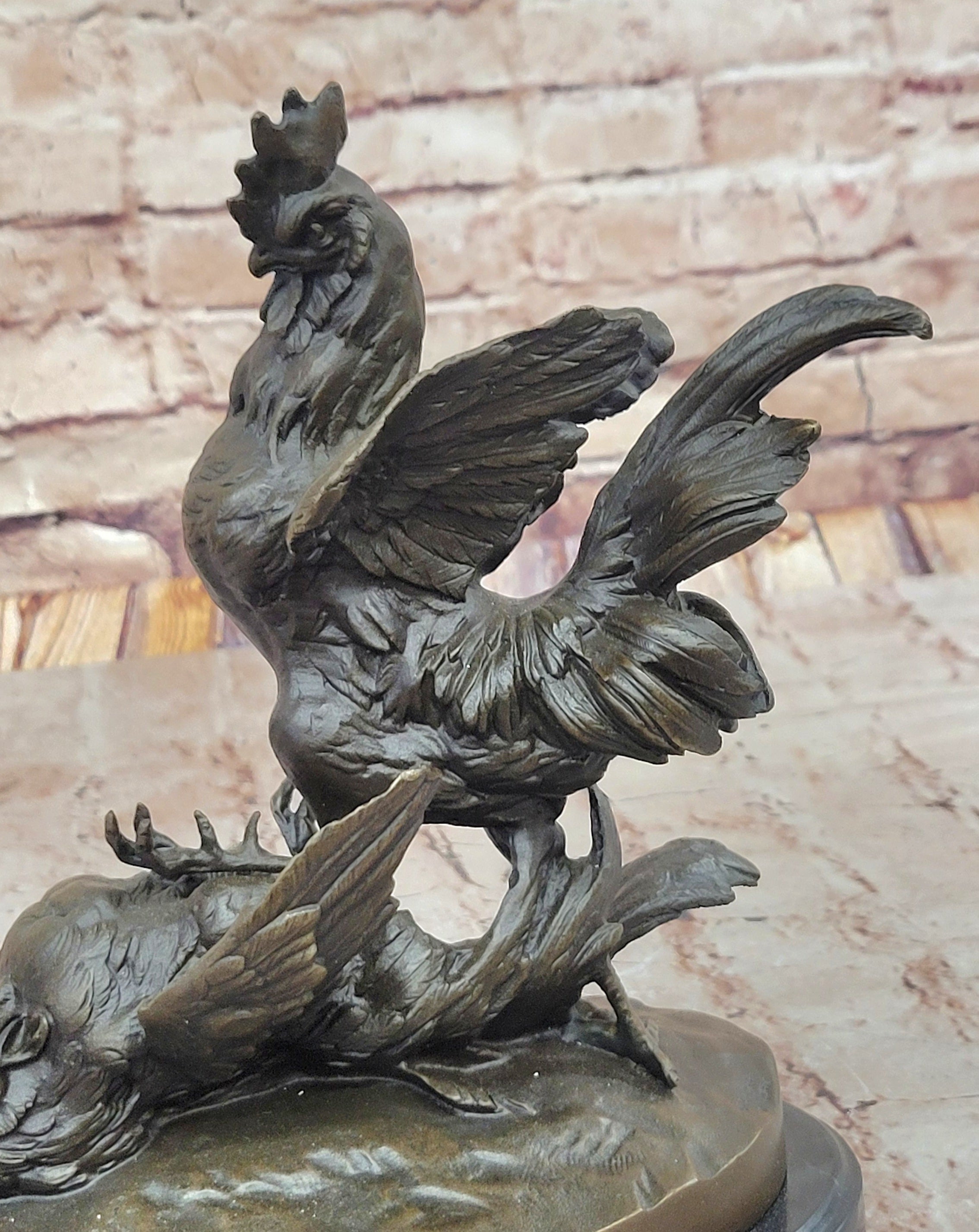 Bronze Sculpture of Fighting Roosters on Black Marble Base