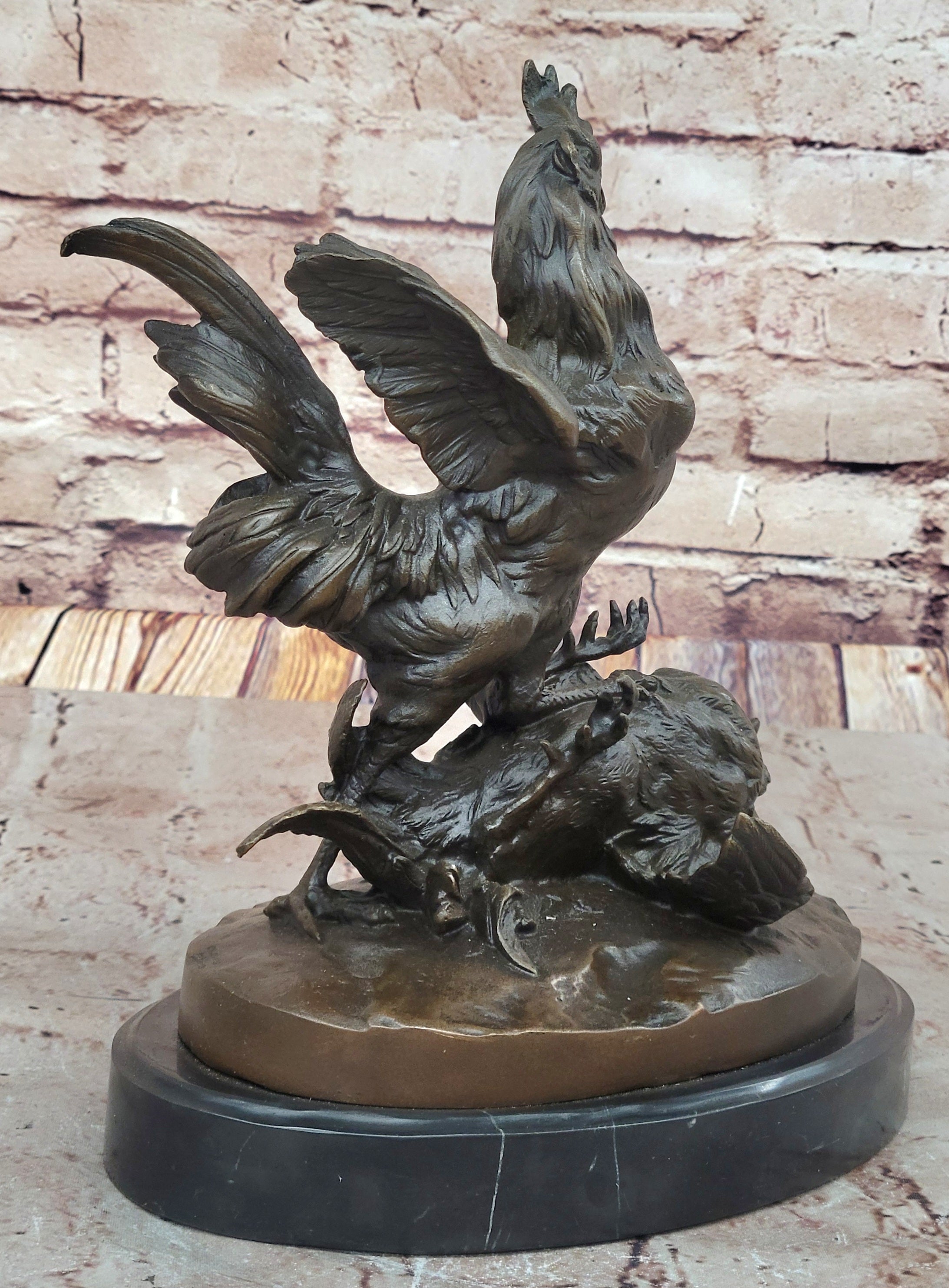 This bronze sculpture captures the essence of the cockfight, with meticulous attention to detail. The cocky rooster stands tall, holding its head high and puffing out its chest, exuding confidence and pride. Its wings are subtly positioned behind, emphasizing its boasting posture. The artist has masterfully depicted the rooster's fierce scowl, adding to the realism of the sculpture.