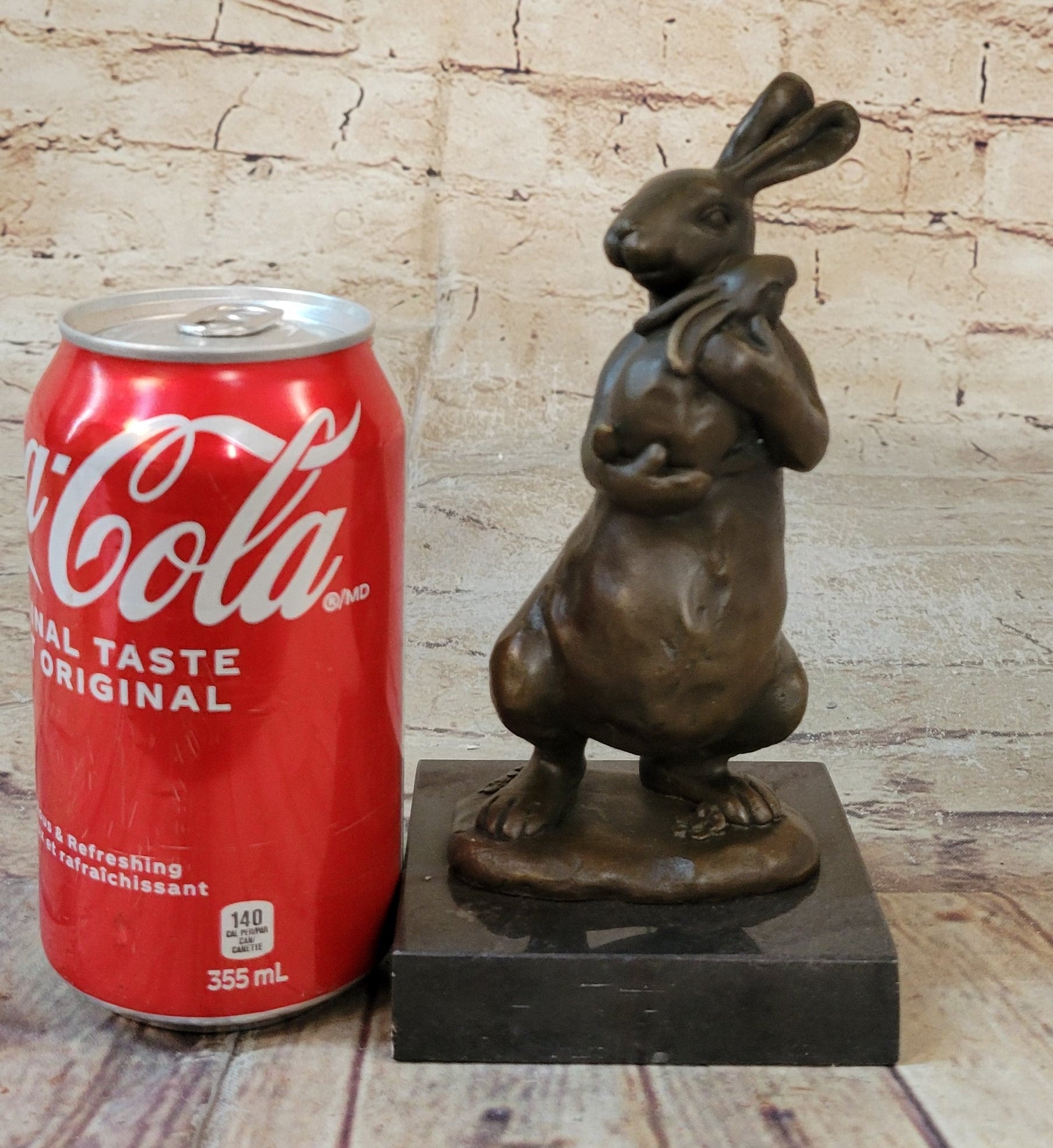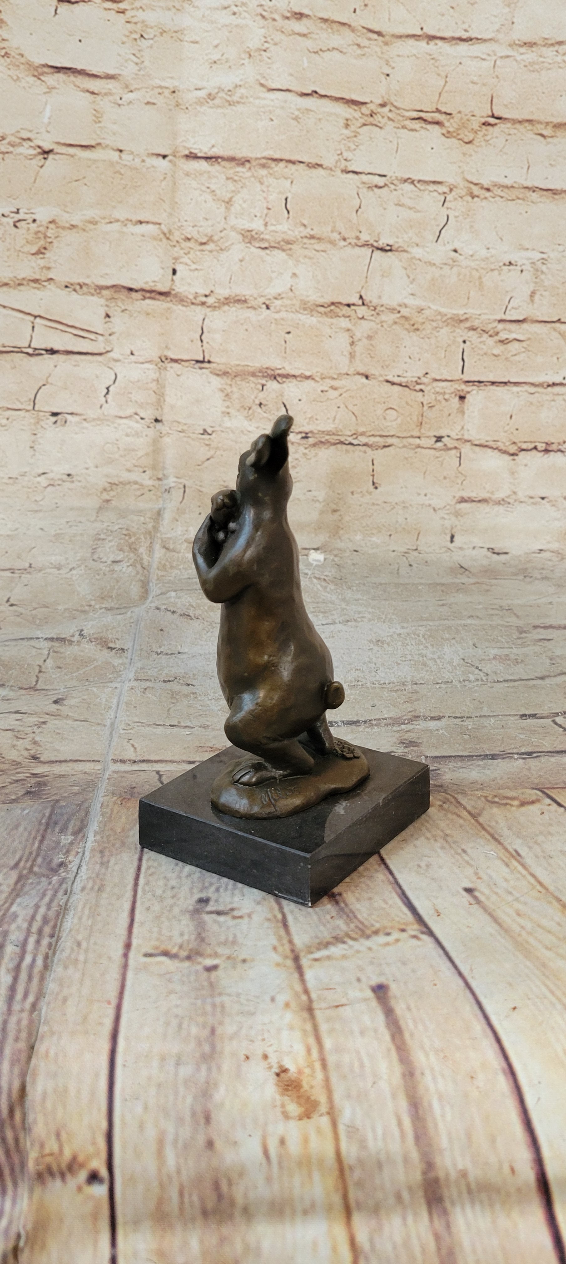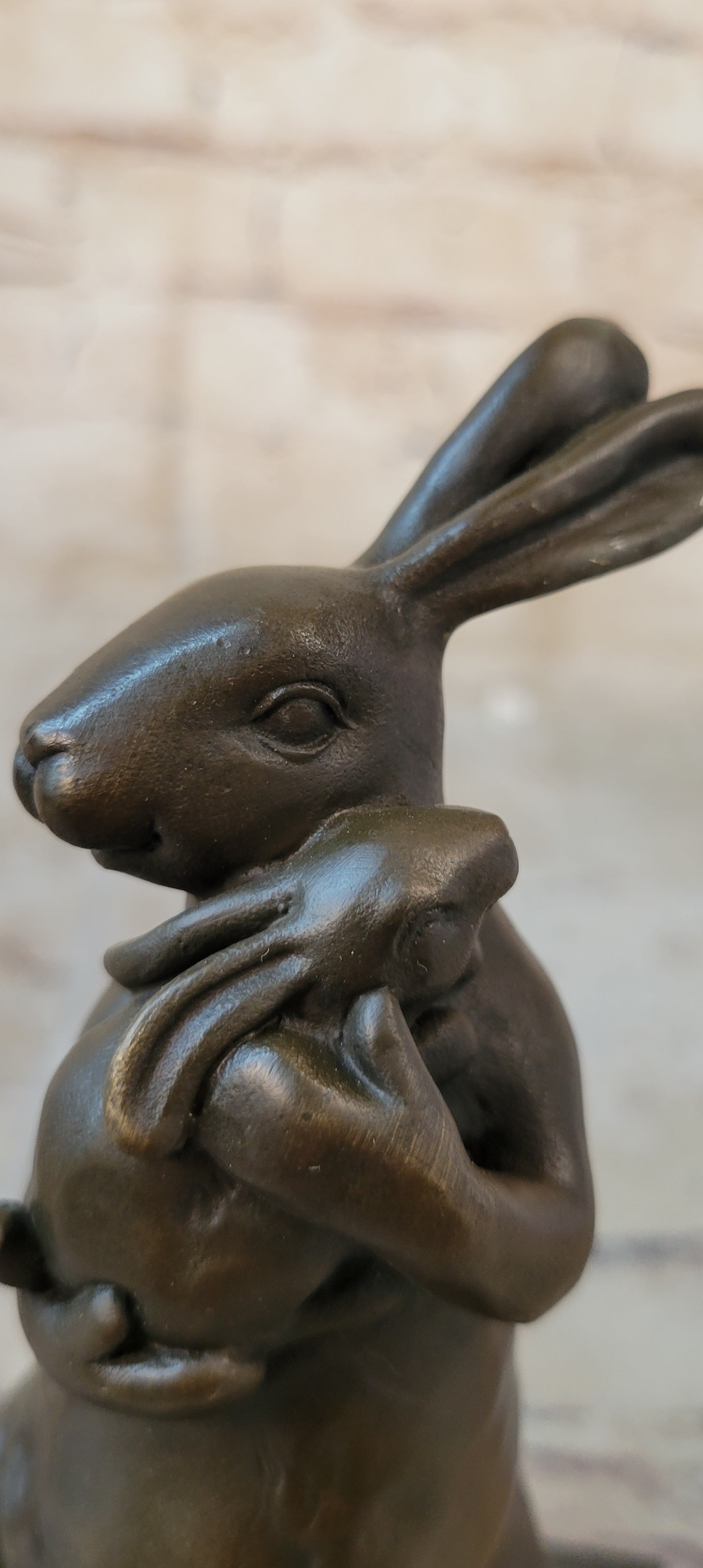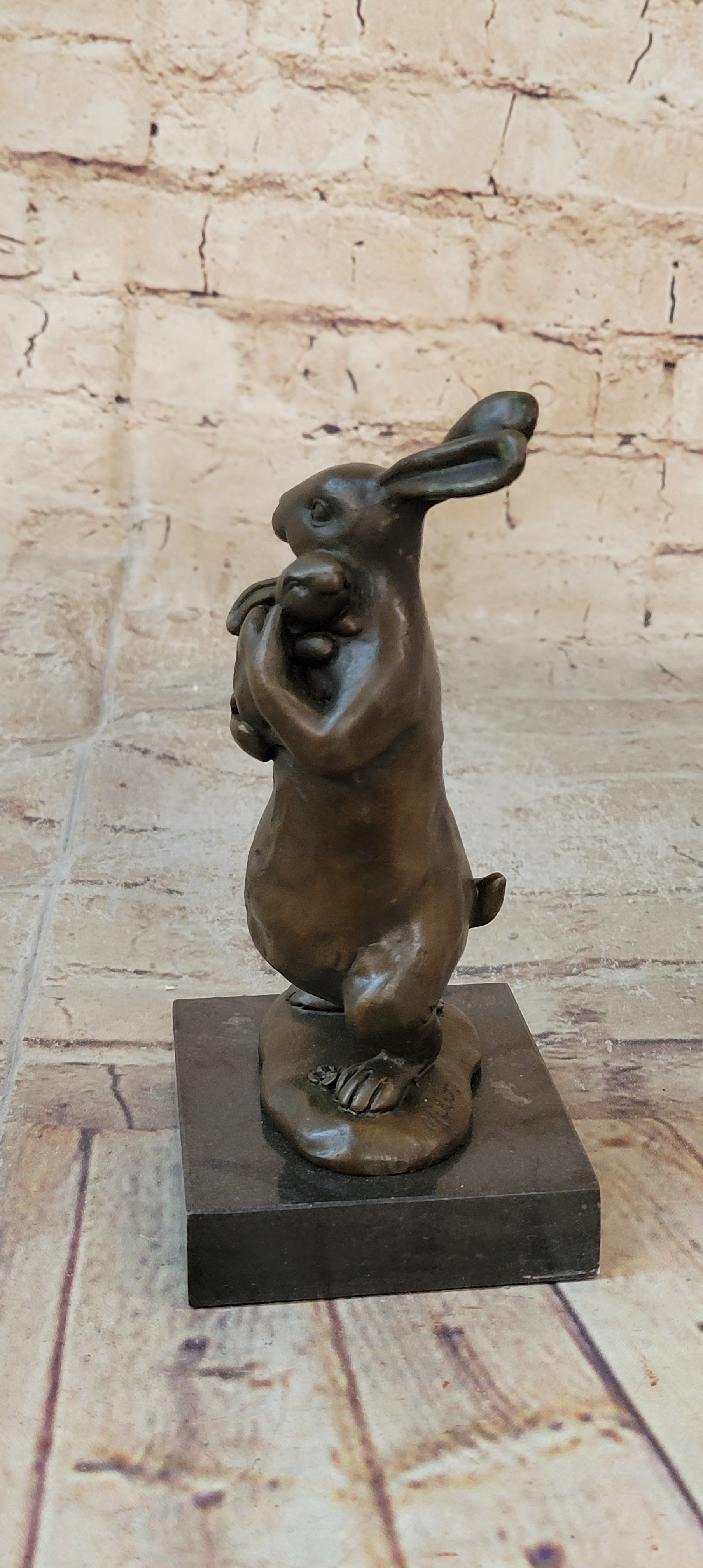 Celebrate the boundless love and innate nurturing instincts of the animal kingdom with our heartwarming bronze sculpture. This touching artwork captures the tender relationship between a mother rabbit and her baby bunny, showcasing the universal theme of parental care and affection. The mother rabbit stands on her hind legs, cradling her tiny offspring in a gentle embrace as she rocks him to sleep. The delicate details bring this scene to life, from the small, slumbering bunny to the caring expression on the mother's face.