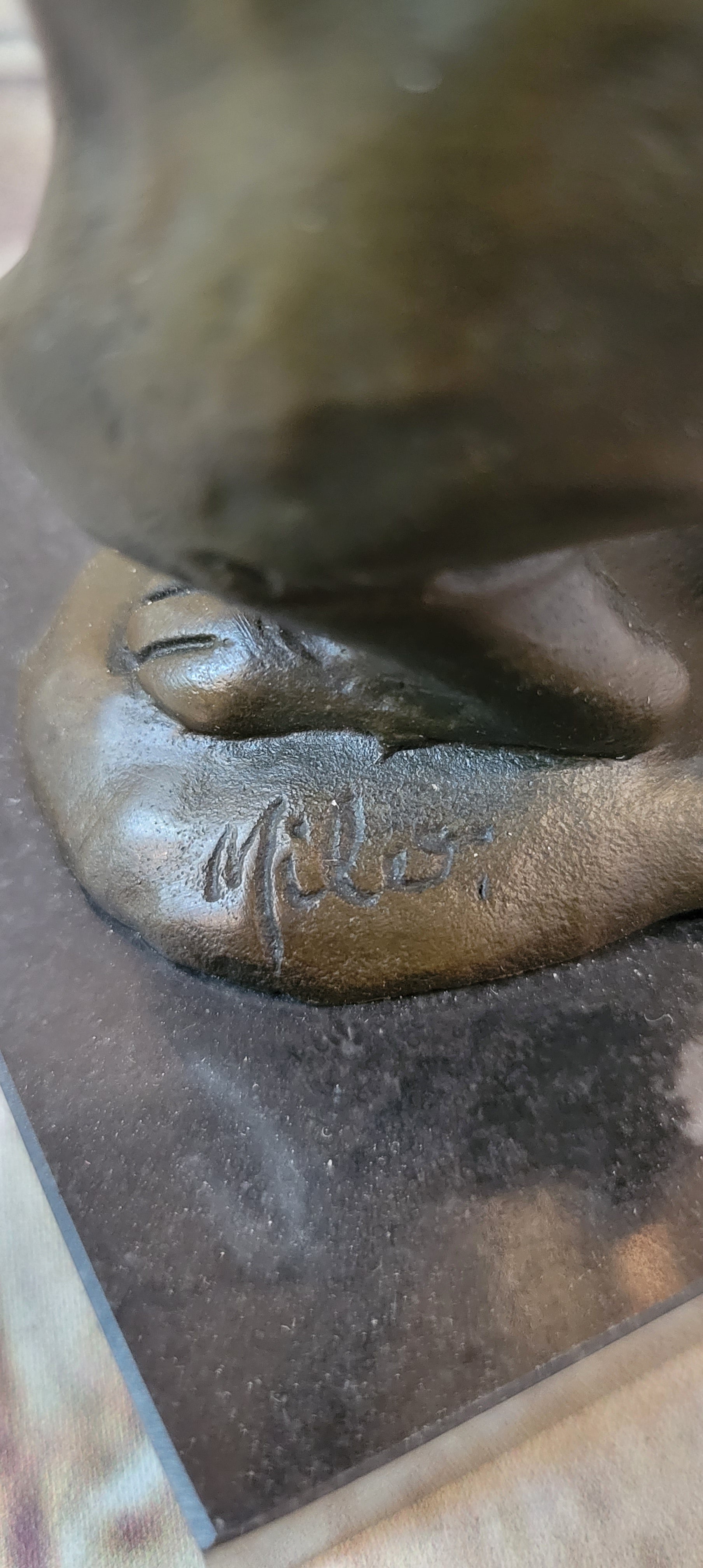 Adding to its value, the sculpture is signed by the acclaimed artist Milo, known for his exceptional creations that capture the essence of nature and emotion. Milo's unique blend of steel and bronze, honed through years of experience and artistic exploration, lends his works a distinctive texture and movement that is unmistakably his own. With this exquisite bronze sculpture, you invite the timeless bond of parent and child into your home, a poignant reminder of love's enduring power and nature's captivating beauty.Bronze Dimensions with Marble Base: Height 6.5" X Width 3 1/2"