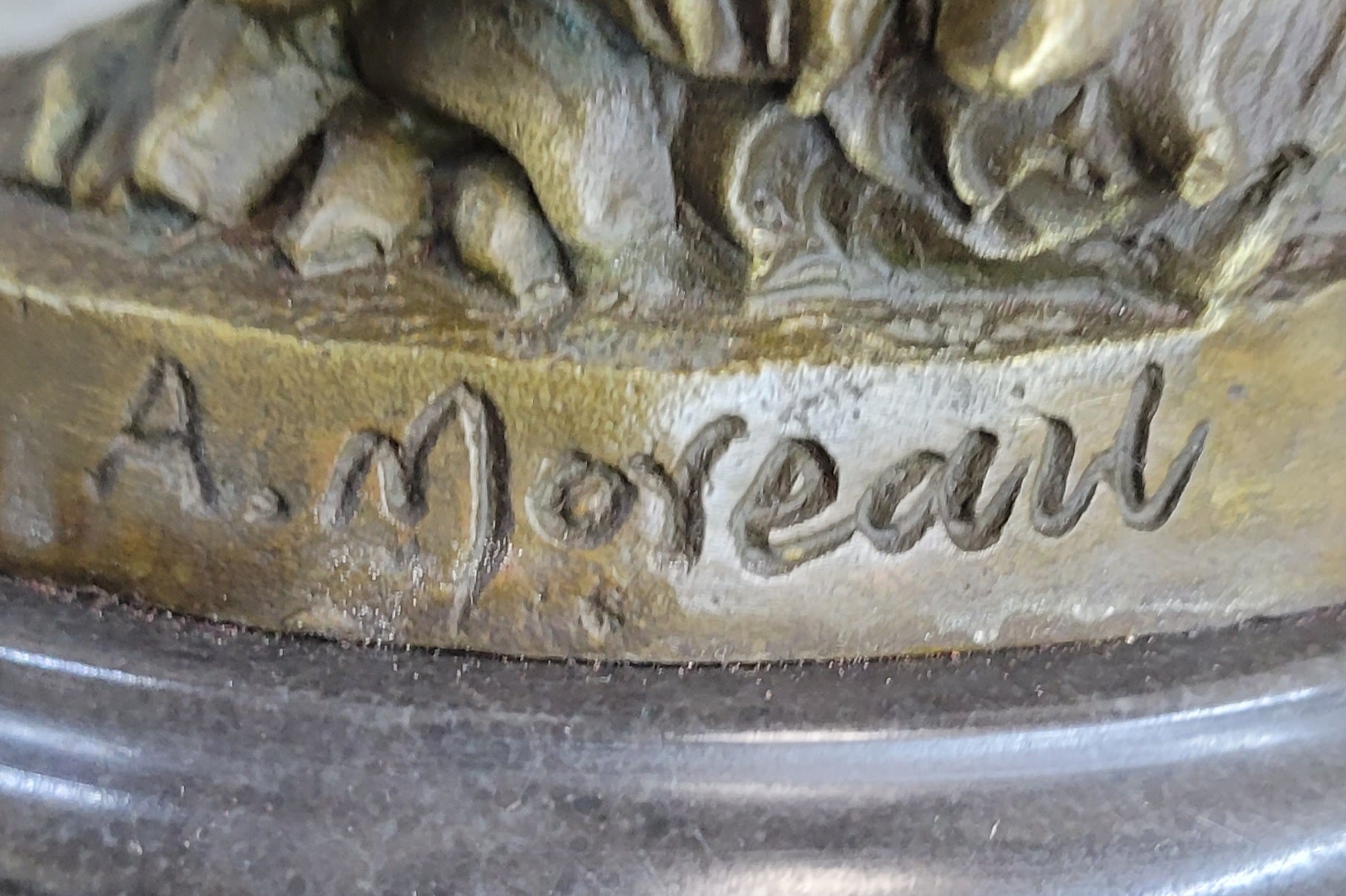 This exquisite bronze piece was handmade using the traditional lost wax casting method, ensuring exceptional detail and craftsmanship. A rich brown patina enhances the texture and depth of the form, while a solid black marble base provides contrast and stability. The piece is signed by the artist Moreau, marking it as a timeless work of art that reflects both charm and sophistication.Bronze Dimensions with Marble Base: Height 18" X Width 5 1/2"