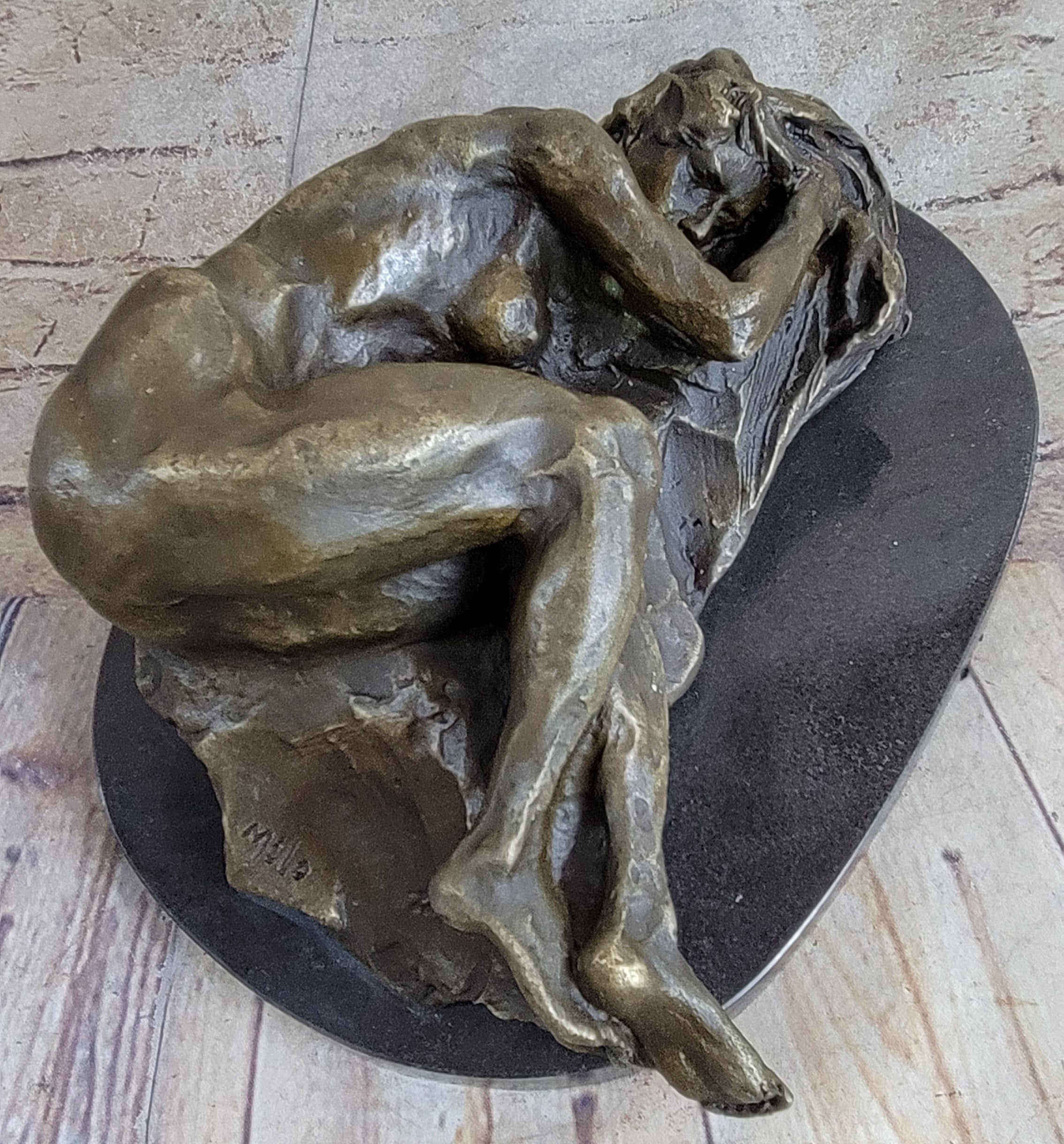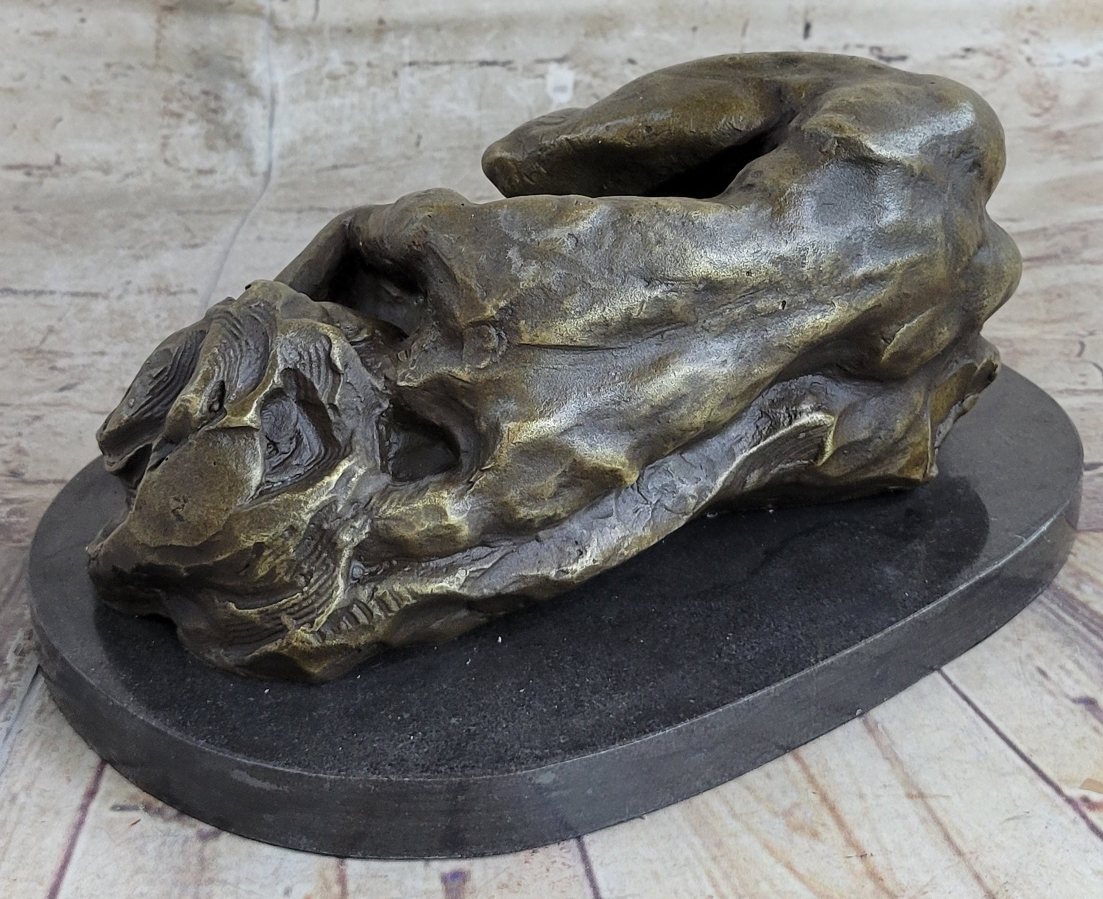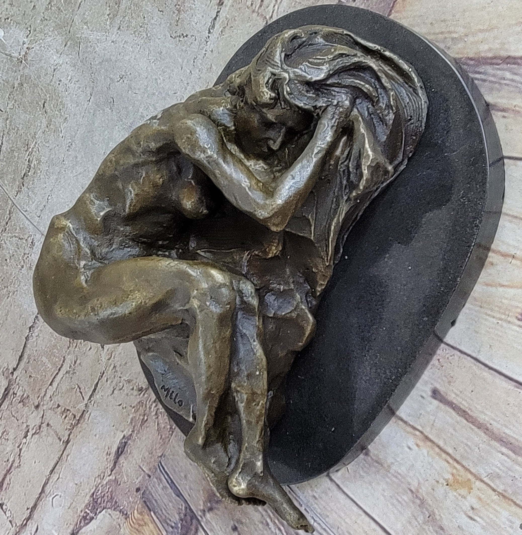 This handmade bronze sculpture was meticulously created using the time-honored lost-wax casting method, ensuring fine detail and craftsmanship throughout. The brown patina enriches the natural warmth of the bronze, lending a classic finish that enhances the piece’s allure. Mounted on a polished black marble base, the sculpture is signed by the acclaimed artist Milo, making it a striking addition to any fine art collection.Bronze Dimensions with Marble Base: Height 5" X Width 10 1/2"