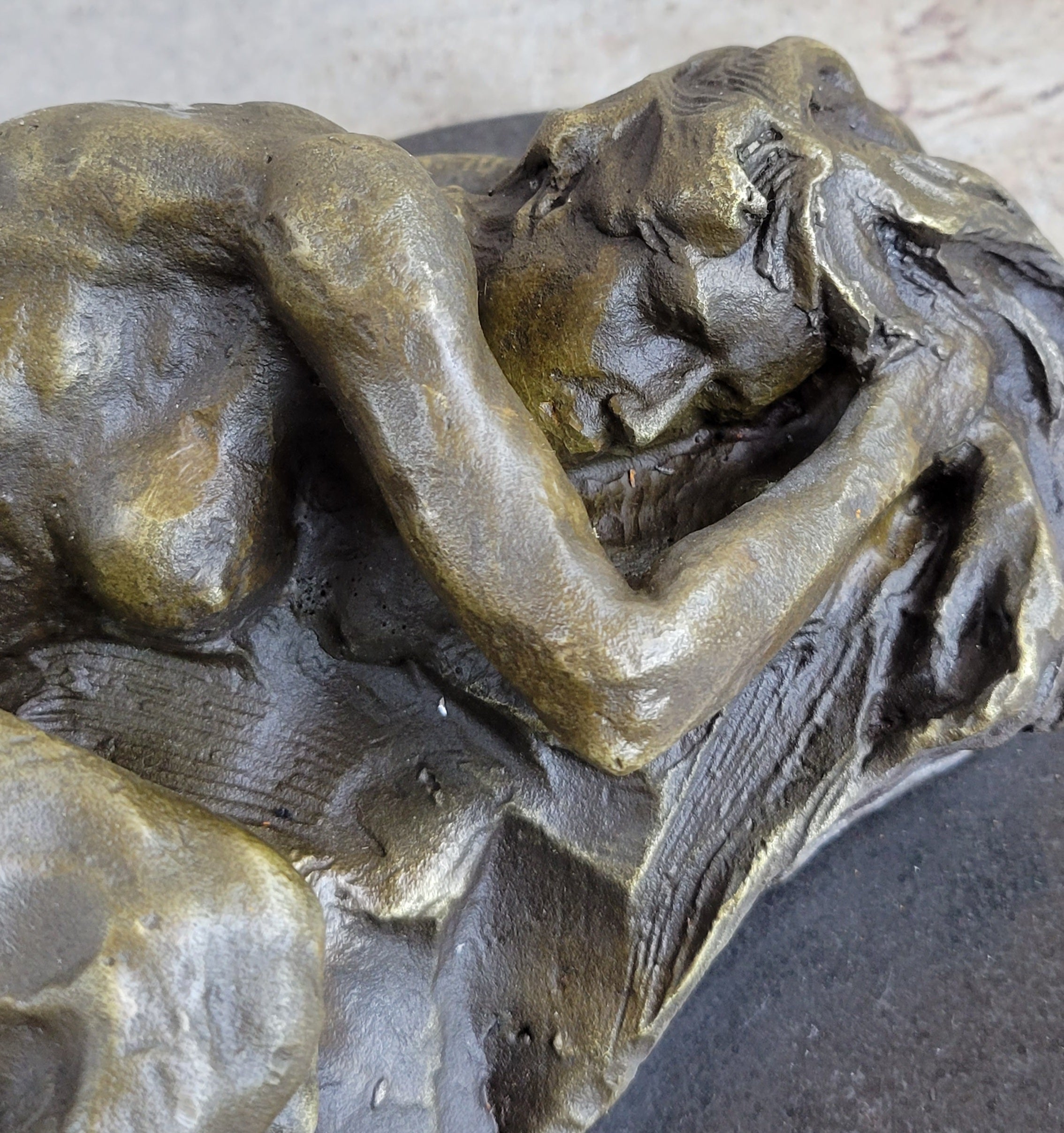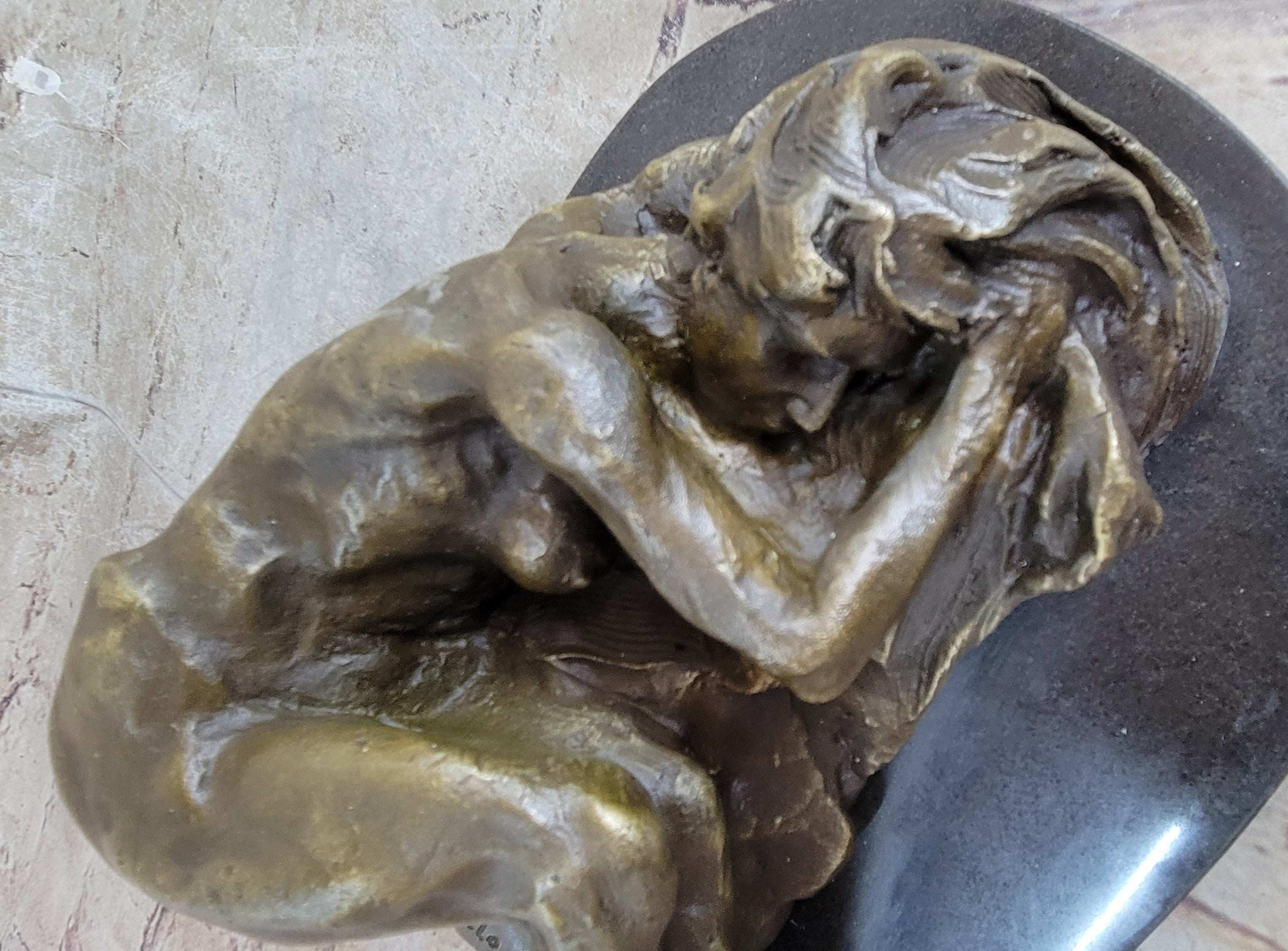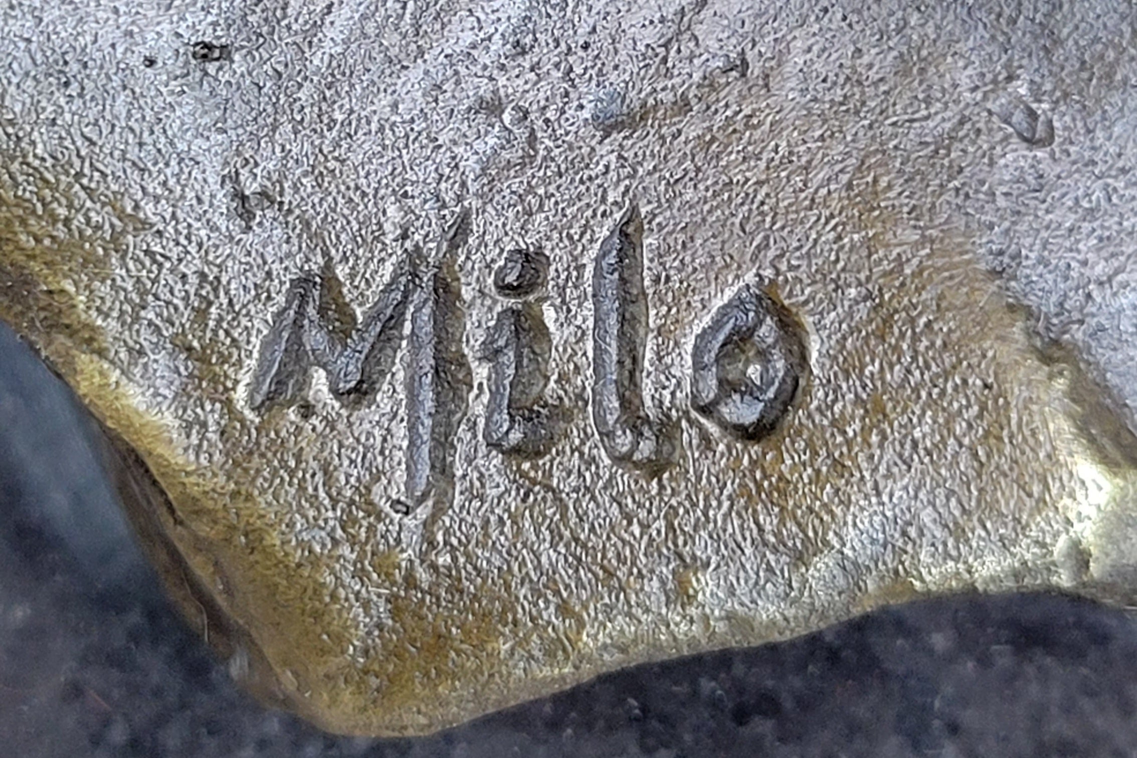 This handmade bronze sculpture was meticulously created using the time-honored lost-wax casting method, ensuring fine detail and craftsmanship throughout. The brown patina enriches the natural warmth of the bronze, lending a classic finish that enhances the piece’s allure. Mounted on a polished black marble base, the sculpture is signed by the acclaimed artist Milo, making it a striking addition to any fine art collection.Bronze Dimensions with Marble Base: Height 5" X Width 10 1/2"