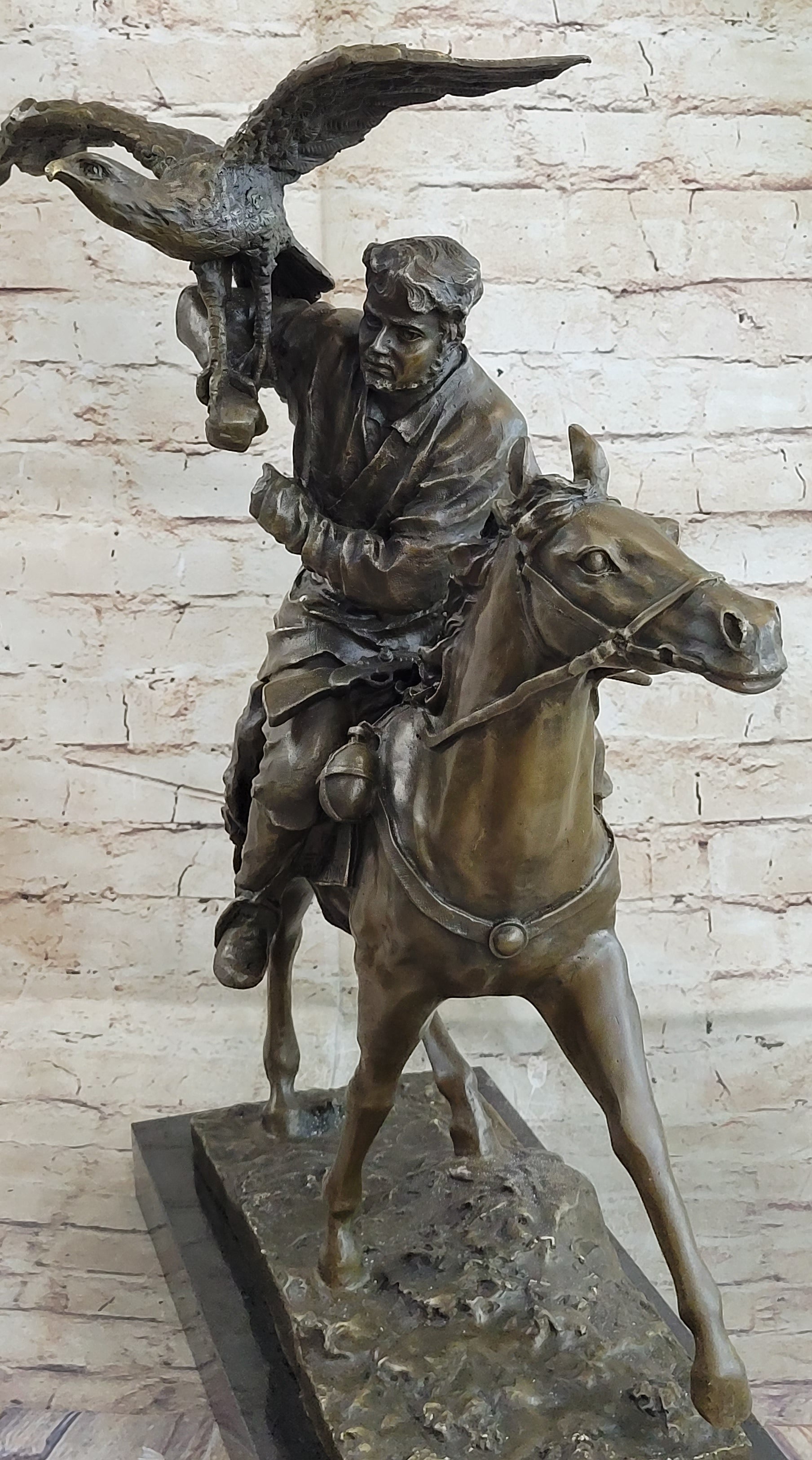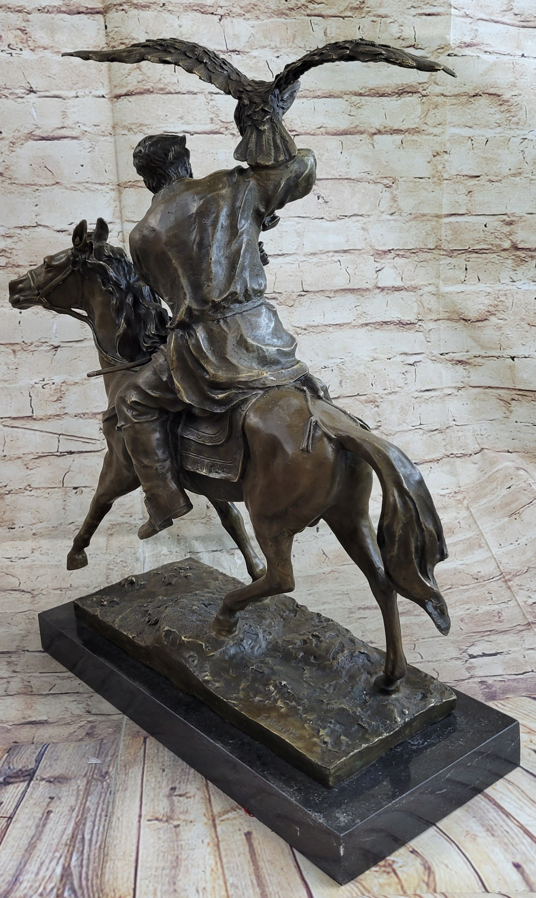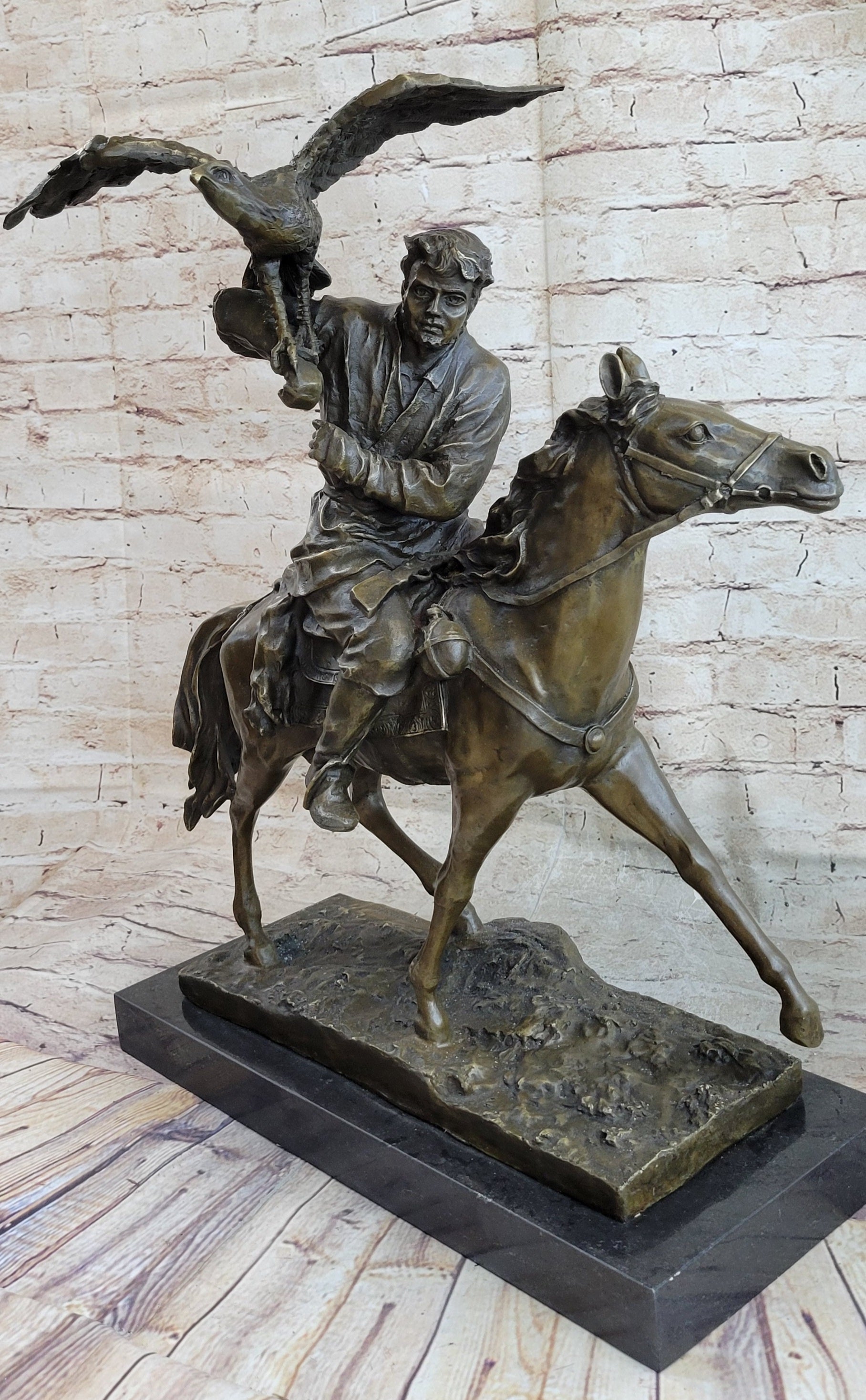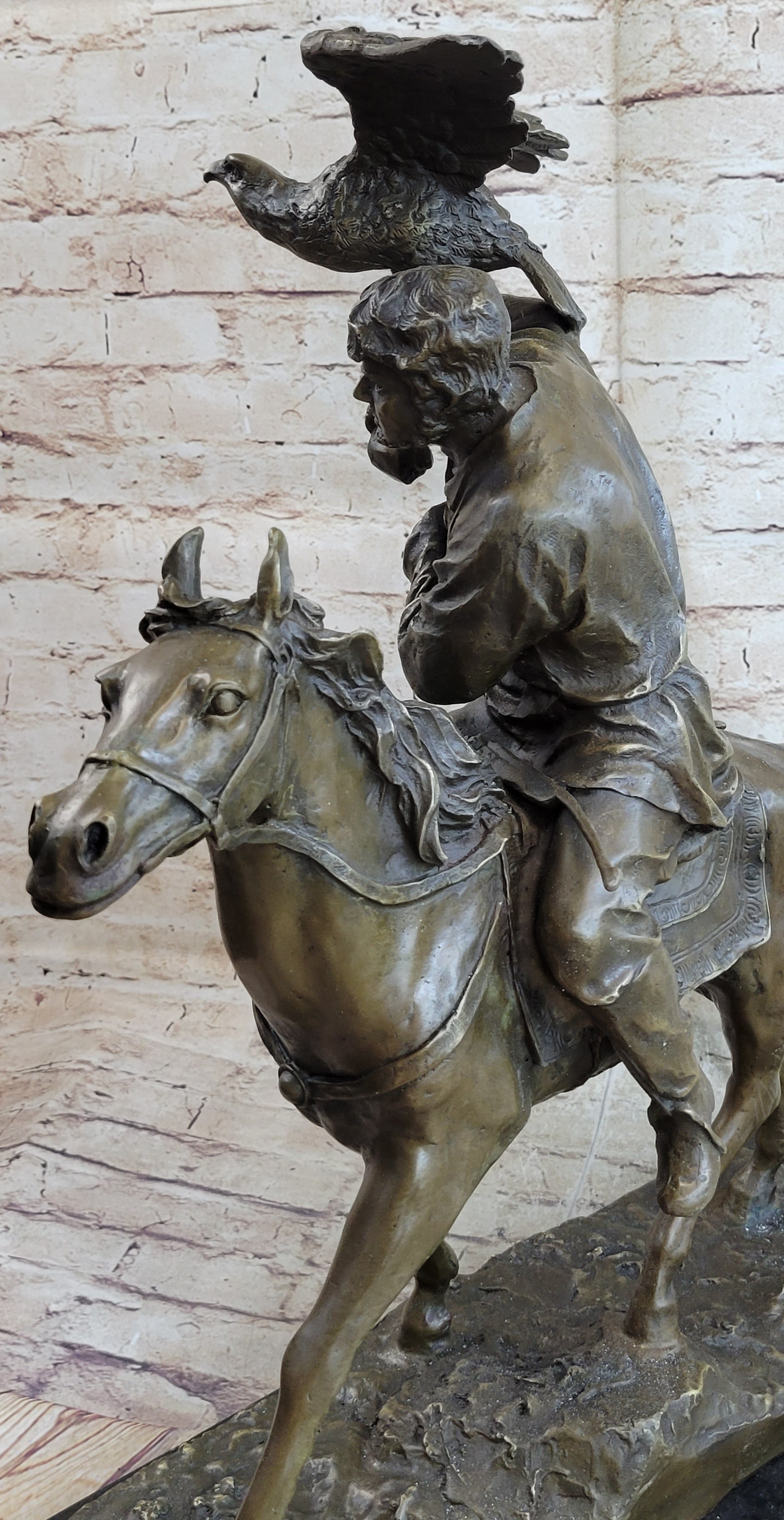 Horse Mounted Khazak Eagle Falcon Hunter Trained Bird Bronze Statue Sculpture Figure 21" x 21"