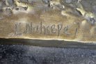 Mounted on a sleek black marble base, the sculpture stands as a striking representation of the harmonious connection between man, horse, and eagle. The brown patina finish adds warmth and depth to the artwork, underscoring the rugged beauty of the wild. Signed by the artist E. Nahcepe, this sculpture not only captures a fleeting moment in the wild but also serves as a tangible expression of the delicate balance between the hunter and the hunted, guided by the watchful eye of a majestic eagle.Bronze Dimensions with Marble Base: Height 21" X Width 21"