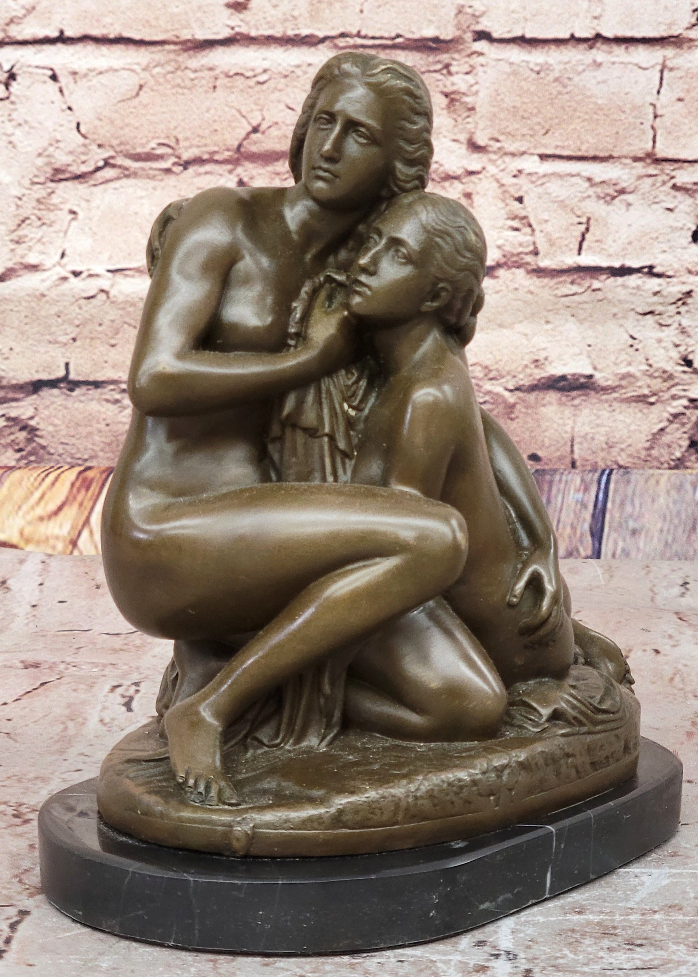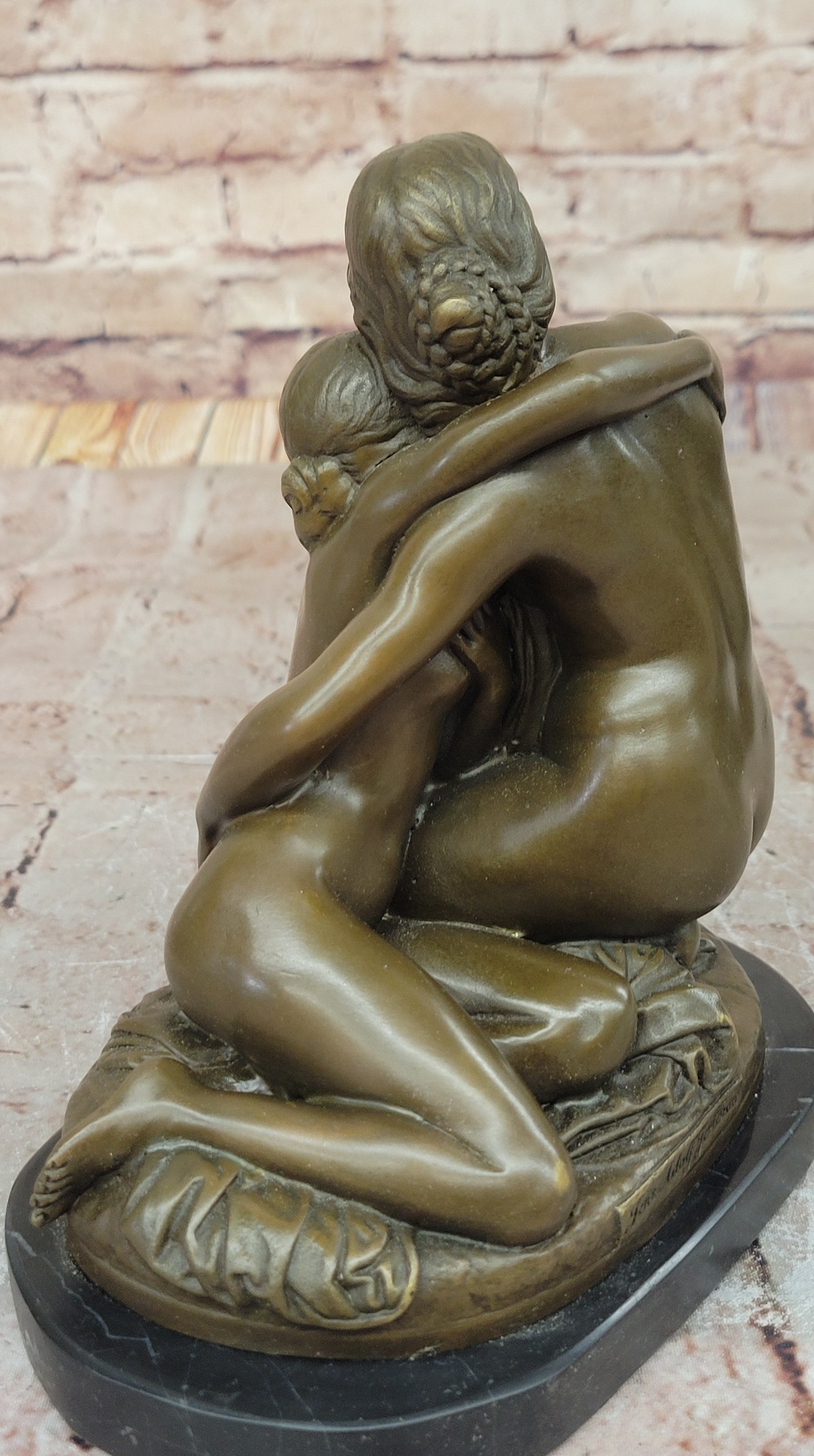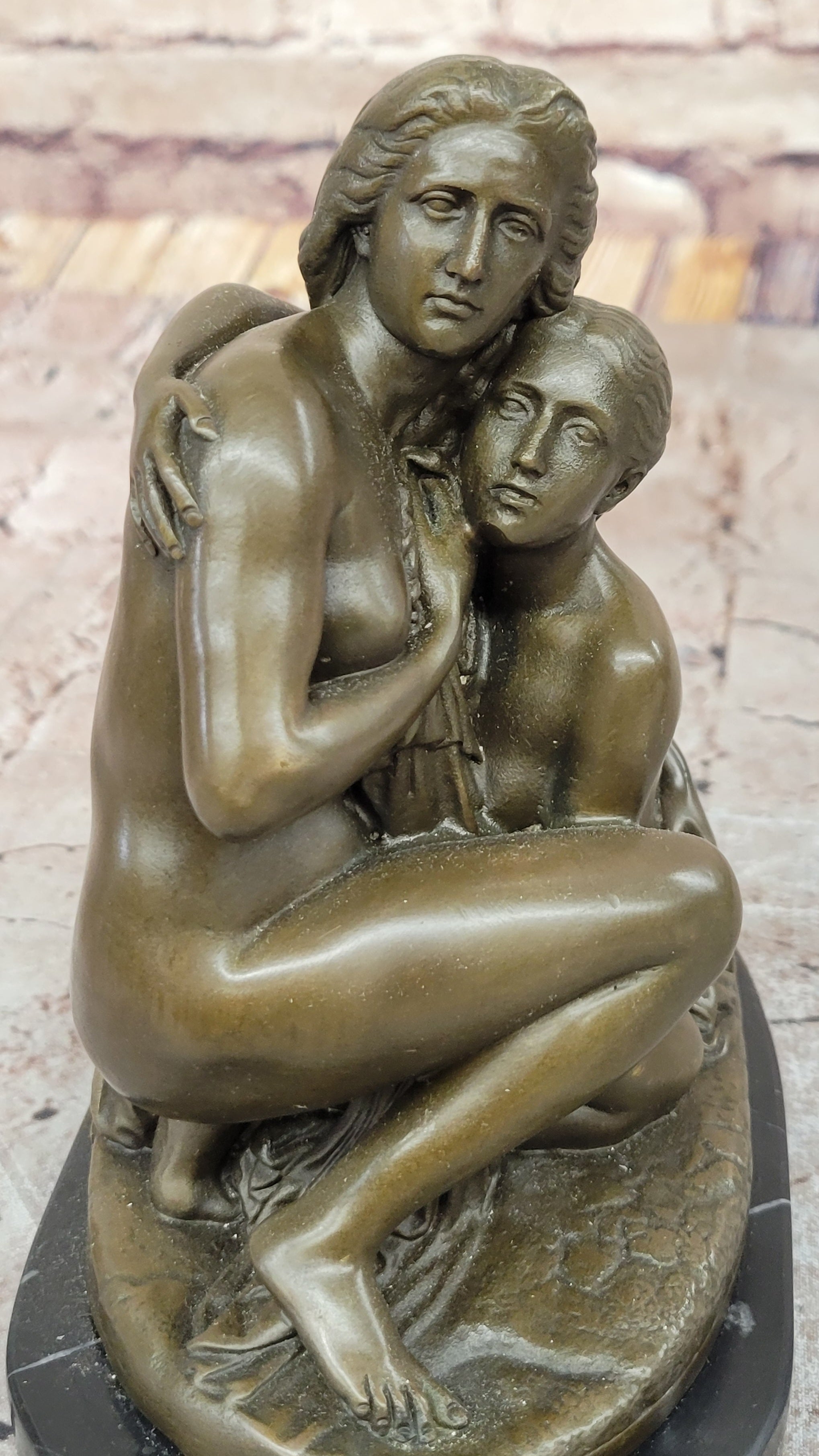 Resting on an oval black marble base, this sculpture offers both stability and a refined contrast to the warm tones of the bronze. A perfect addition to any home, office, or art collection, this handmade sculpture serves as a touching tribute to the beauty of maternal love and makes a thoughtful gift for mothers, collectors, or admirers of fine art.Bronze Dimensions with Marble Base:8" X Width 7"