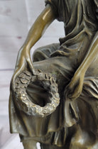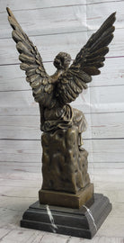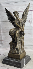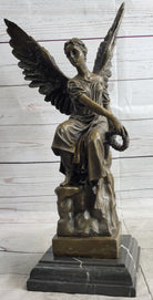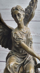 Bronze Statue of Seated Angel Holding Wreath Sculpture on Marble Base 17" x 9"