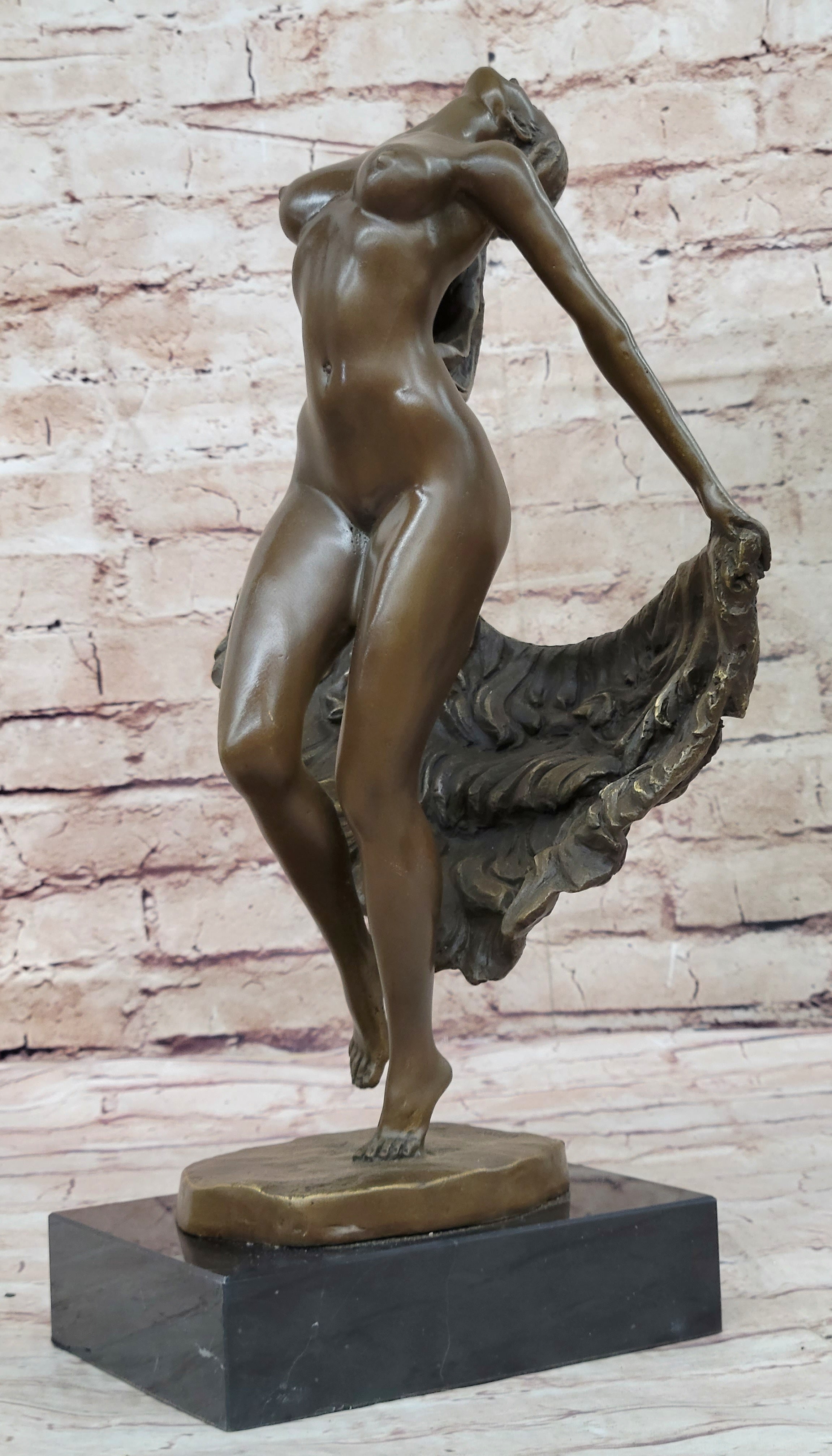 Celebrate the beauty of the female form in motion with this stunning bronze sculpture of a sensuous dancer leaping into the air. With grace and elegance, she twirls and leaps, and a flowing fabric banner wraps itself around her body, adding a dynamic touch to the artwork. The sculpture captures the essence of movement and joy, embodying the spirit of freedom and boundless expression.