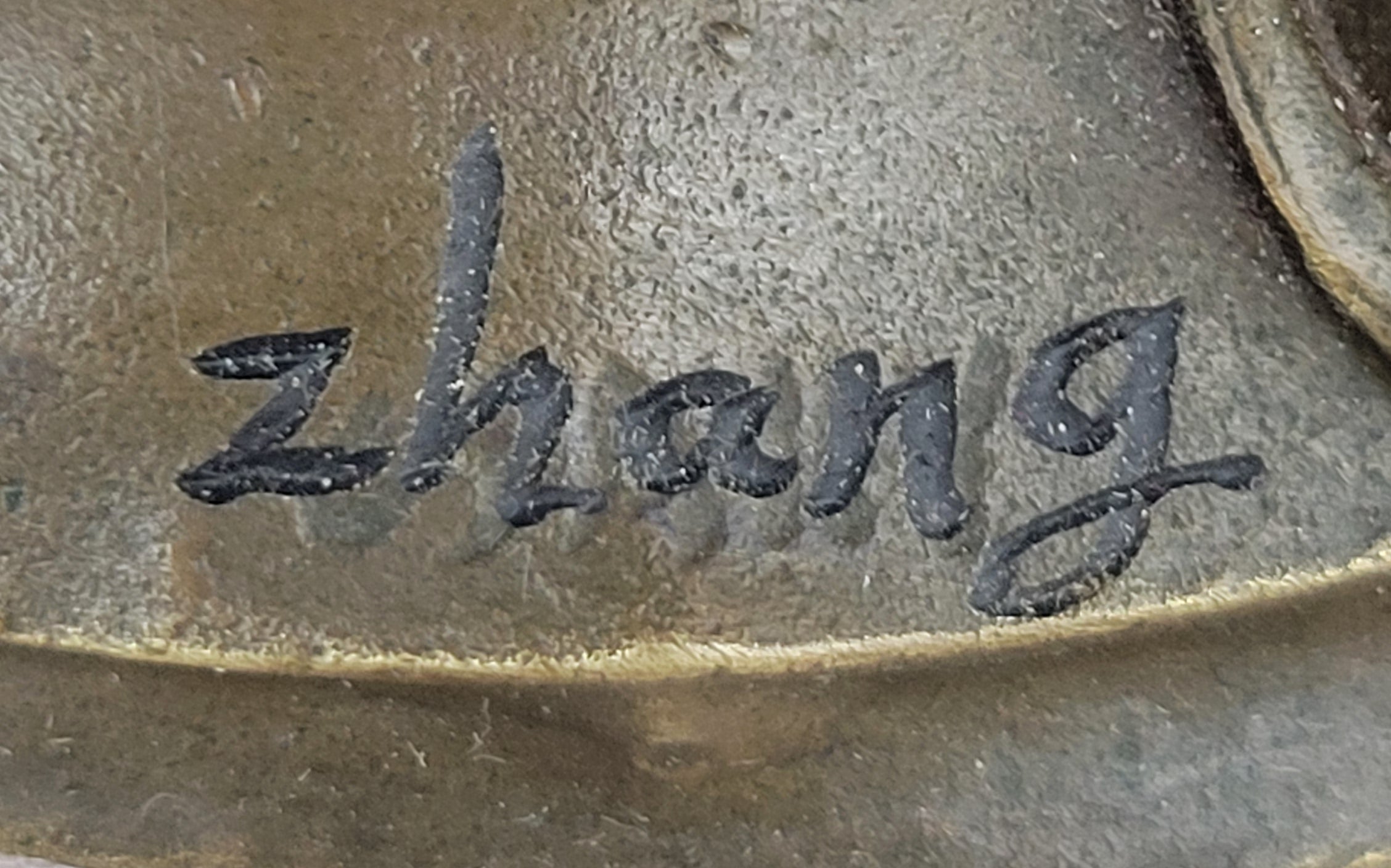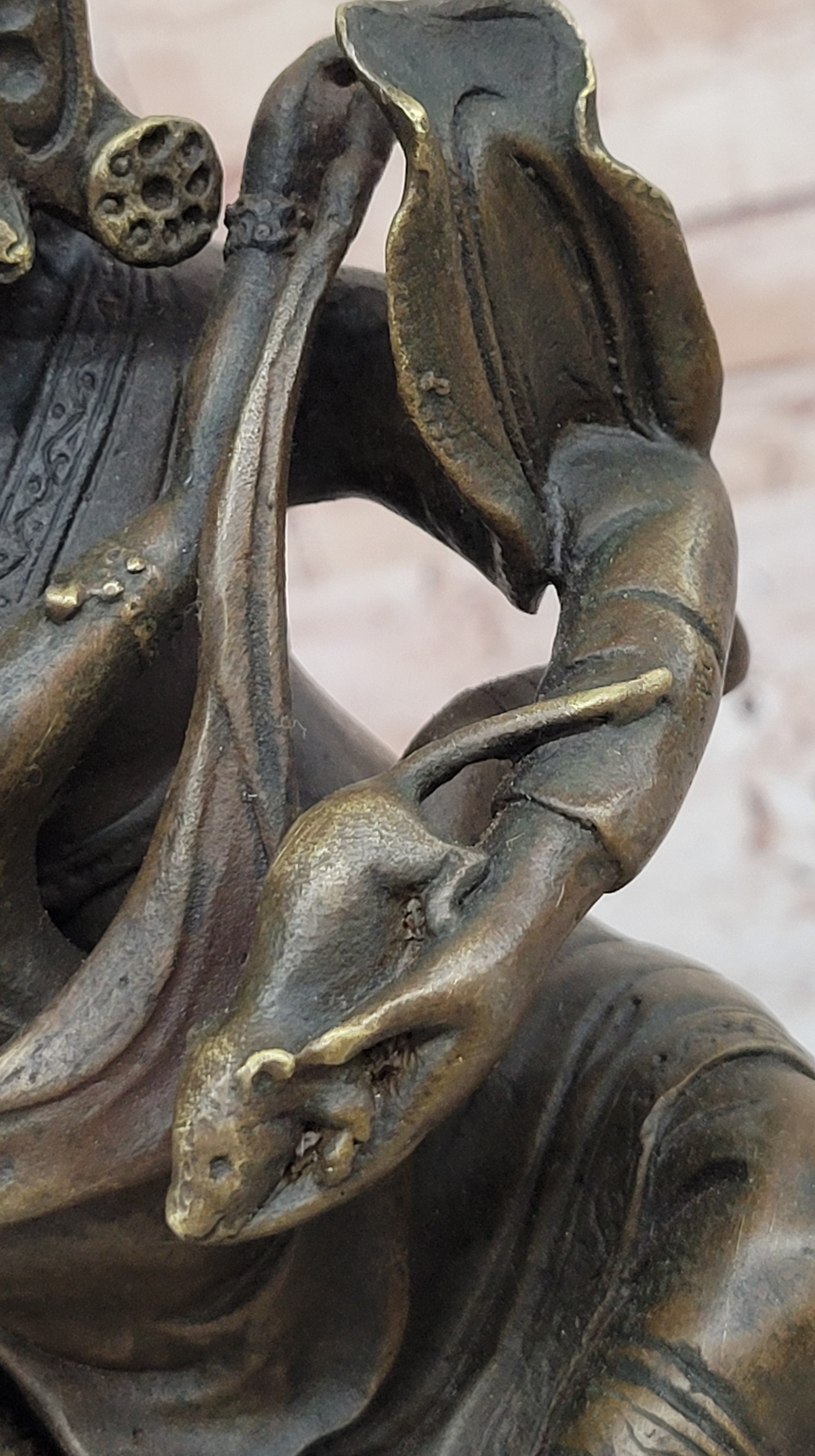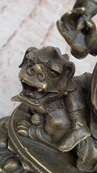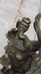 This vintage Tibetan bronze sculpture features a striking depiction of Buddha seated atop a Foo Dog, symbolizing spiritual strength, protection, and wisdom. The Buddha figure, portrayed in a serene and meditative pose, embodies enlightenment and inner peace, while the Foo Dog—a mythical guardian creature—adds a powerful dynamic of protection and vigilance. Together, they create a harmonious representation of divine presence and strength rooted in Tibetan tradition. Handcrafted using the ancient lost wax casting method, this statue is made from genuine bronze and finished with a rich brown patina that highlights its intricate details. From the flowing robes of the Buddha to the textured mane and fierce expression of the Foo Dog, each element is finely sculpted, showcasing the artisan’s dedication to craftsmanship and cultural reverence. The statue carries a timeless, sacred quality, making it a meaningful addition to any spiritual or artistic collection. Ideal for home altars, meditation spaces, or as a unique piece of décor, this sculpture exudes both tranquility and authority. It serves not only as a beautiful work of art but also as a spiritual symbol, offering protection and peace to the space it inhabits. This vintage bronze piece is perfect for collectors of Eastern art, spiritual artifacts, or those drawn to the profound symbolism of Tibetan Buddhist culture.