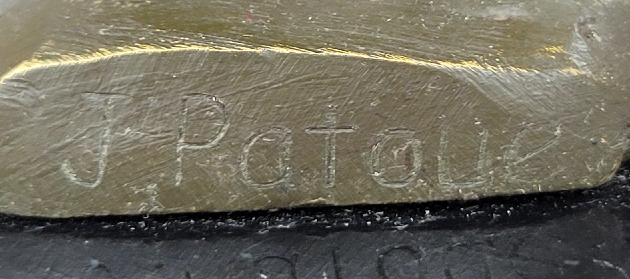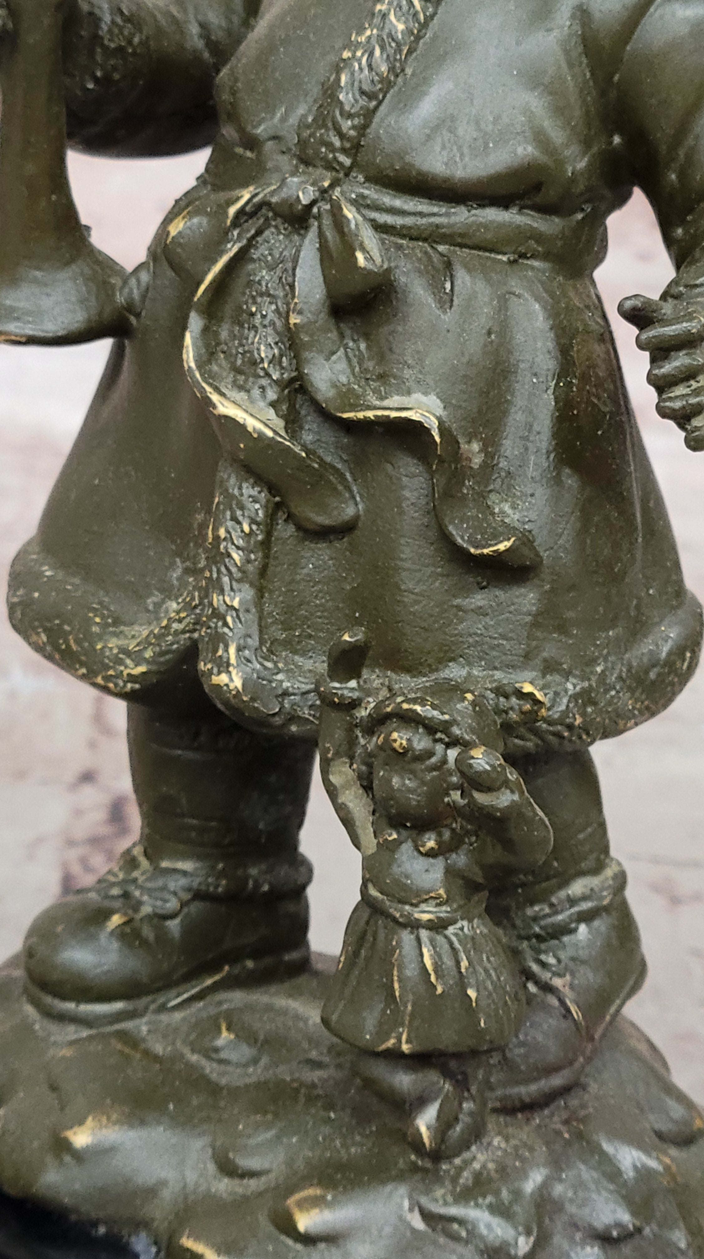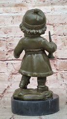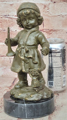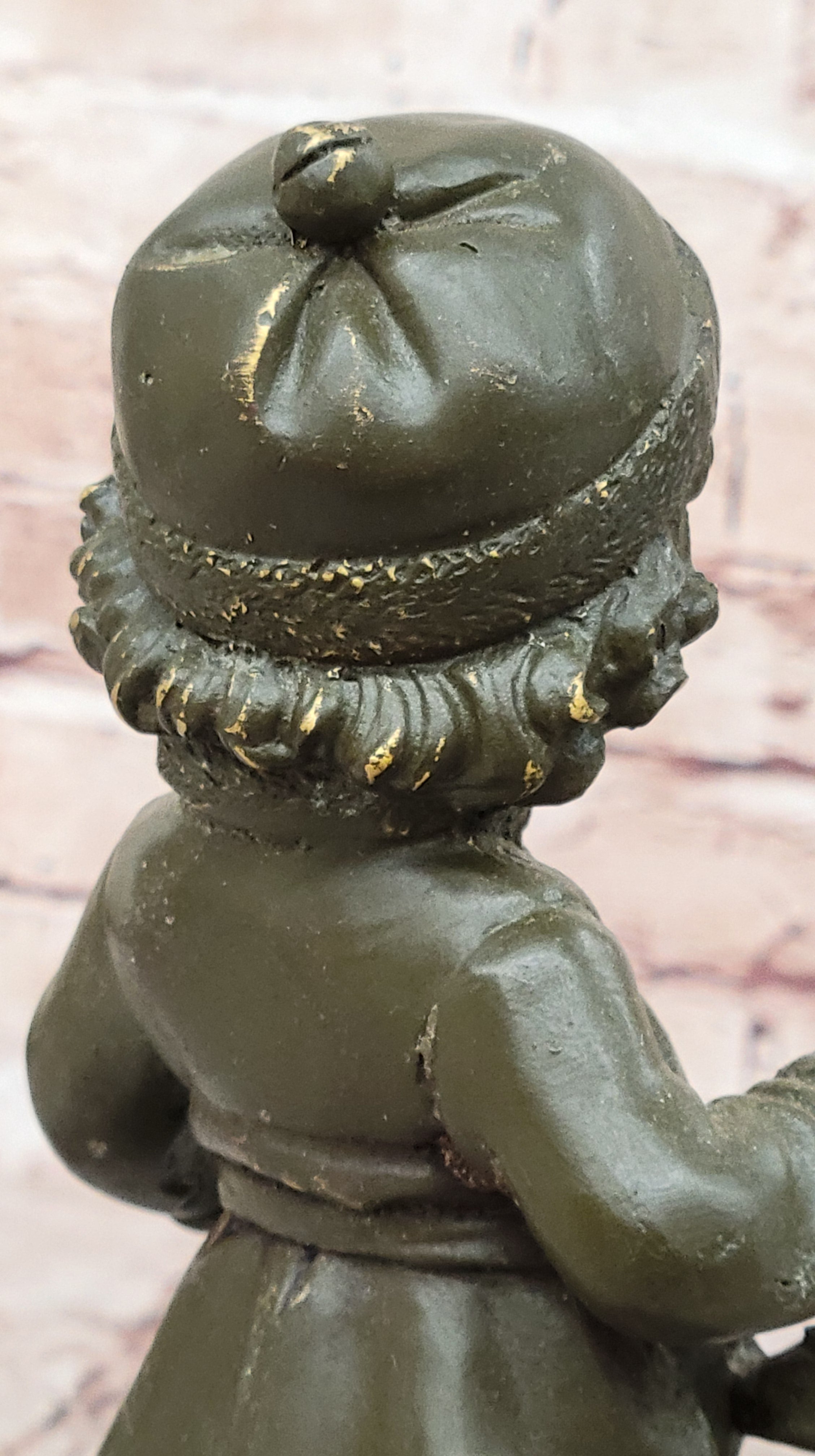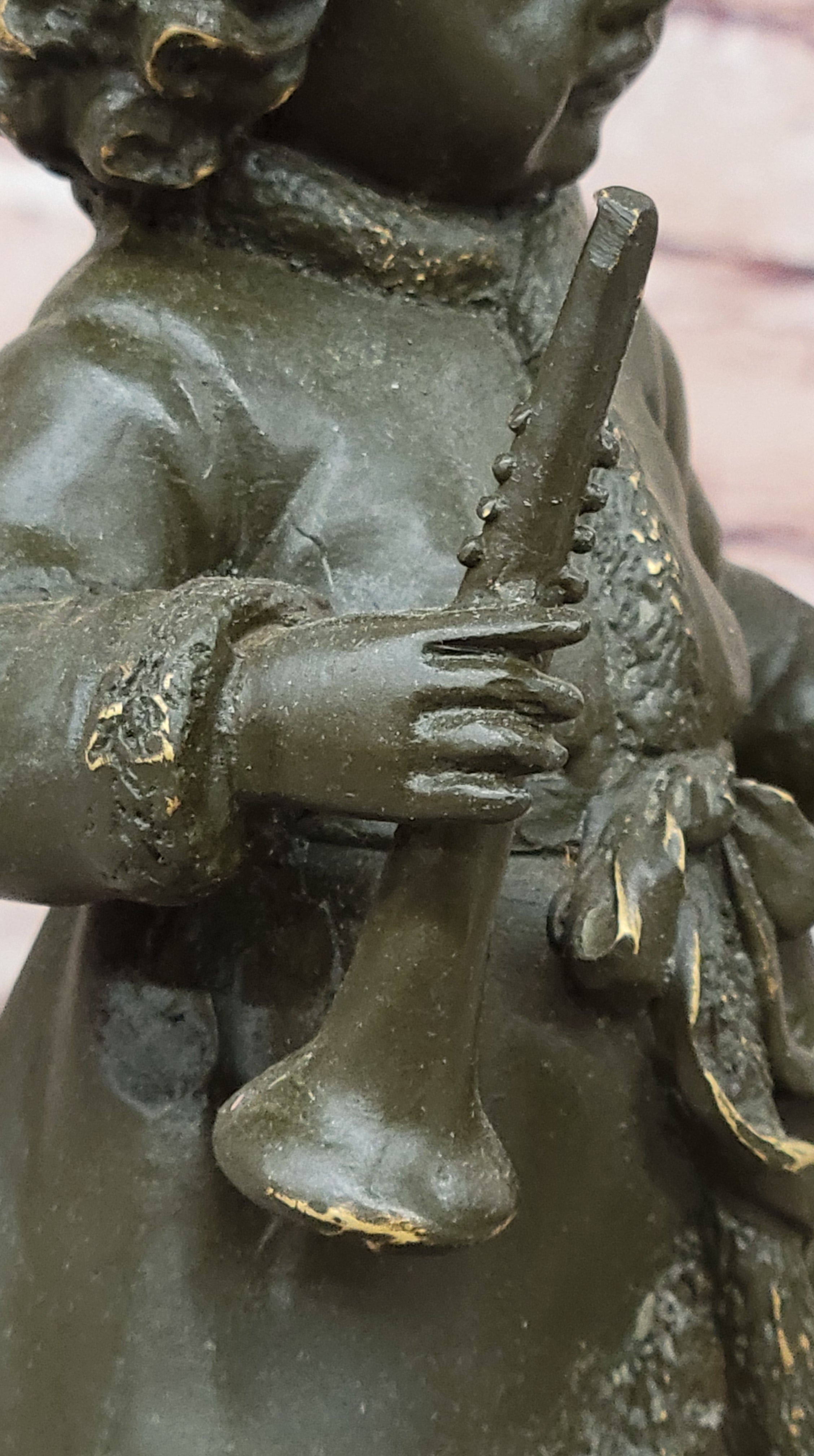 This delightful bronze sculpture portrays a young musician girl warmly dressed in a snow hat, joyfully playing a horn. Capturing a whimsical and heartwarming moment, the artwork evokes the charm of a winter serenade and the purity of youthful expression. Her posture and facial features are filled with life and innocence, bringing a touch of seasonal cheer and nostalgic melody to any space. Handmade using the traditional lost wax method, this sculpture is hot cast in genuine bronze and finished with a rich brown patina that enhances its depth and detail. From the texture of her cozy snow hat to the precise shape of the horn and the folds in her clothing, every element reflects the skilled craftsmanship of the artist. The piece is signed by renowned French sculptor Jean Patoue, ensuring its authenticity and artistic value. Set on a round black marble base, this collectible sculpture blends elegance and warmth, making it an ideal addition to home décor, music rooms, or curated art collections. Whether displayed on a shelf, mantel, or desk, it serves as a celebration of childhood, wintertime, and the timeless joy of music.