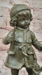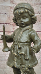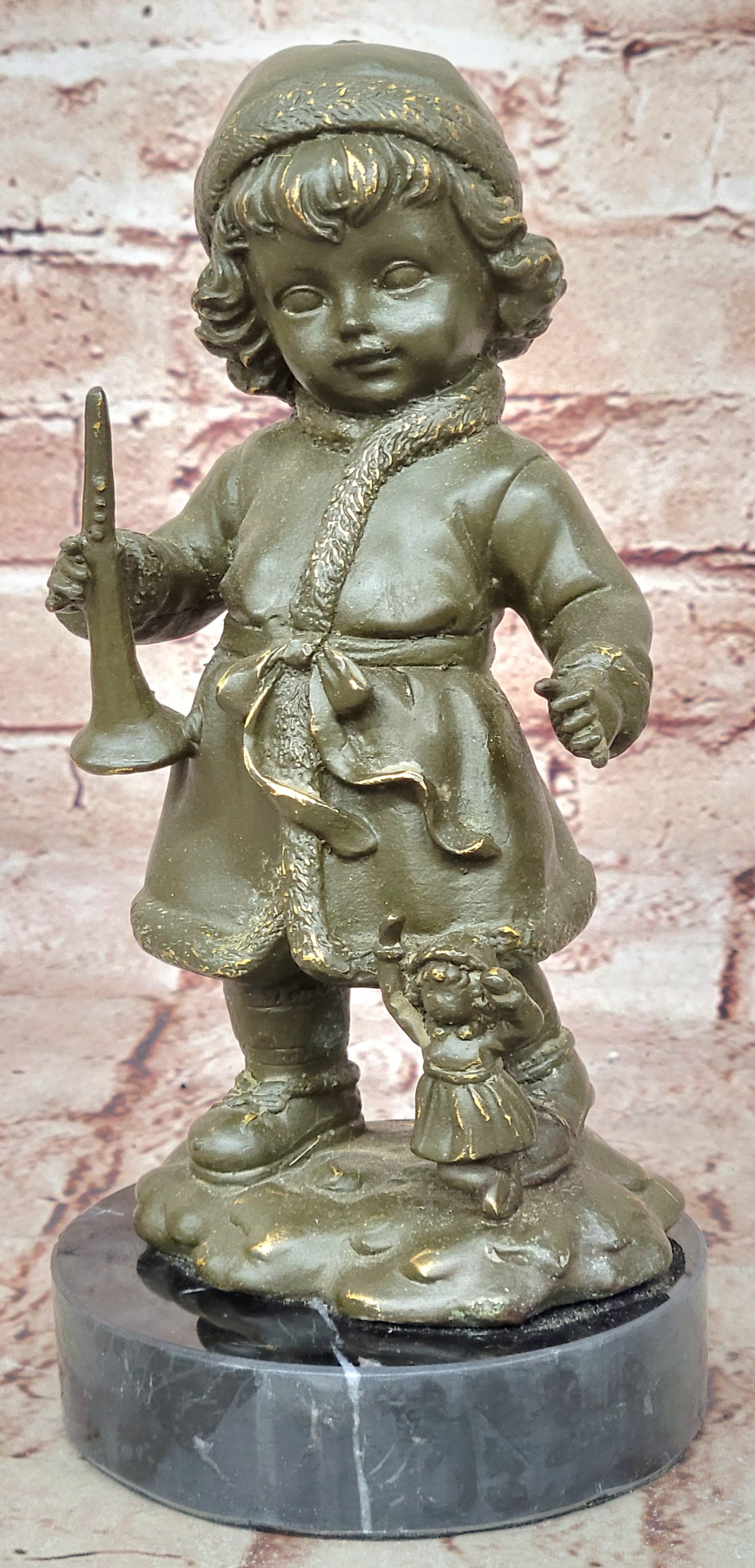 Bronze Winter Child Sculpture – Girl with Horn and Doll Figurine on Base