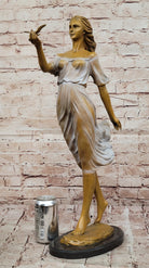This exquisite bronze sculpture captures the elegance of a lady standing gracefully while holding a bird, symbolizing freedom and harmony with nature. Crafted using the traditional lost wax method, this piece exhibits exceptional detail, from the delicate folds of her see-through dress to the gentle posture of her hands. The artistry in the sculpture emphasizes fluidity and movement, making it a visually captivating work of art.