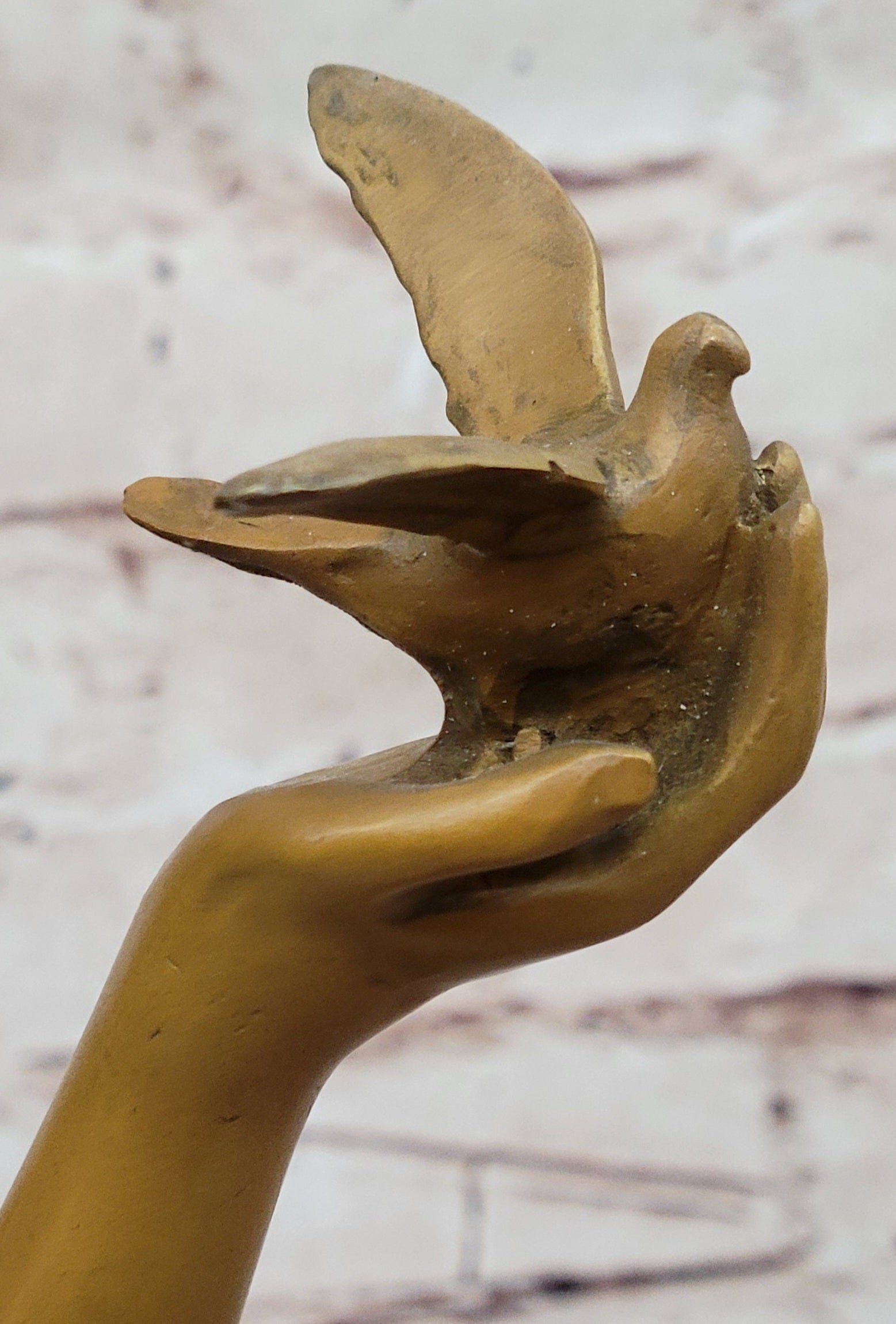 Mounted on a polished black marble base, this sculpture is both sturdy and sophisticated, making it an ideal addition to any art collection. Whether as a centerpiece or a conversation piece, this bronze lady with a bird embodies grace, tranquility, and artistic mastery.Bronze Dimensions with Marble Base: Height 24" x Width 11"