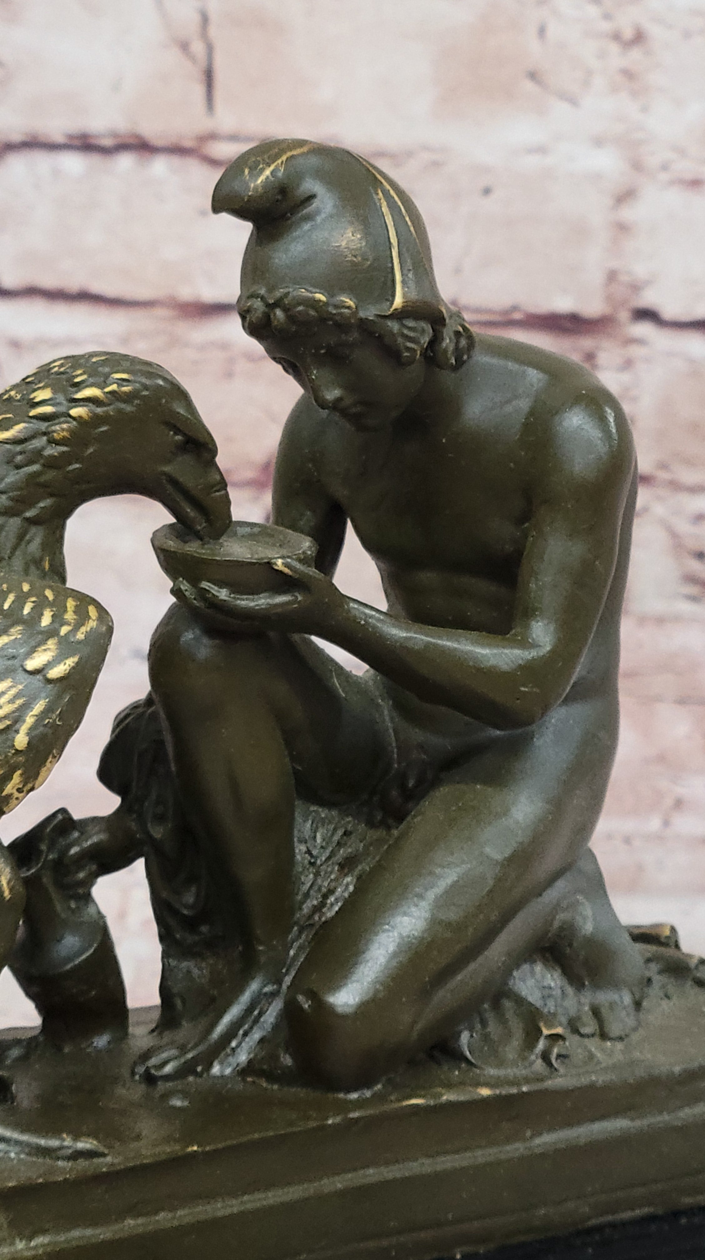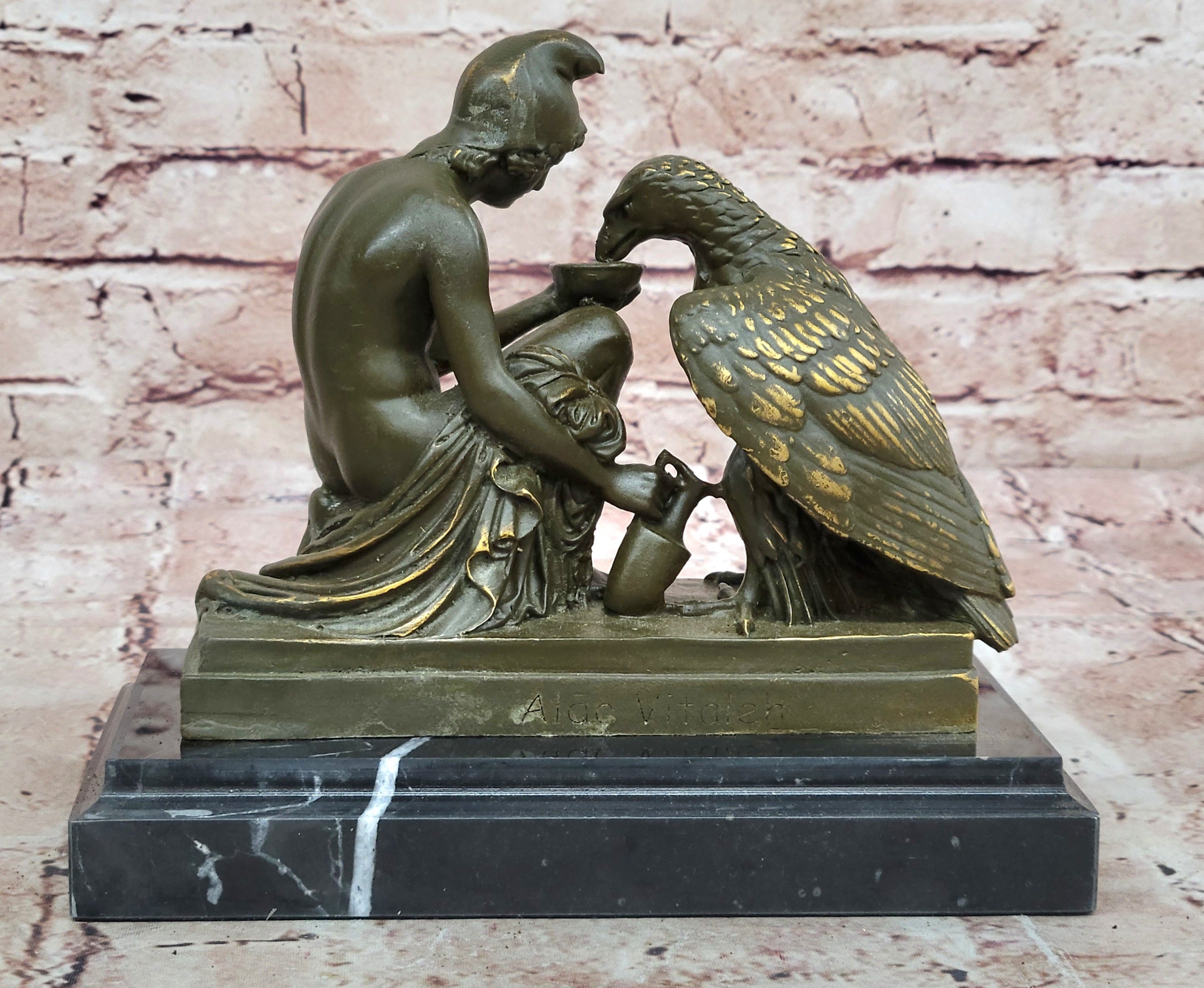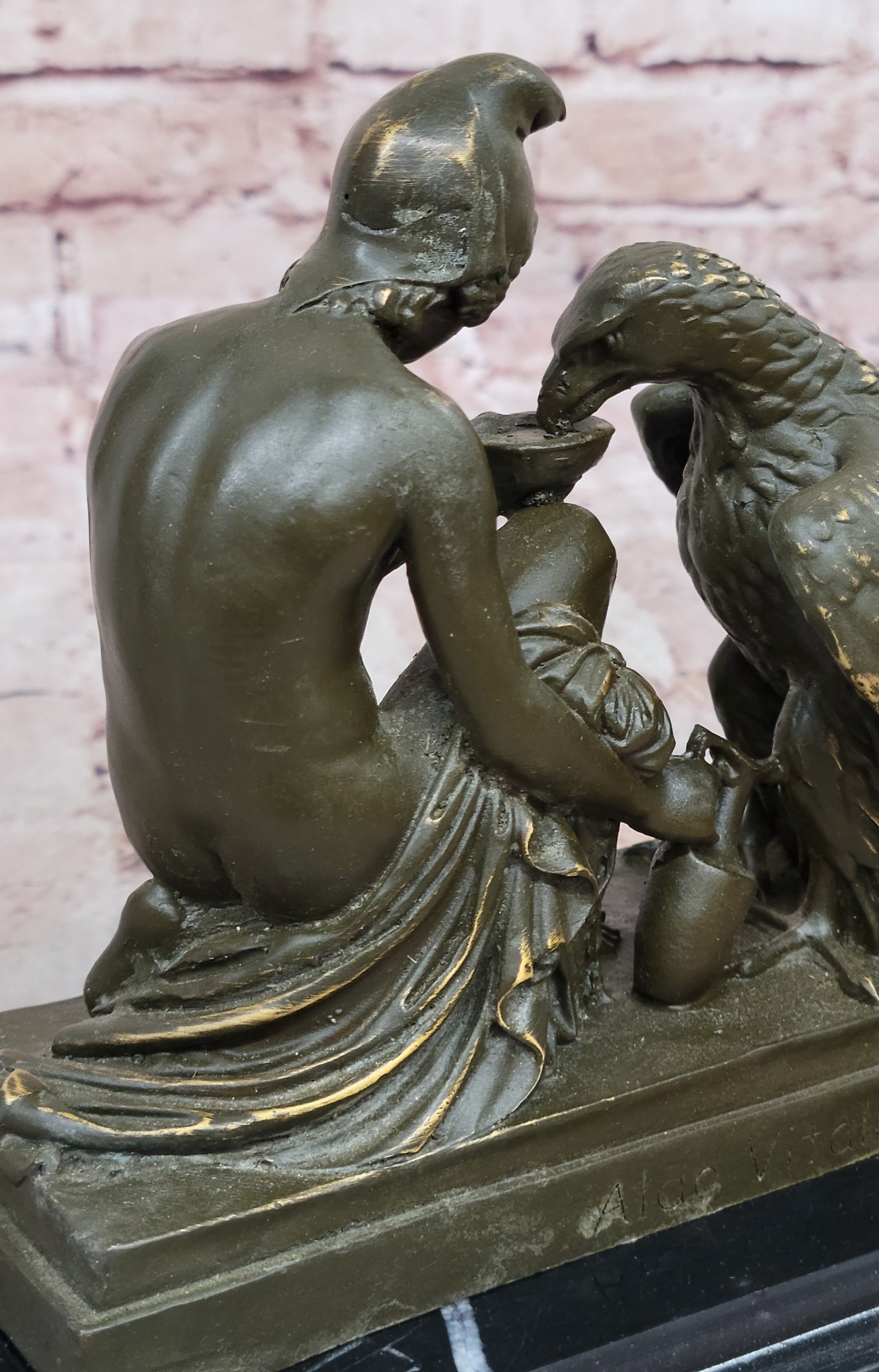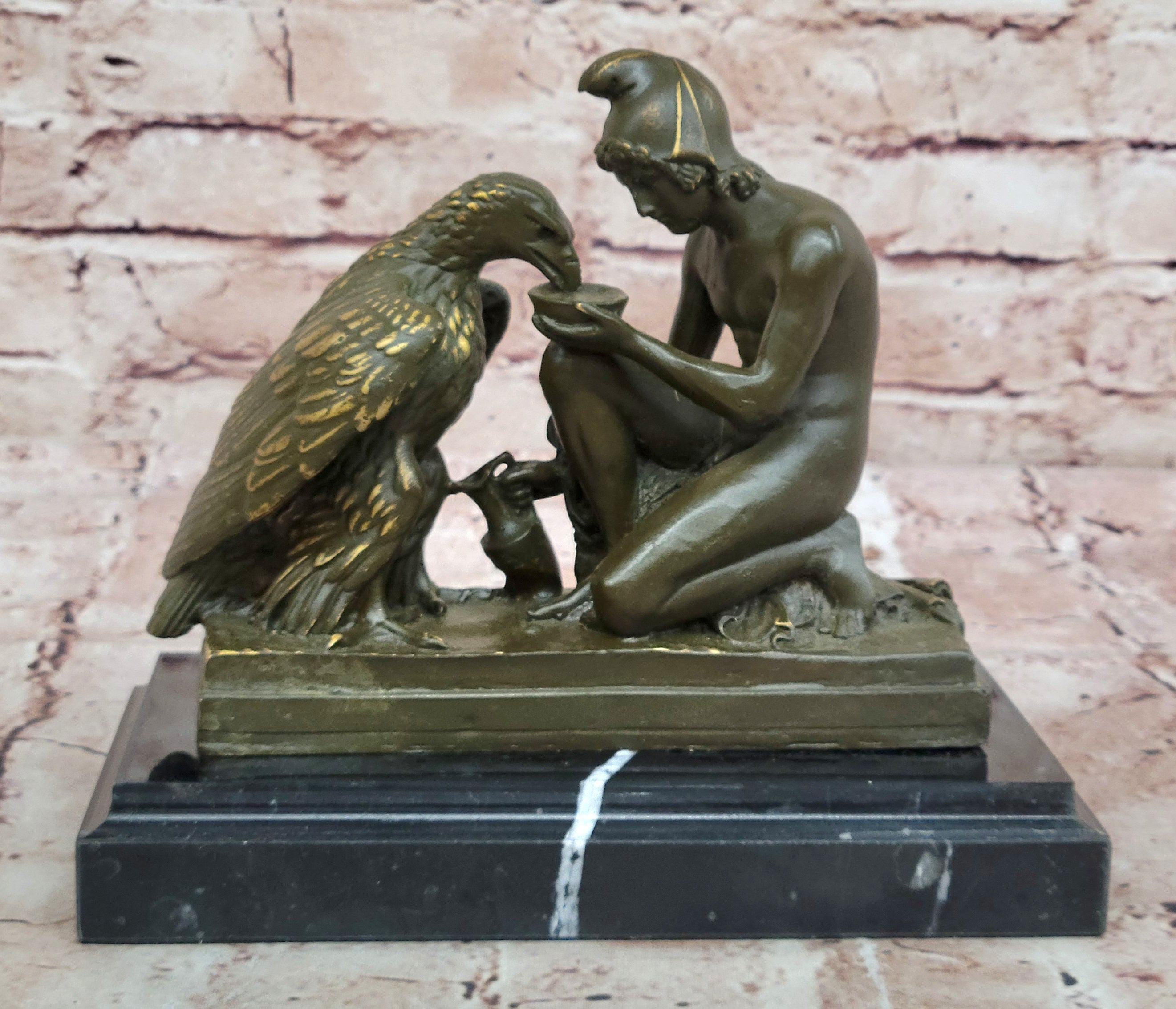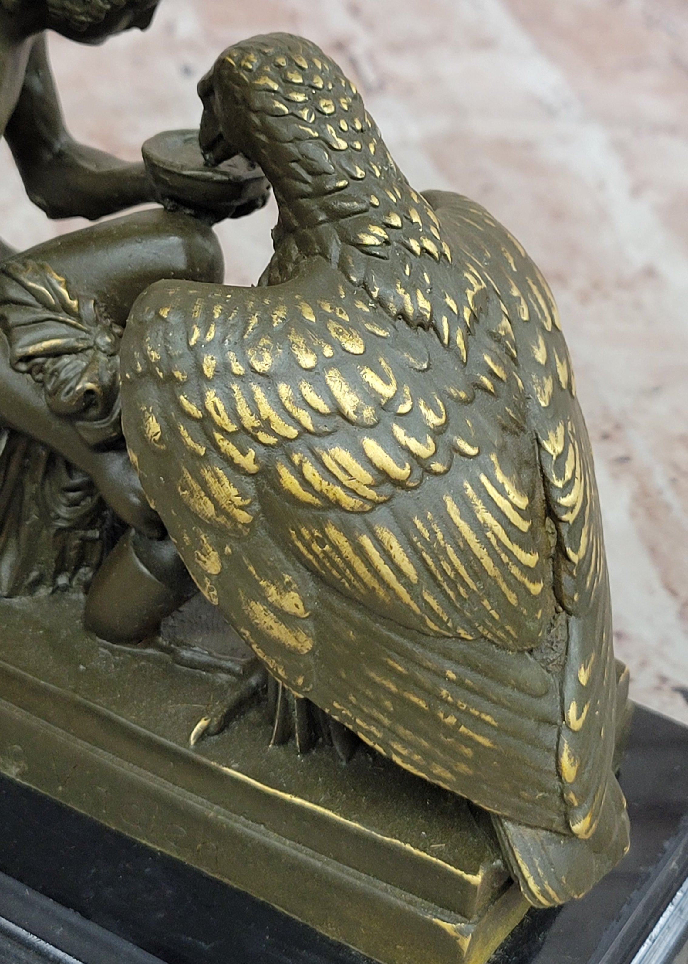 This elegant bronze sculpture by Aldo Vitaleh portrays the captivating mythological scene of Ganymede, the beautiful mortal youth from Greek mythology, serving Zeus' eagle. In classical lore, Ganymede was taken to Olympus to serve as cupbearer to the gods, and this statue beautifully captures his divine role—pouring water for the majestic eagle, a symbolic embodiment of Zeus himself. The figure is depicted with grace and reverence, reflecting both his celestial duty and youthful innocence.