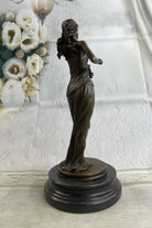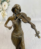 In this captivating bronze sculpture, the profound beauty of music is brought to life as a woman plays her violin with serene concentration. With closed eyes and a focused expression, she is fully immersed in the melody, moving the bow back and forth to create delicate and enchanting music. Her long hair cascades down her back, adorned with a studded headpiece that complements her elegant dress, which billows softly as if caught in a gentle breeze.