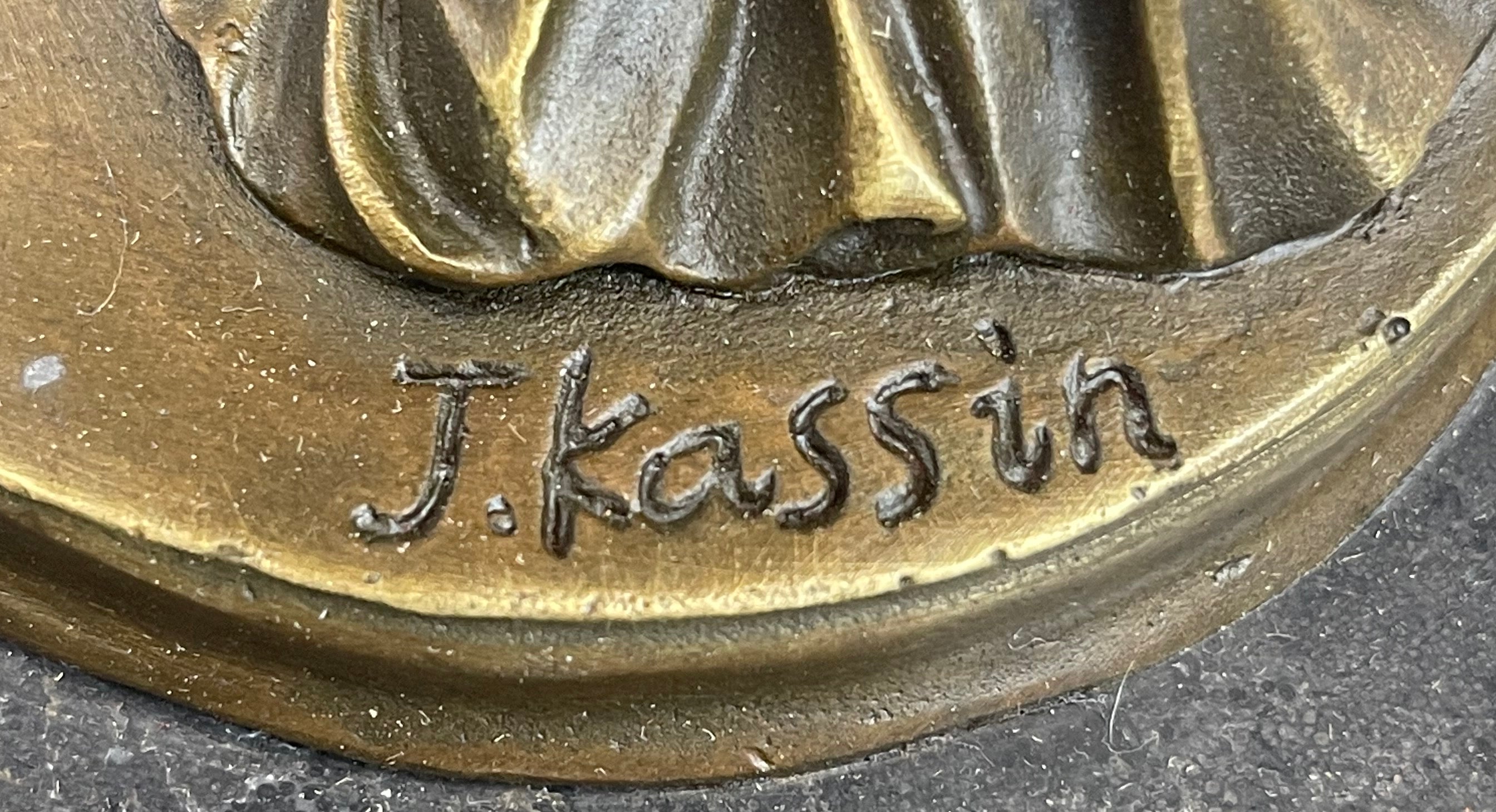 Signed by the artist J. Kassin, this exquisite sculpture is not only a testament to the timeless allure of music but also a celebration of the artistic mastery and craftsmanship that went into its creation. Whether displayed in a home, office, or gallery, it serves as a poignant reminder of the transformative power of music to uplift the soul and evoke emotions beyond words.Bronze Dimensions with Marble Base: Height 14" X Width 6"