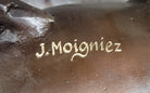 Resting upon a luxurious marble base, this sculpture becomes a true centerpiece, demanding recognition and admiration. The base further highlights the artwork's elegance and sophistication, enhancing its overall aesthetic appeal. Signed by the renowned artist J. Moigniez, this bronze sculpture is a testament to the artist's talent and craftsmanship. Immerse yourself in the world of this extraordinary creature, and allow its presence to captivate and inspire you.Bronze Dimensions with Marble Base: Height 11" X Width 18"