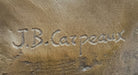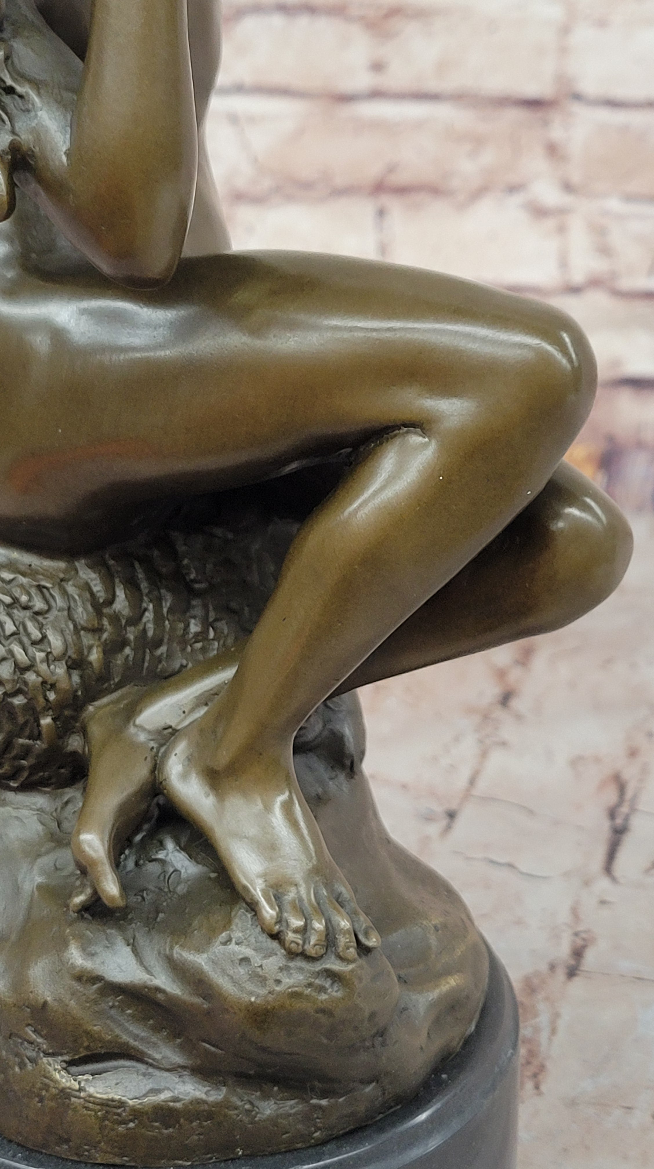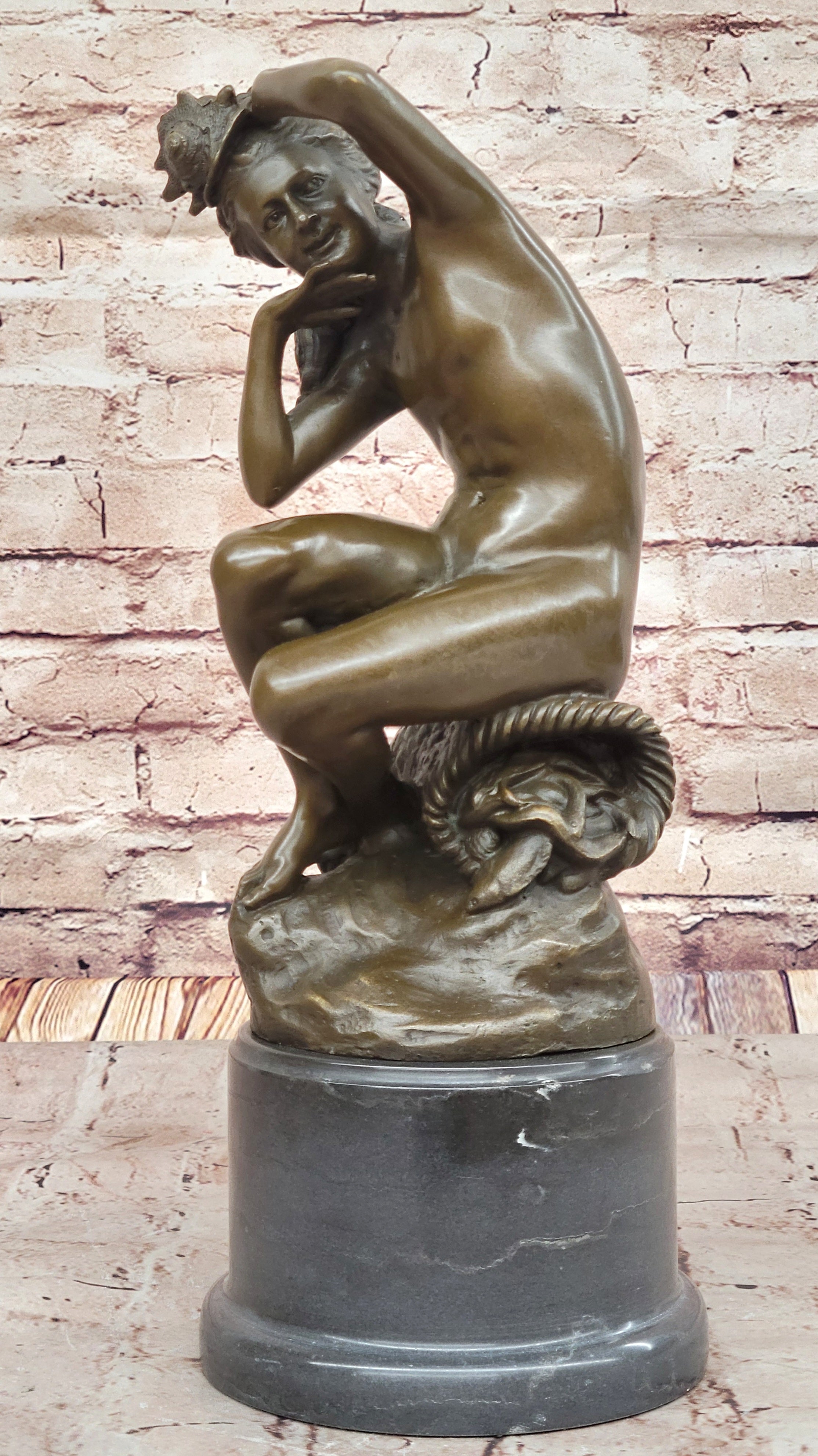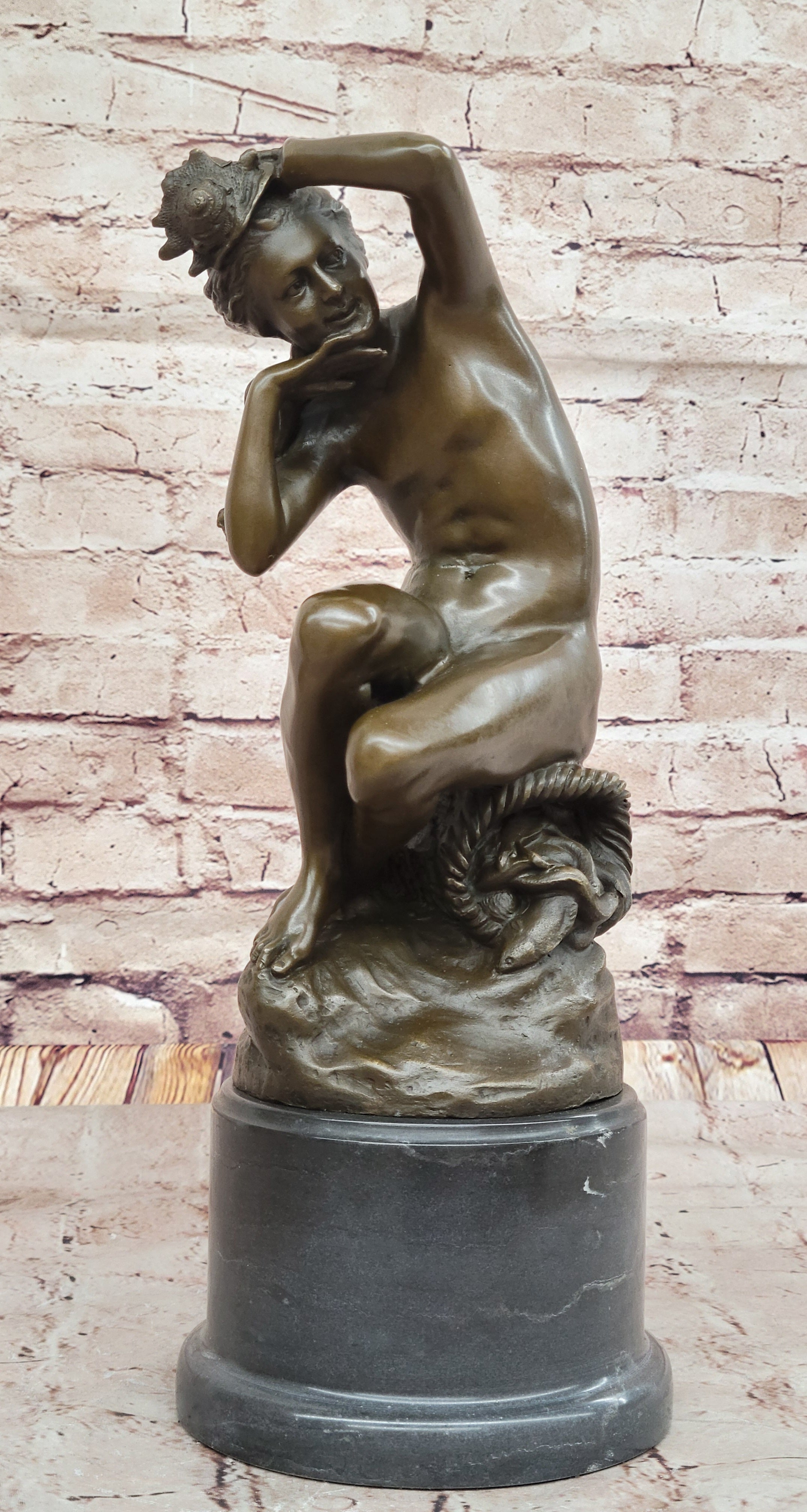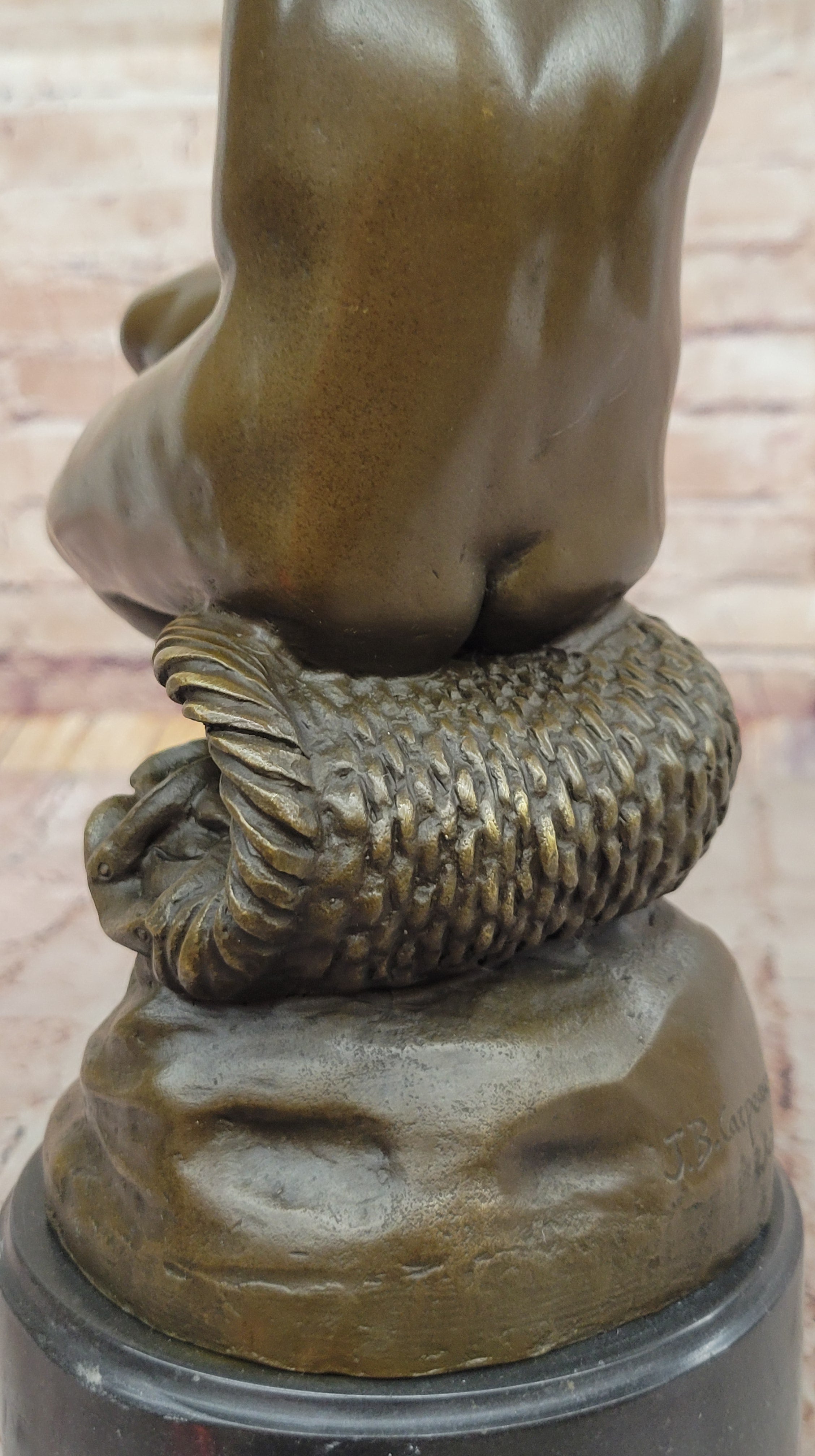 This bronze sculpture, titled Nude Woman Seated on a Basket of Fish, is a remarkable piece inspired by the renowned 19th-century French sculptor Jean-Baptiste Carpeaux. Crafted in the early 20th century, this statue captures the grace and sensuality of the female form, elegantly seated upon a basket filled with fish. The figure's natural beauty is emphasized by the fluidity of her pose, as her soft, delicate features are balanced by the strength of her form. The artist's skillful attention to anatomical accuracy and fluid movement is clearly evident in this piece.