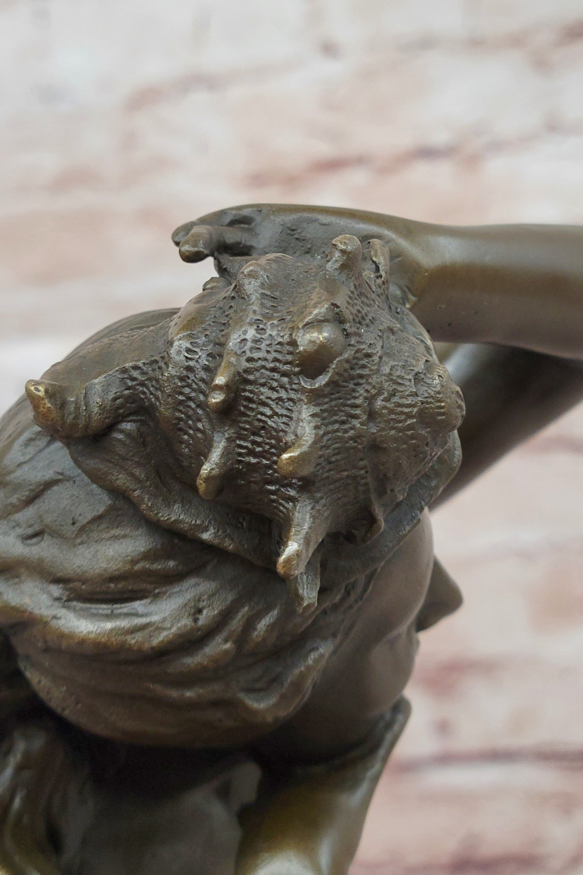 Handmade using the lost wax method, this sculpture is a prime example of classical craftsmanship. The piece has been stained with a bright brown patina, enhancing its depth and bringing out the fine details of the figure's contours, texture, and the intricate basket. The use of this technique ensures that the sculpture has a rich, timeless quality, with a smooth finish that invites the viewer to explore the texture and form of the work.