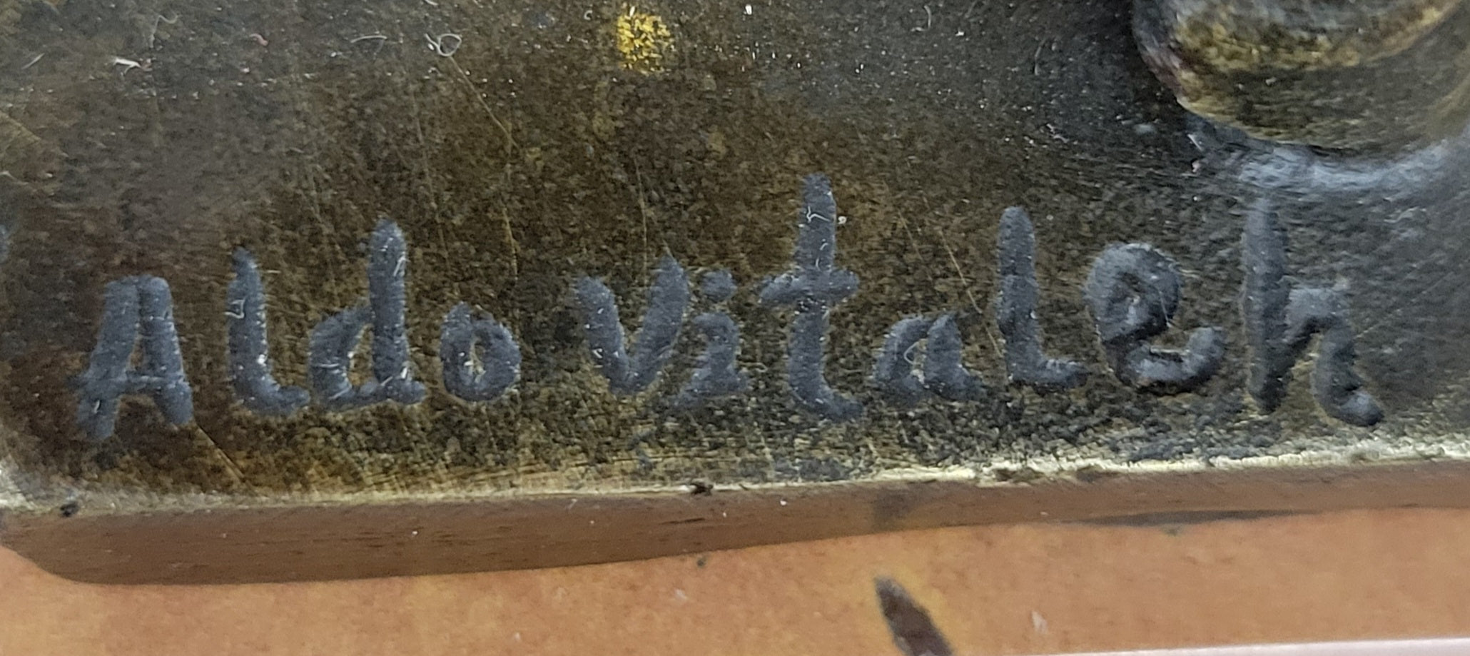 This remarkable bronze sculpture of a centaur embodies a blend of human and equine characteristics, symbolizing strength, wisdom, and spiritual depth. The centaur's introspective pose and raised leg convey a sense of wonder and introspection, inviting viewers to contemplate the mysteries of the natural and supernatural worlds. The artist's mastery is evident in the delicate rendering of the centaur's form and the intricate details that adorn its body, evoking a sense of grace and majesty. As a testament to the enduring legacy of Aldo Vitaleh's artistry, this sculpture stands as a testament to the timeless allure of myth and legend.Bronze Dimensions with Marble Base: Height 15.5" X Width 7 1/2"