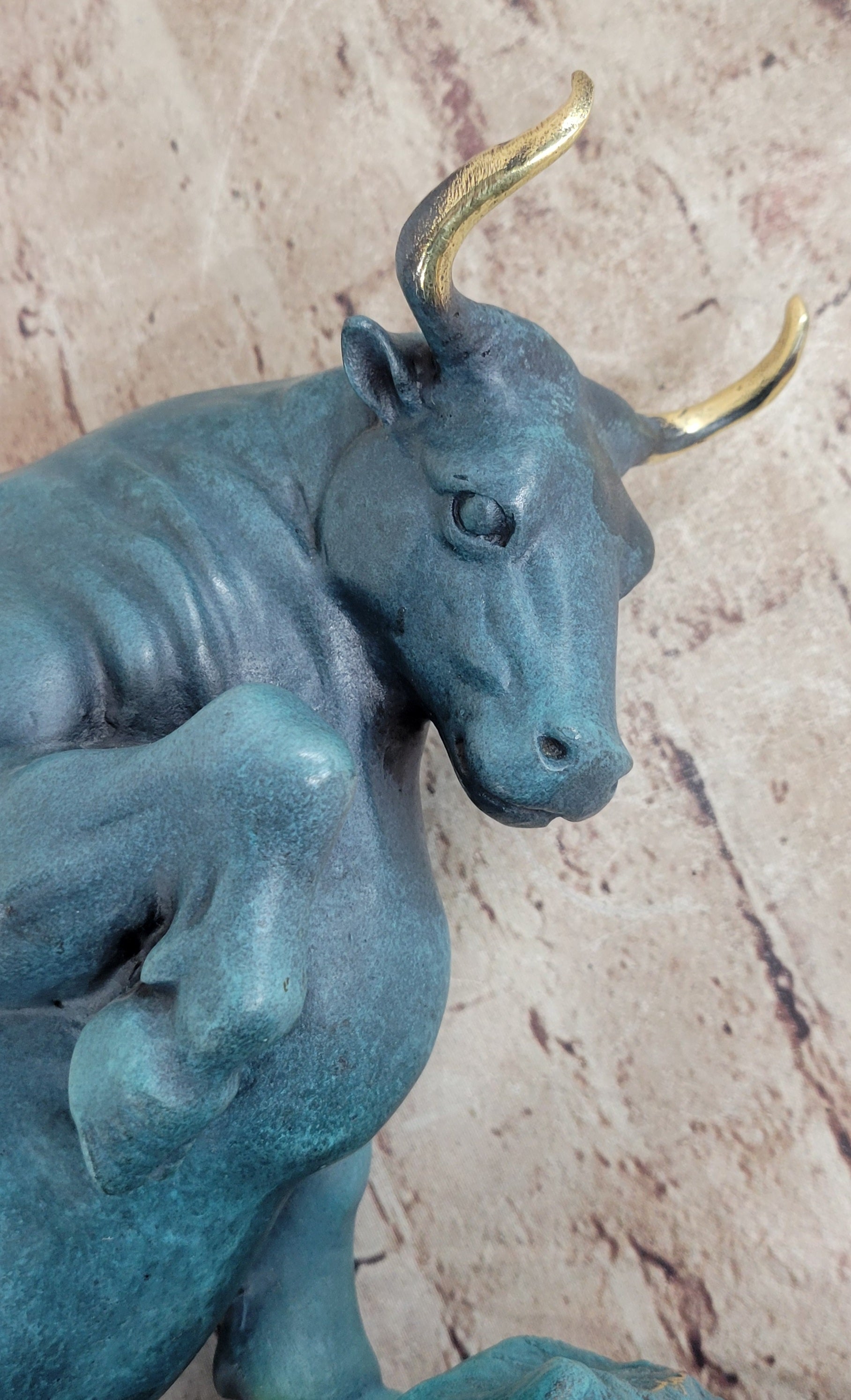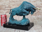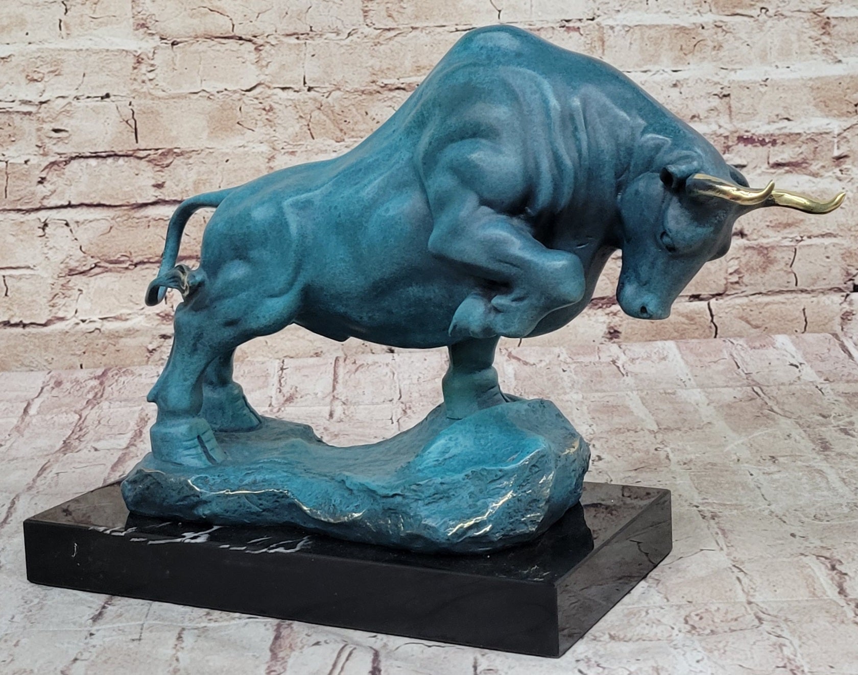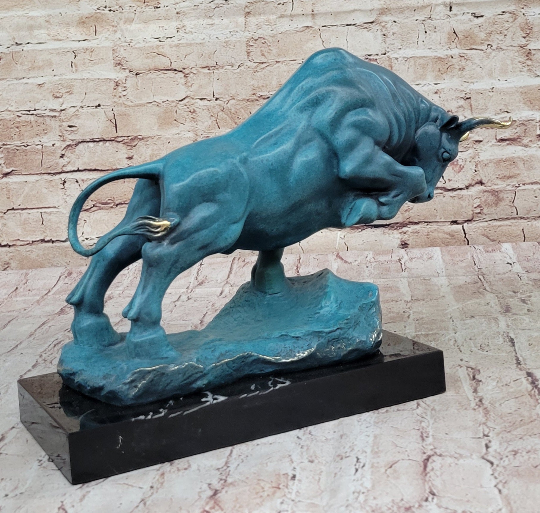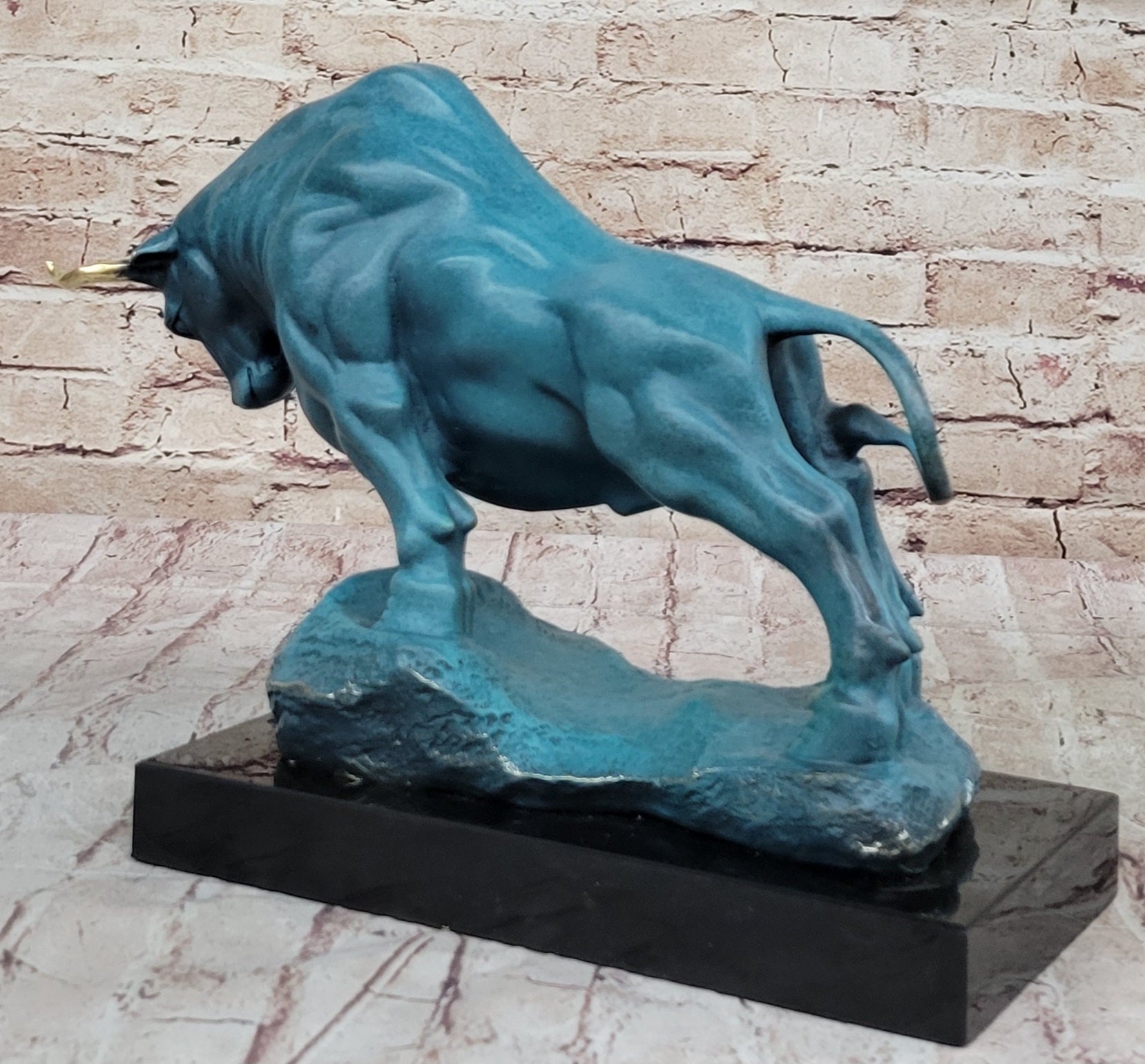 Charging Bull Hot Cast Bronze Figure w/ Blue Green Patina on Marble Base by Milo