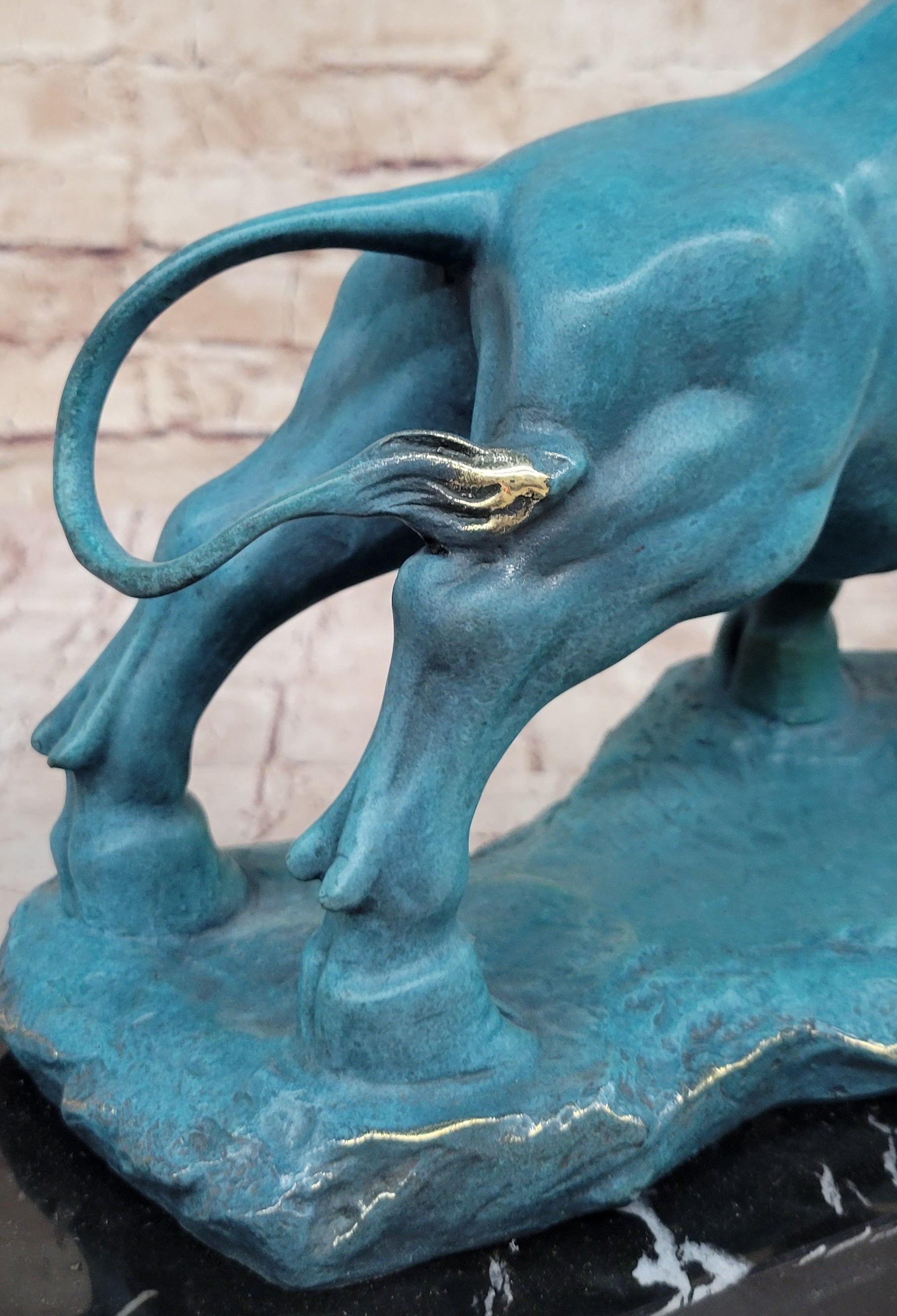 Every curve, muscle, and expression on this bull sculpture is a testament to the artist's skill and dedication. With its hooves firmly planted and horns ready for action, the bull exudes an undeniable presence and determination. The combination of the green patina and gold accents enhances the sculpture's visual appeal, capturing the spirit of the bullfighting tradition. Crafted from 100% bronze, this artwork is a testament to the enduring beauty and strength of this noble creature. Whether displayed in your home, office, or gallery, this remarkable sculpture will captivate viewers and serve as a bold statement piece. Experience the thrill and energy of the bullfighting spectacle with this exceptional bronze masterpiece.Bronze Dimensions with Marble Base :Height 10" X Width 15"