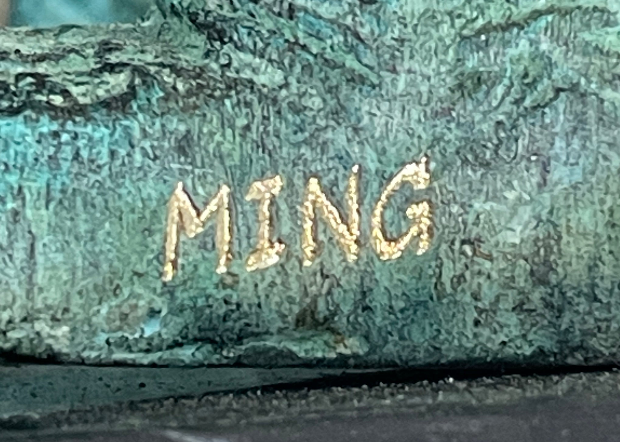 The artwork proudly rests upon a distinguished black variegated marble base, elevating its presence and adding a touch of elegance. The base also bears the signature of the esteemed artist, Ming, serving as a mark of authenticity and craftsmanship.