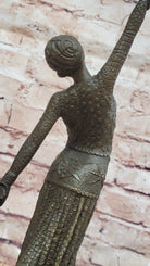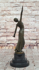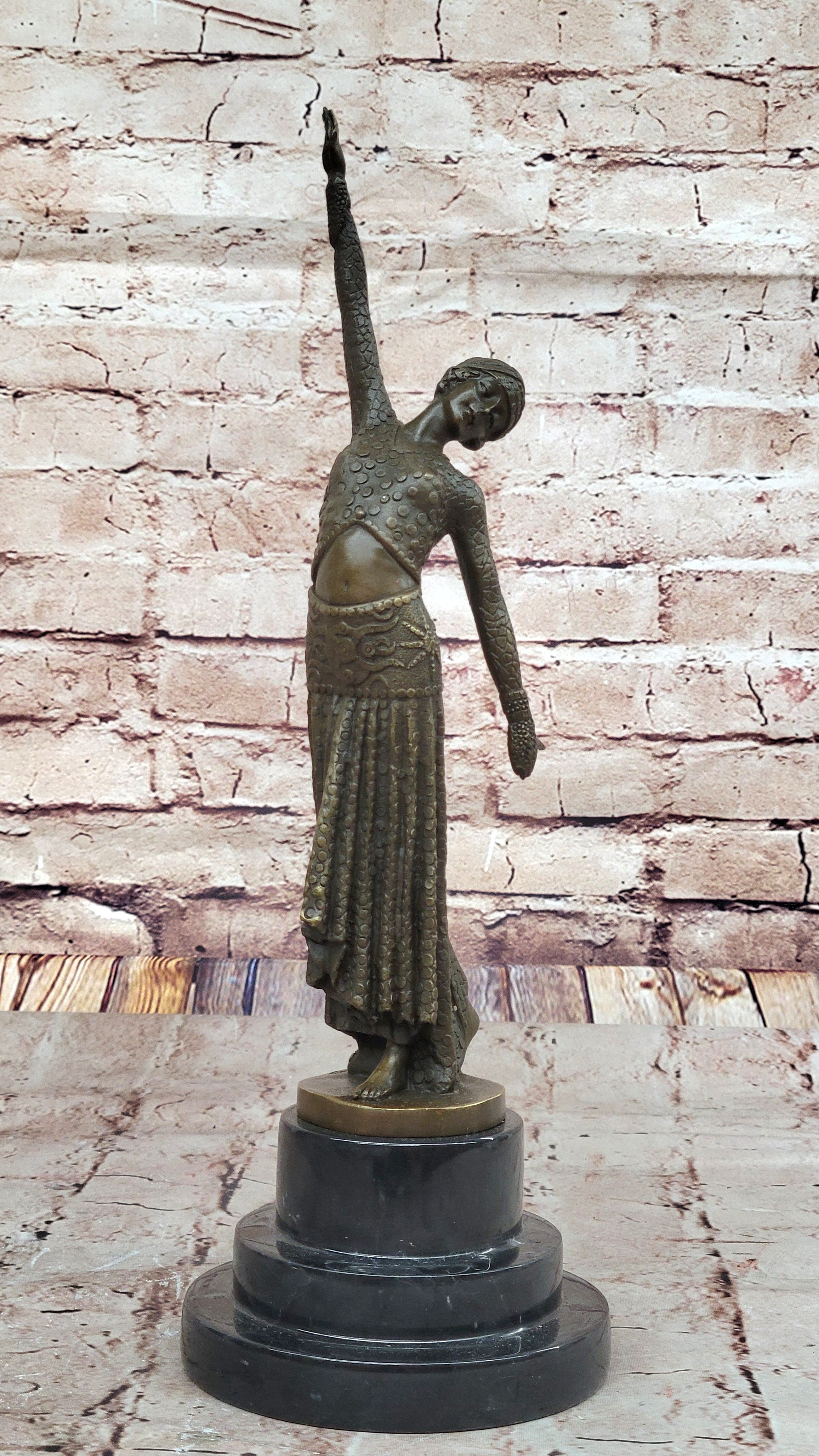 Embrace the beauty and artistry of this exquisite bronze sculpture, a testament to the captivating world of dance and the talent of its creator. Perfect for art enthusiasts, collectors, or anyone who appreciates the grace and elegance of the human form, this sculpture will become a cherished centerpiece in any space it graces. Chiparus, a celebrated Romanian Art Deco era sculptor, made Paris his home and artistic center. Born in Romania, he honed his craft under the guidance of esteemed sculptors Raffaello Romanelli, Antonin Mercie, and Jean Boucher. Demetre Chiparus, who passed away in 1947, rests in eternal peace at Bagneux cemetery, located just south of Paris. This exquisite bronze sculpture pays homage to his enduring legacy.Bronze Dimensions with Marble Base: Height 15" X Width 5"