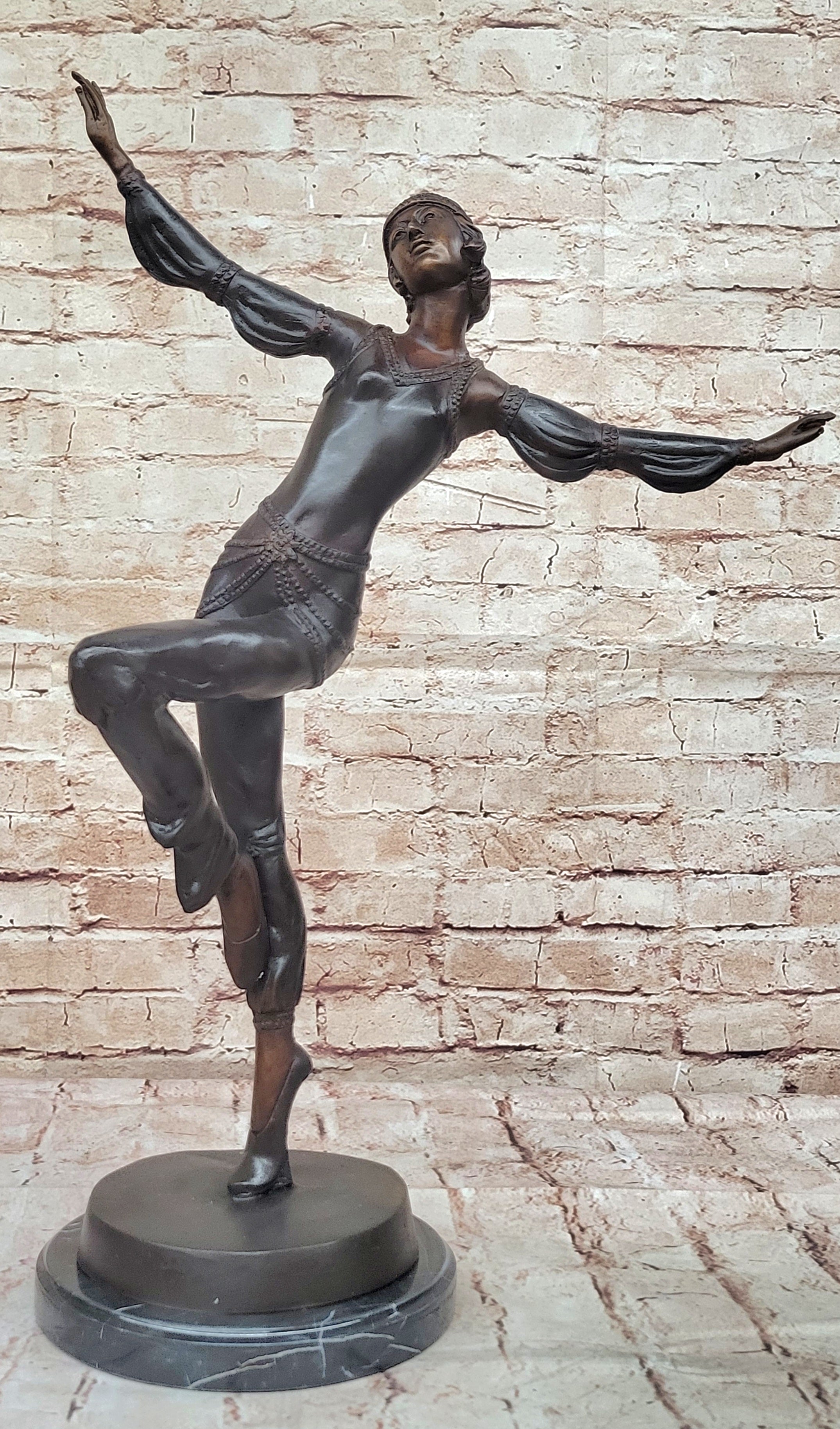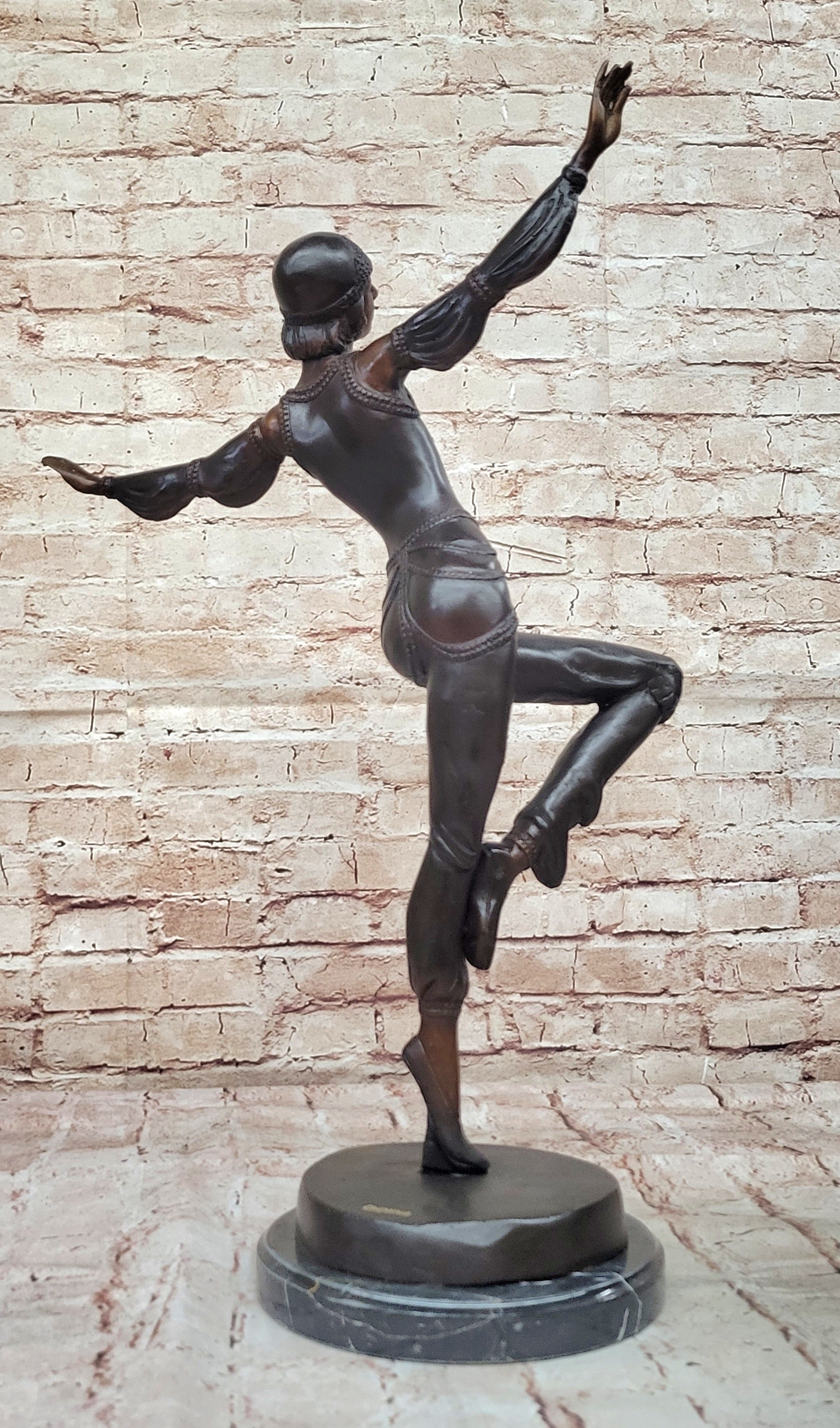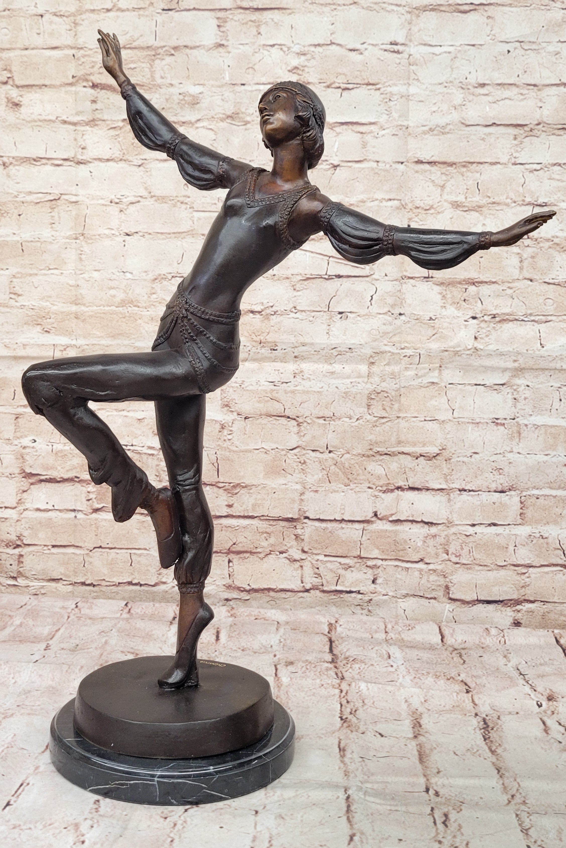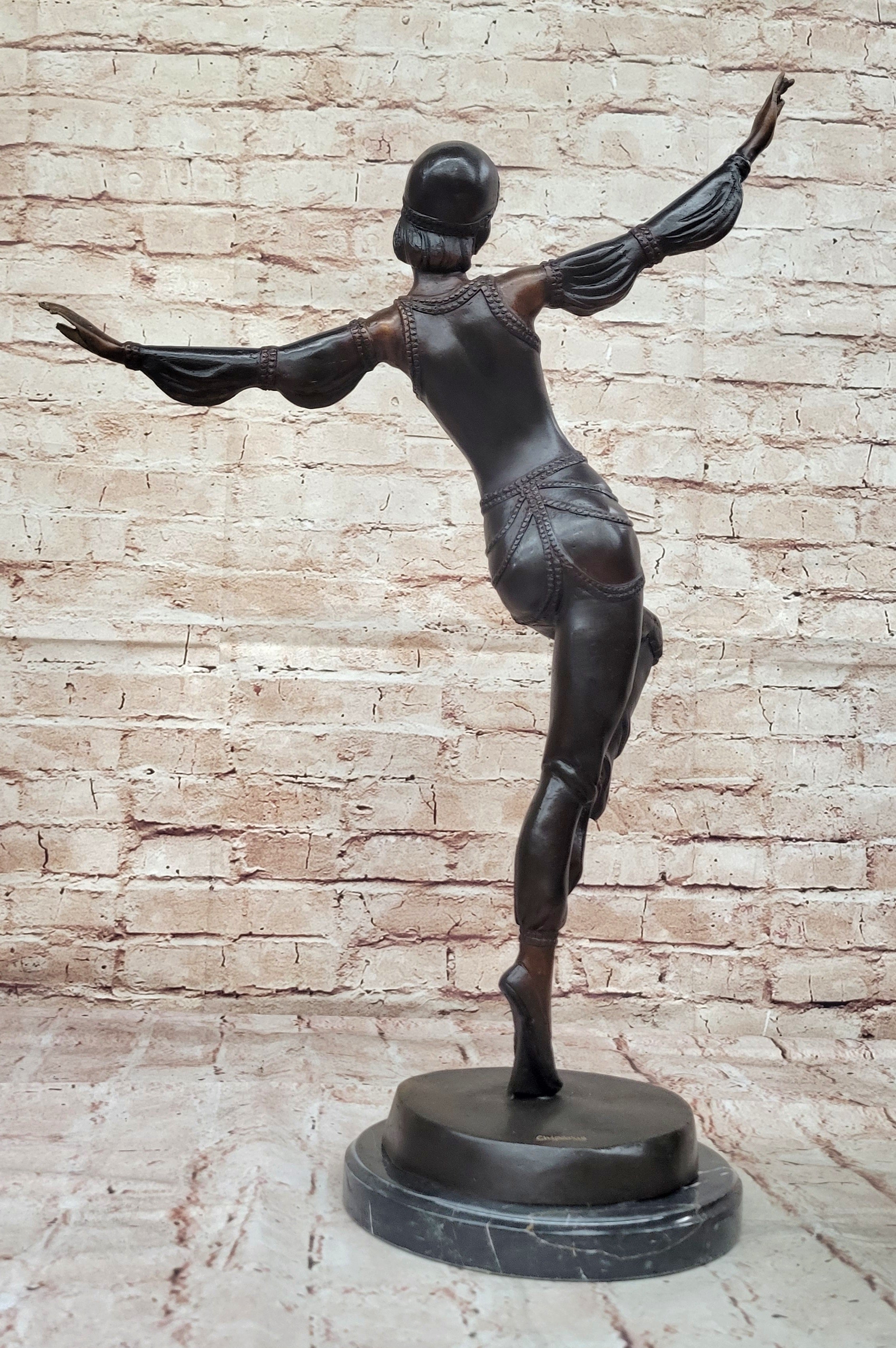 Handcrafted using the ancient "Lost Wax Method," this 100% bronze sculpture is finished with a stunning two-tone brown patina that enhances its depth and character. The artist's meticulous attention to detail is evident in every aspect—from the graceful lines of her form to the gemmed bangles adorning her wrists and upper arms. Signed by Chiparus, this exquisite piece stands as a testament to exceptional craftsmanship and remains a captivating example of Art Deco elegance.Bronze Dimensions with Marble Base: Height 22" X Width 15"