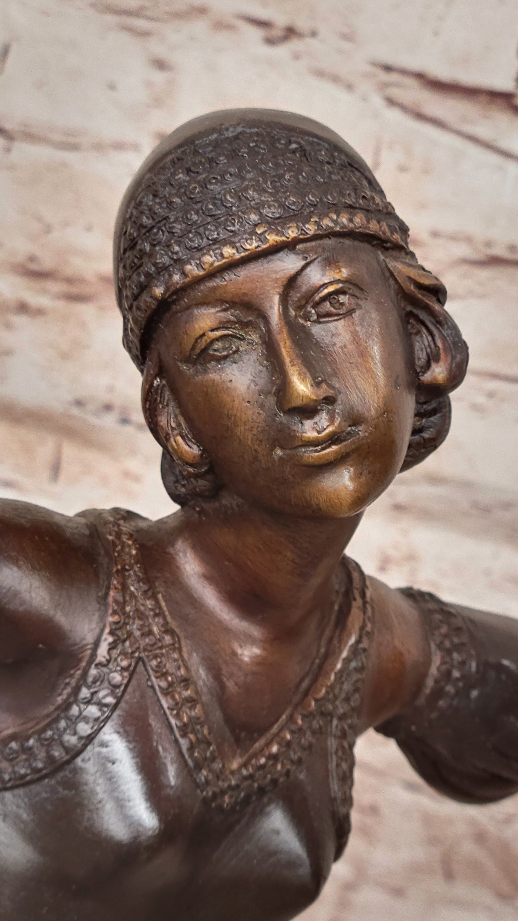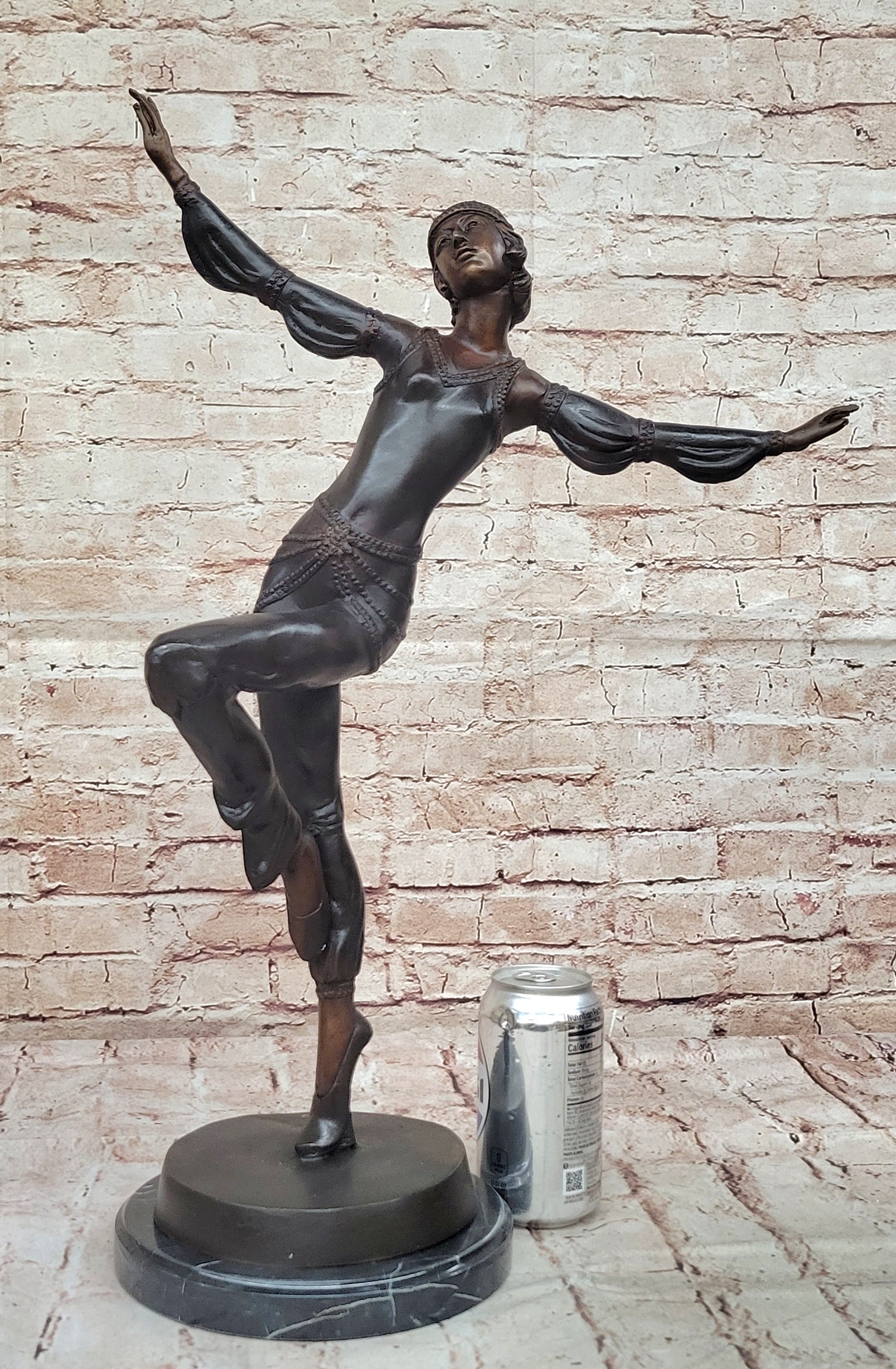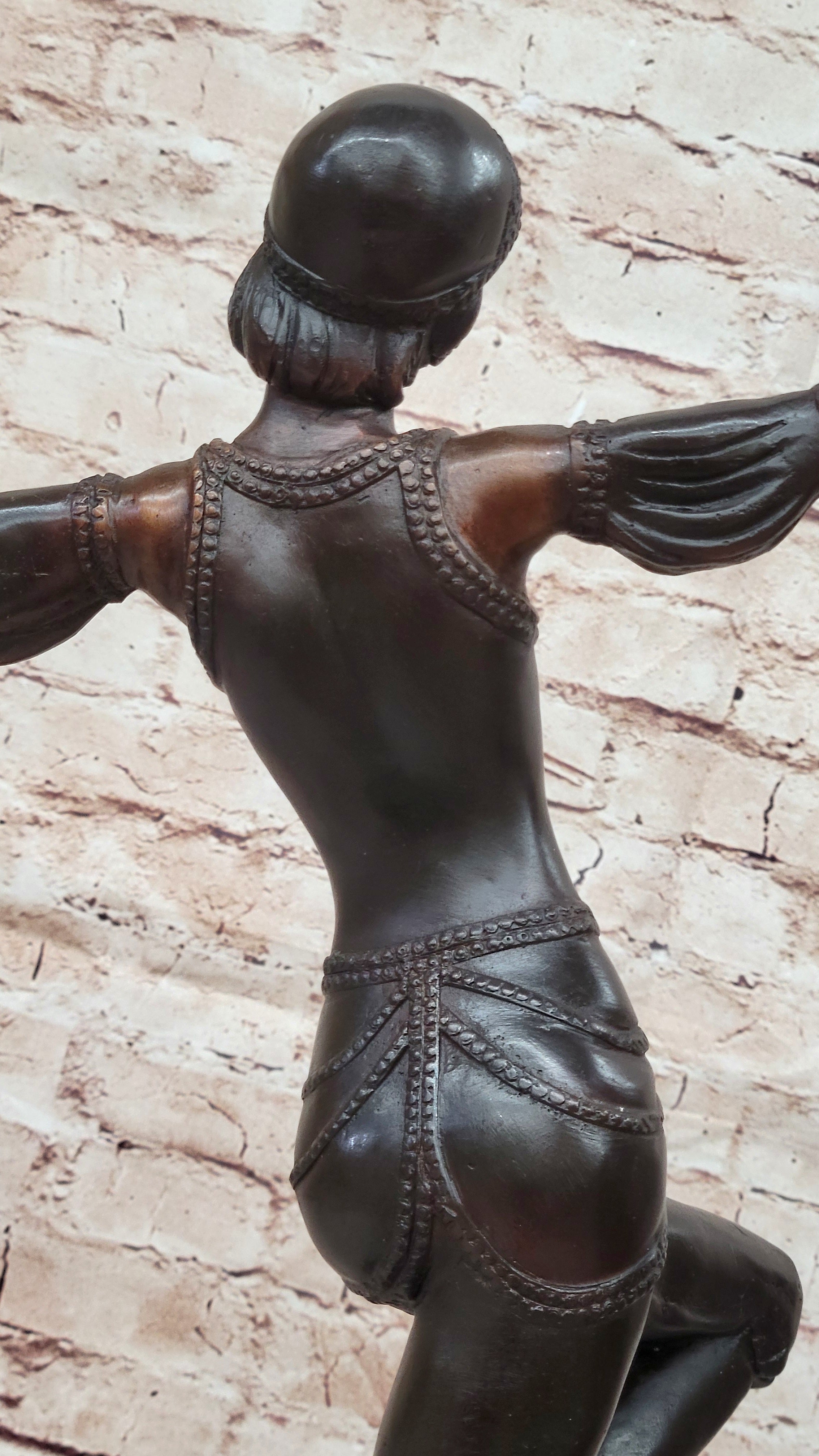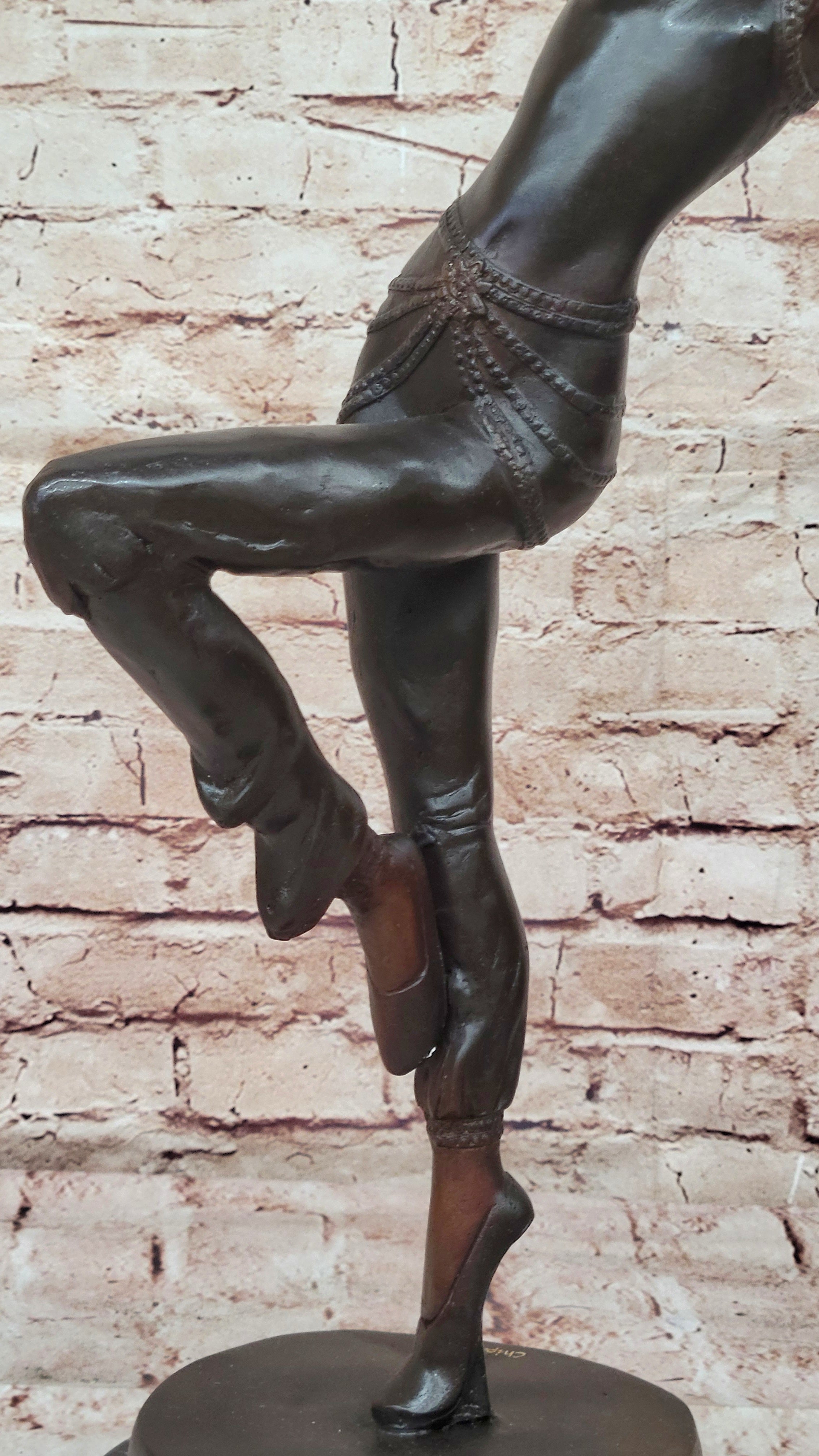 Handcrafted using the ancient "Lost Wax Method," this 100% bronze sculpture is finished with a stunning two-tone brown patina that enhances its depth and character. The artist's meticulous attention to detail is evident in every aspect—from the graceful lines of her form to the gemmed bangles adorning her wrists and upper arms. Signed by Chiparus, this exquisite piece stands as a testament to exceptional craftsmanship and remains a captivating example of Art Deco elegance.Bronze Dimensions with Marble Base: Height 22" X Width 15"
