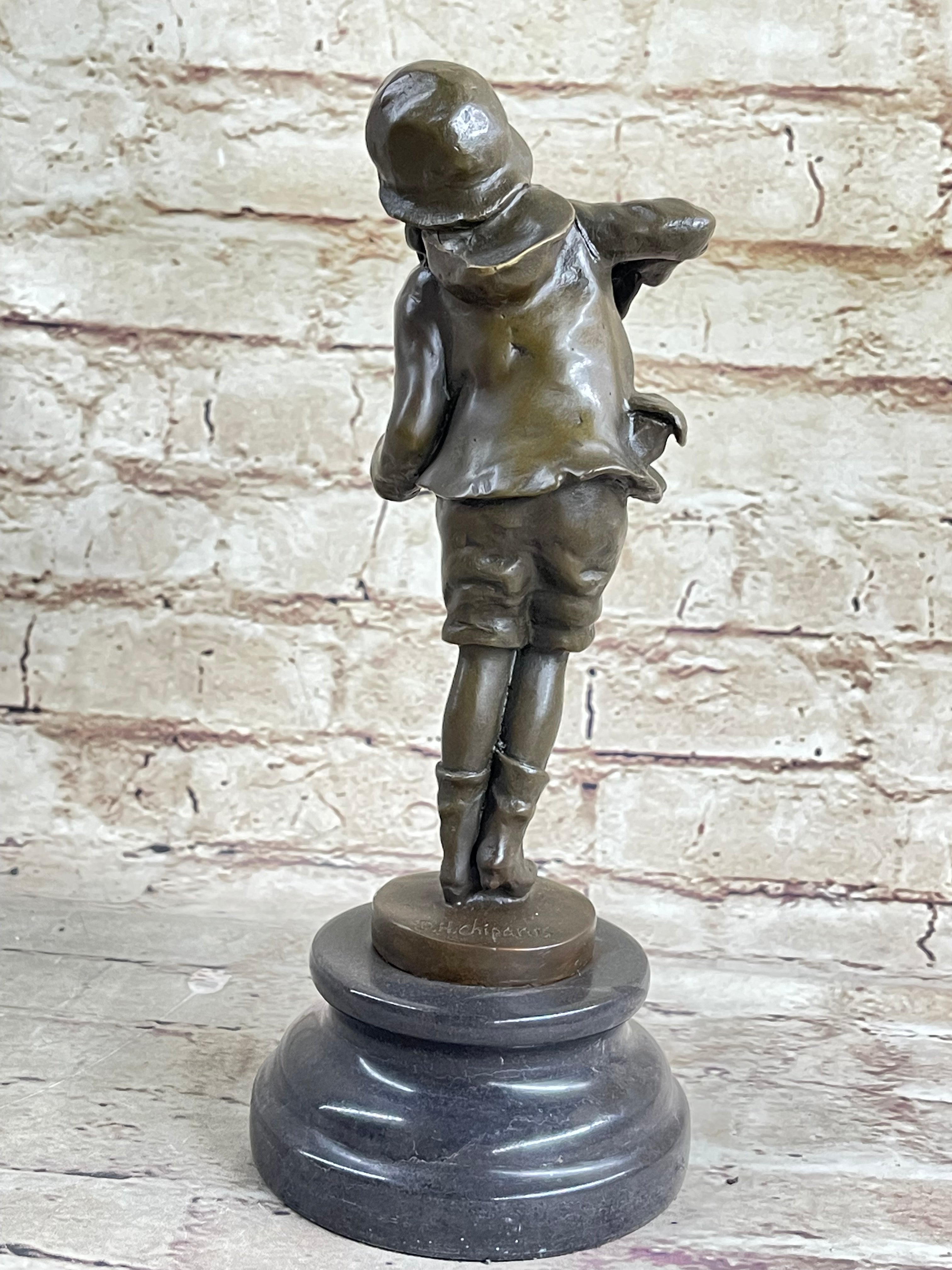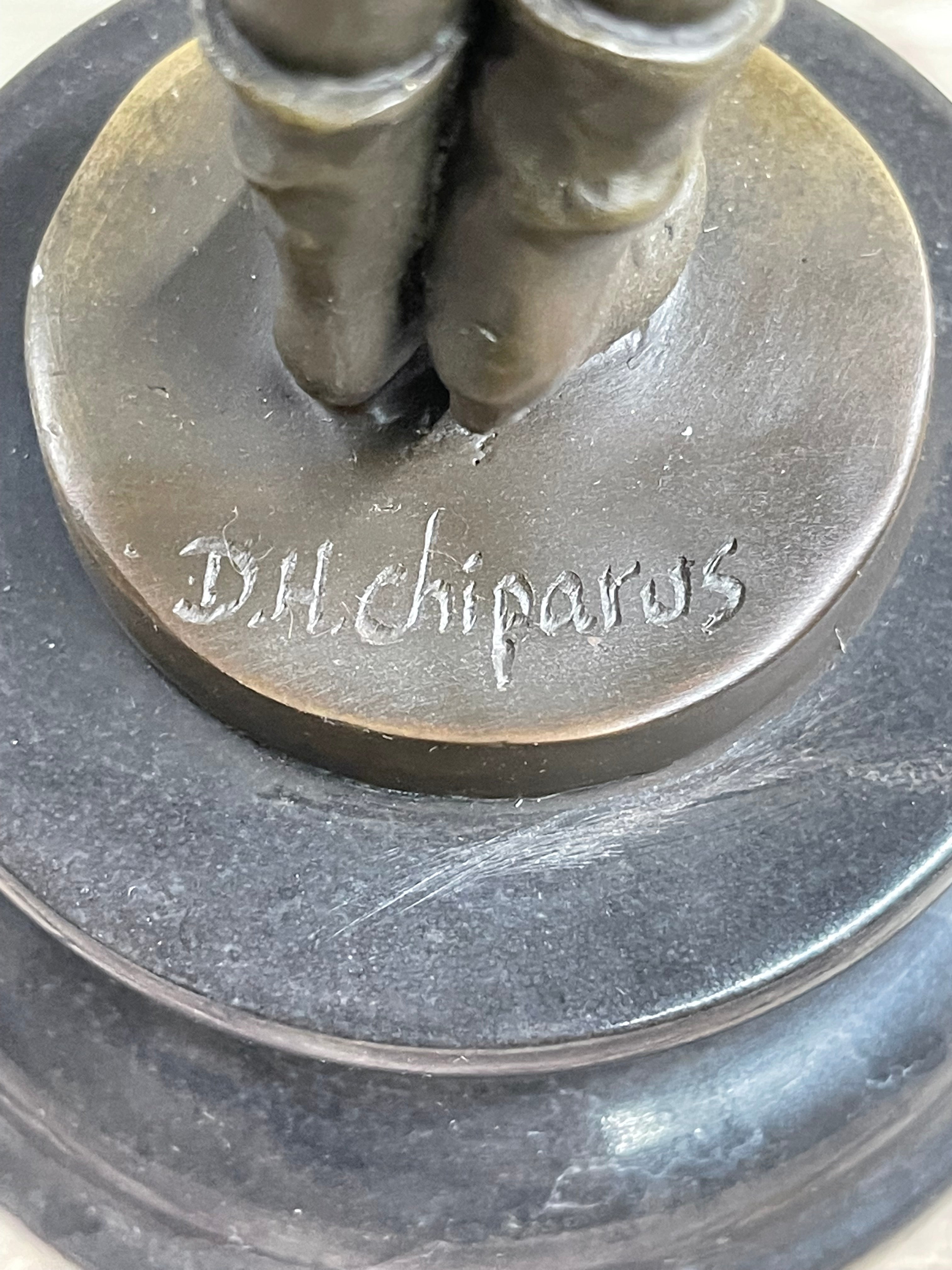 Mounted on a polished marble base, this sculpture bears the European Bronze Finery stamp, a mark of quality and craftsmanship, along with the signature of the esteemed artist D.H. Chiparus. Whether for a collector or admirer of nostalgic childhood scenes, this sculpture is a delightful addition that celebrates the joys of youth and the courage to perform before an audience.Bronze Dimensions with Marble Base: Height 10" X Width 4"