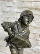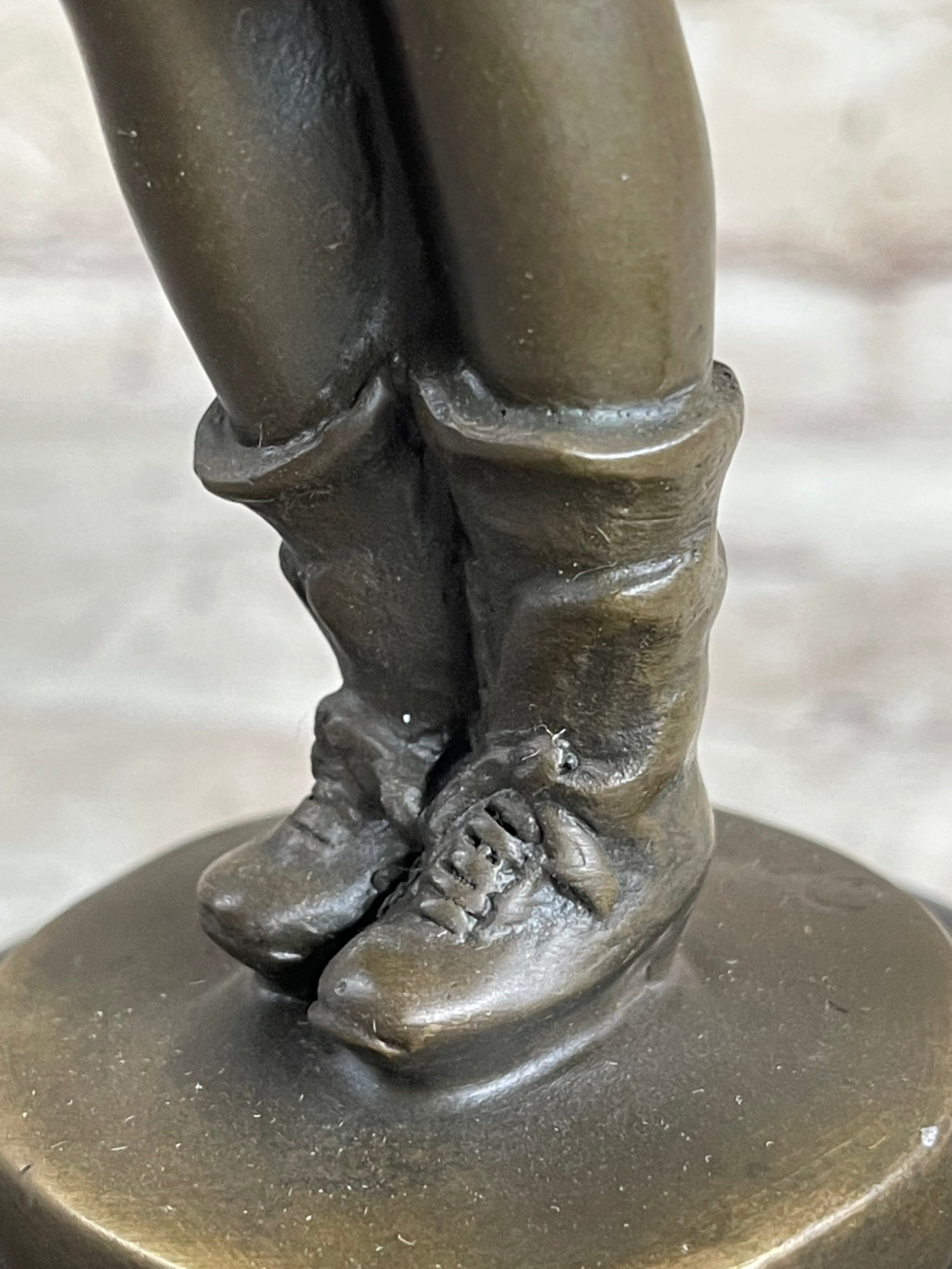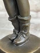 Handcrafted in 100% bronze, this sculpture showcases the traditional lost wax casting method, celebrated for its fine detail and timeless durability. Every aspect of the figure, from the folds in his jacket to the elaborate boot designs, is beautifully preserved in a rich brown patina, giving the piece depth and texture. The boy’s expression and pose capture an endearing moment of innocence and courage, bringing the artwork to life.