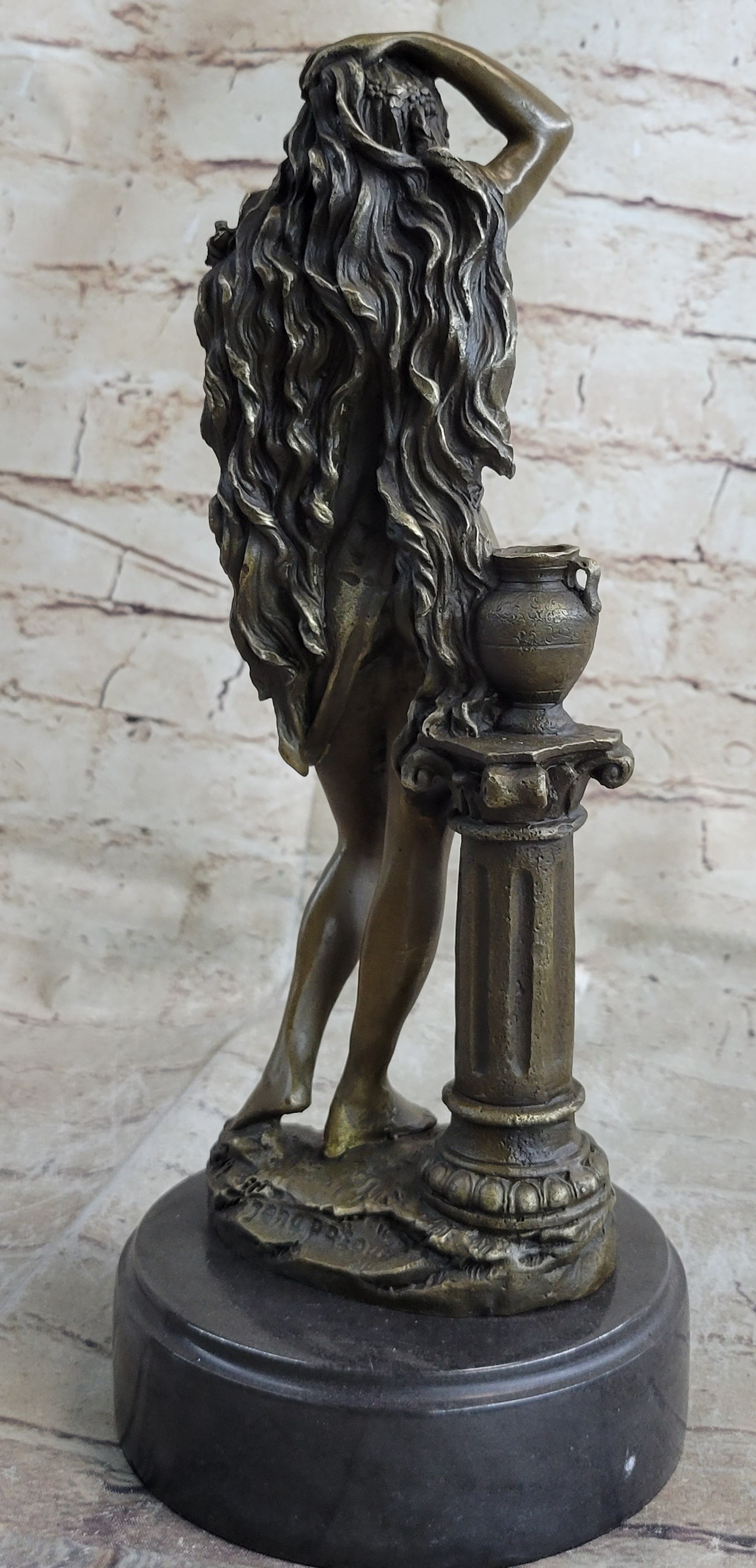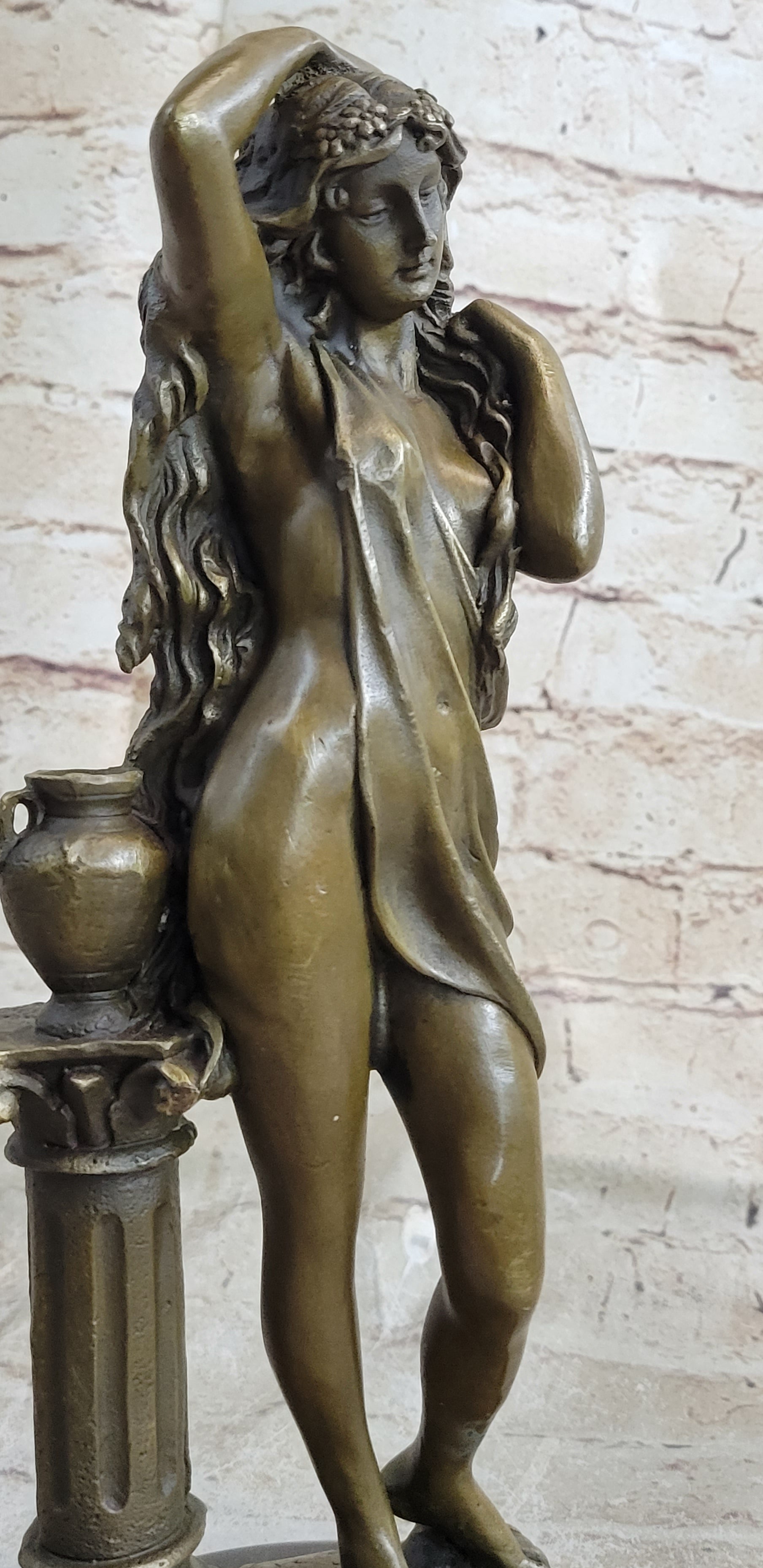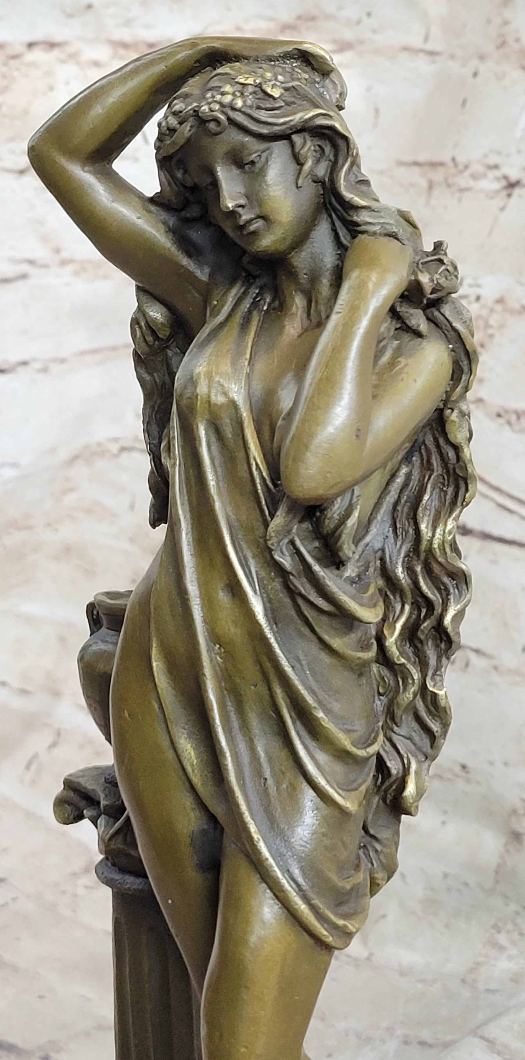This bronze sculpture captures the essence of timeless beauty, portraying a maiden in a contrapposto position. In a mesmerizing pose, she pushes away her flowing locks from her delicate face, drawing the enchanted beholder into an intimate and captivating gaze. The magnetic allure of this classic beauty transcends time, and her long, curly hair cascades in a perpetual flow, overwhelming her petite figure. The artist's meticulous craftsmanship is evident in the intricate details of the sheer fabric that barely covers her and the remarkable rendering of her hair.