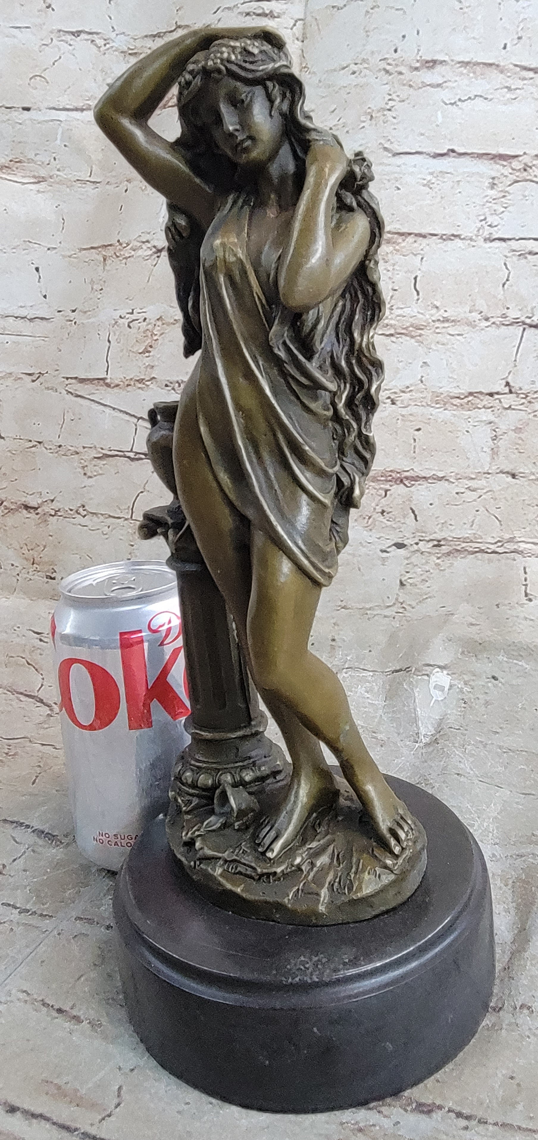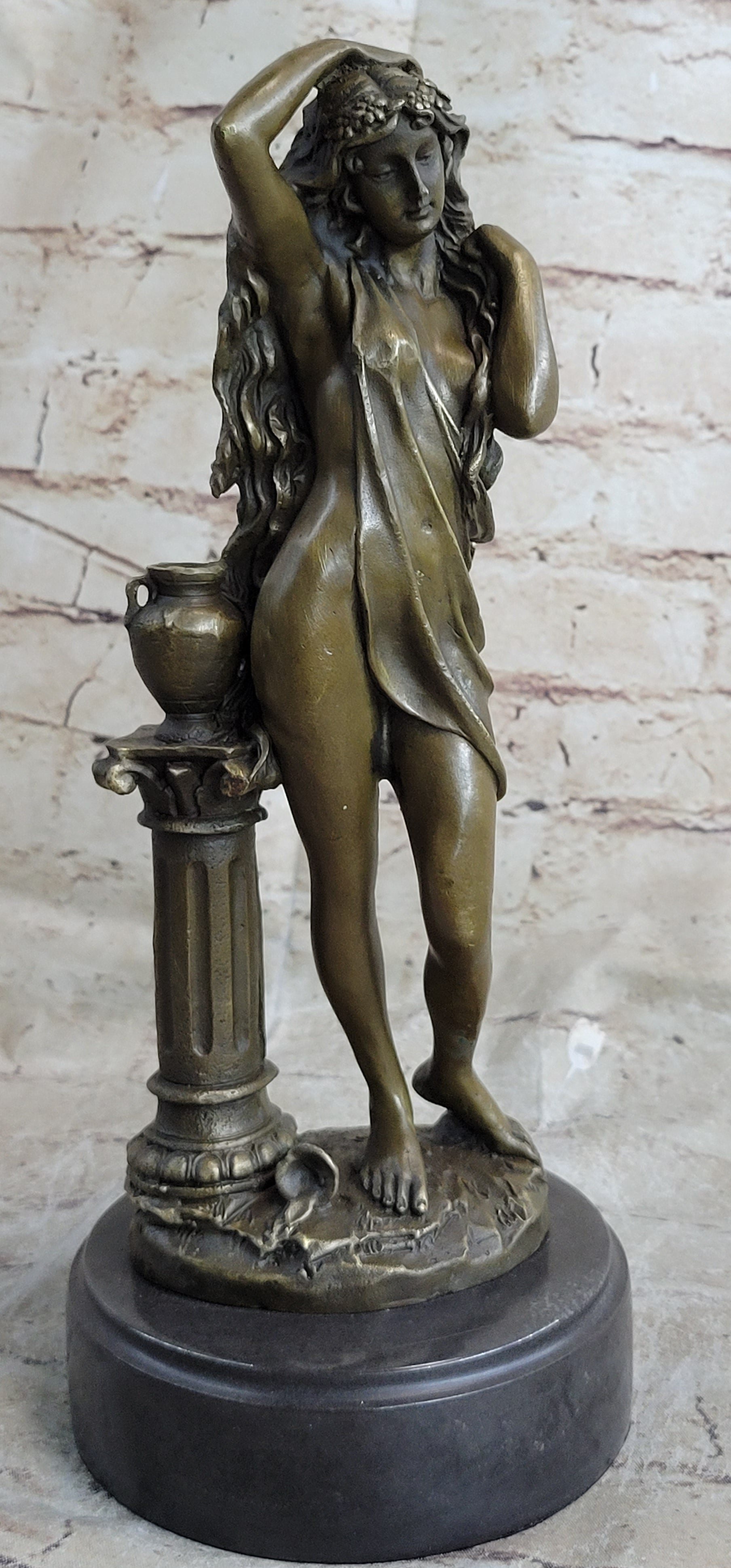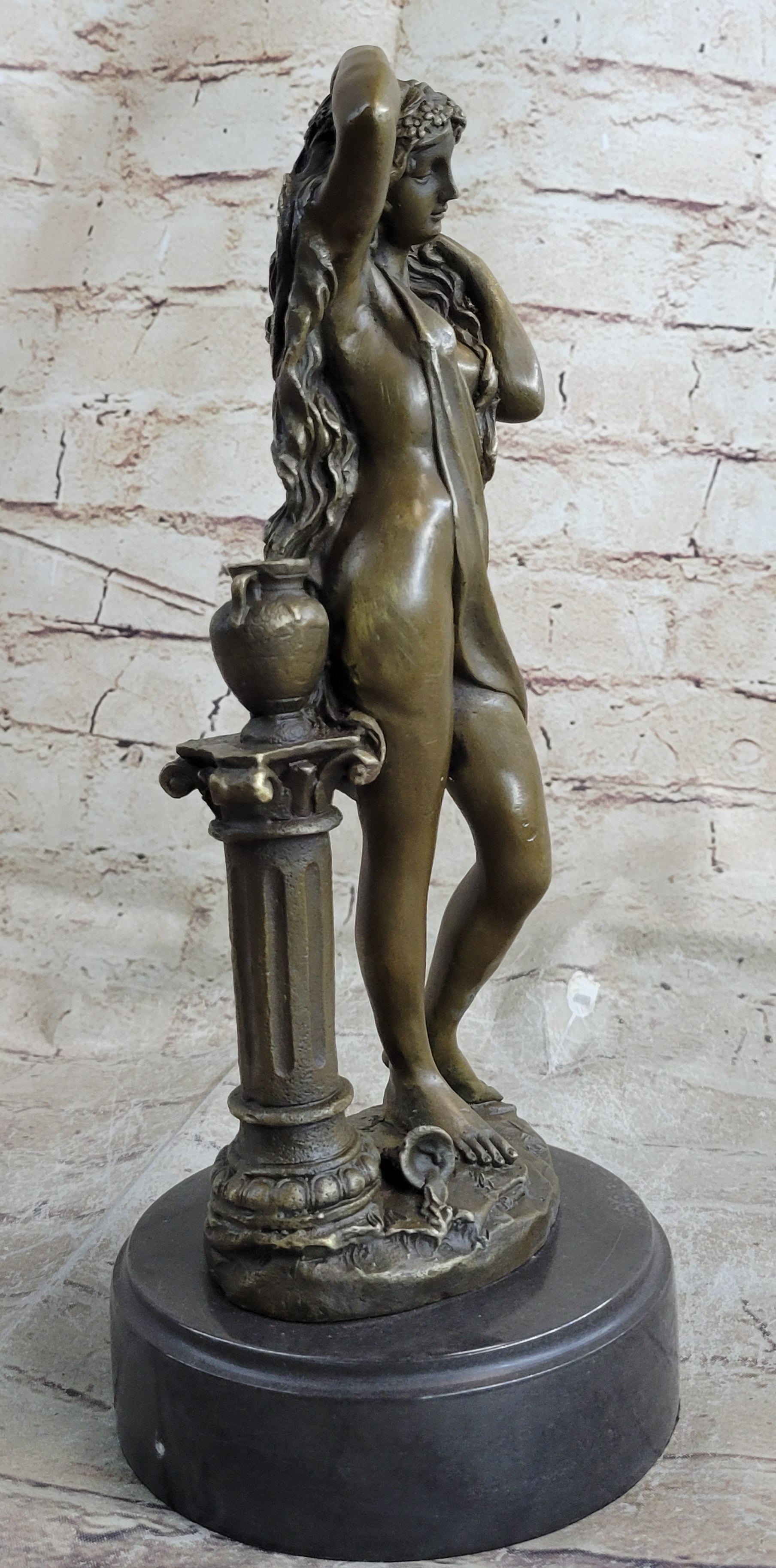 This bronze sculpture captures the essence of timeless beauty, portraying a maiden in a contrapposto position. In a mesmerizing pose, she pushes away her flowing locks from her delicate face, drawing the enchanted beholder into an intimate and captivating gaze. The magnetic allure of this classic beauty transcends time, and her long, curly hair cascades in a perpetual flow, overwhelming her petite figure. The artist's meticulous craftsmanship is evident in the intricate details of the sheer fabric that barely covers her and the remarkable rendering of her hair.