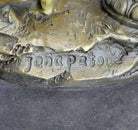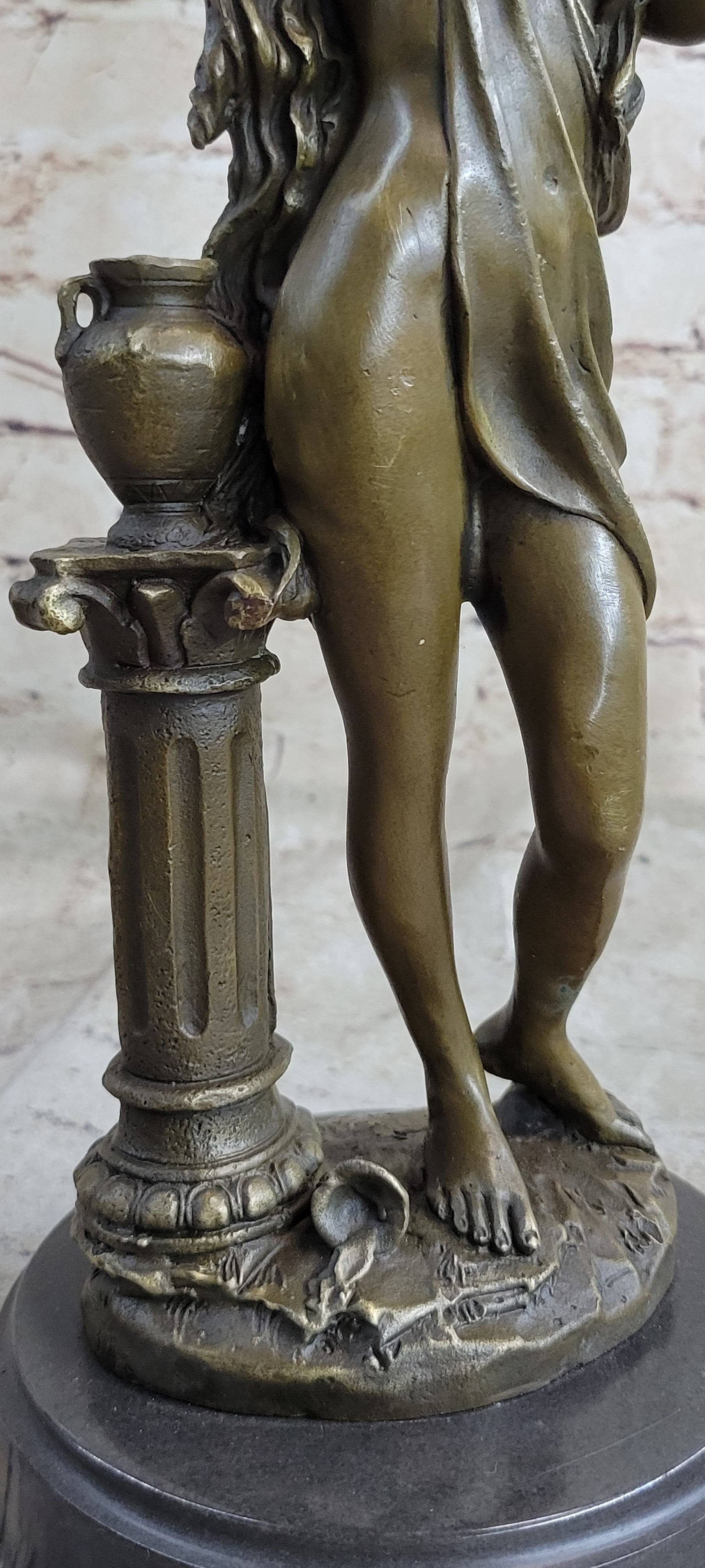 The signature of the artist, Jean Patoue, serves as a mark of authenticity and a connection to the skilled hands that brought this enchanting maiden to life. Whether displayed as a focal point or integrated into a curated collection, this sculpture invites viewers to appreciate the enduring allure of classical beauty. The maiden's captivating pose and the artist's attention to detail make this artwork a timeless celebration of grace and craftsmanship, creating a sense of enchantment that lingers in the viewer's gaze.Bronze Dimensions with Marble Base: Height 12" X Width 6"