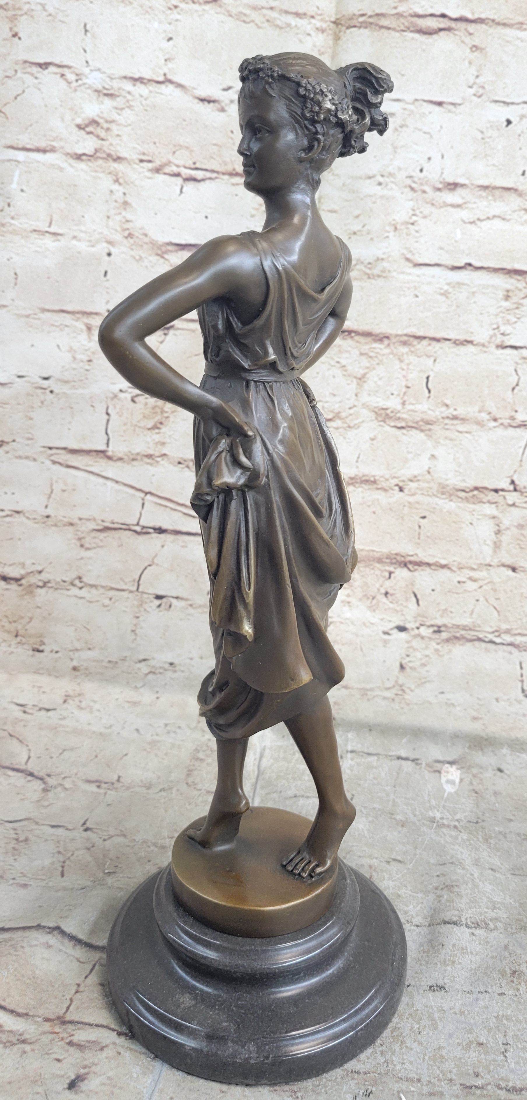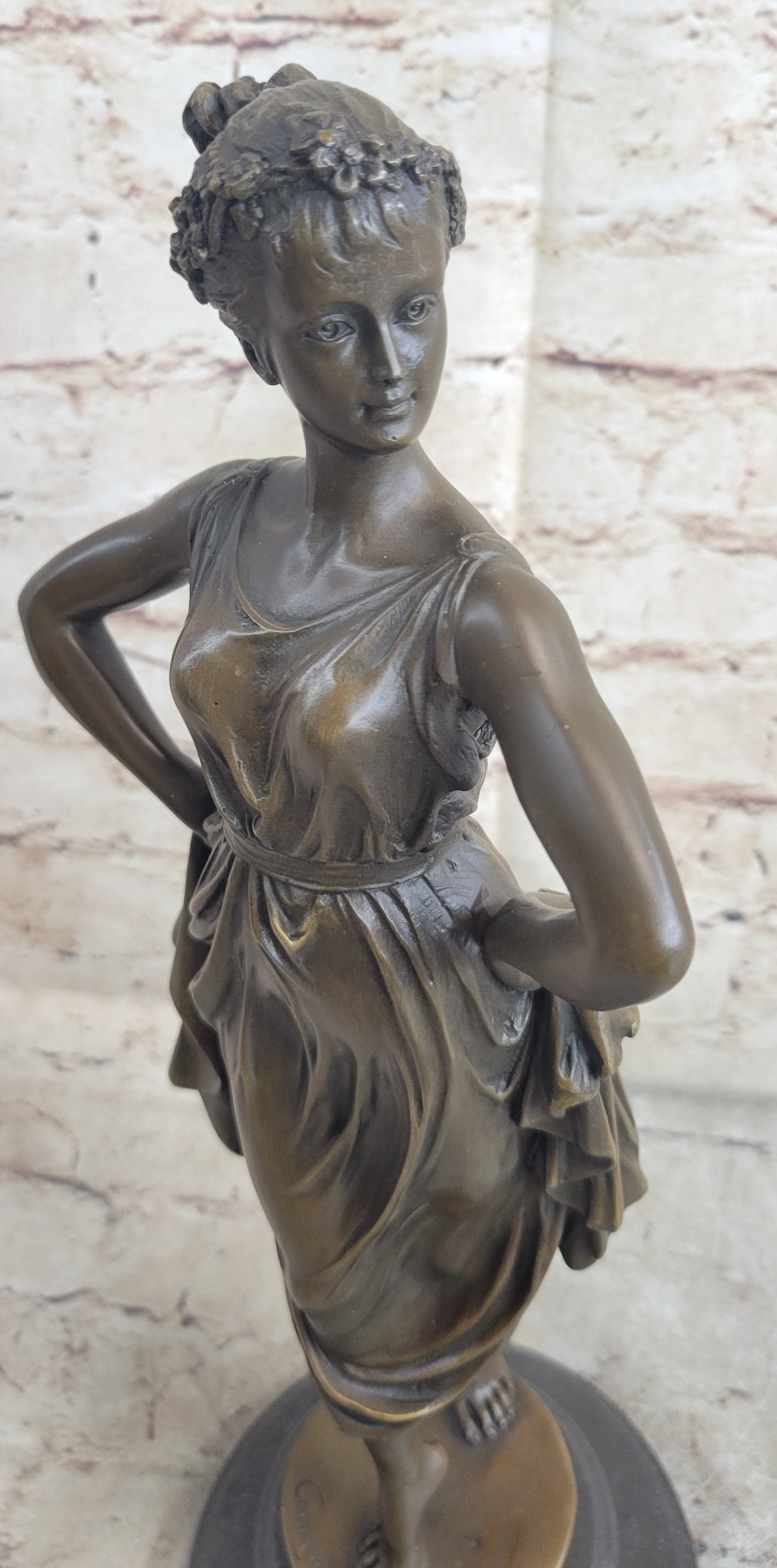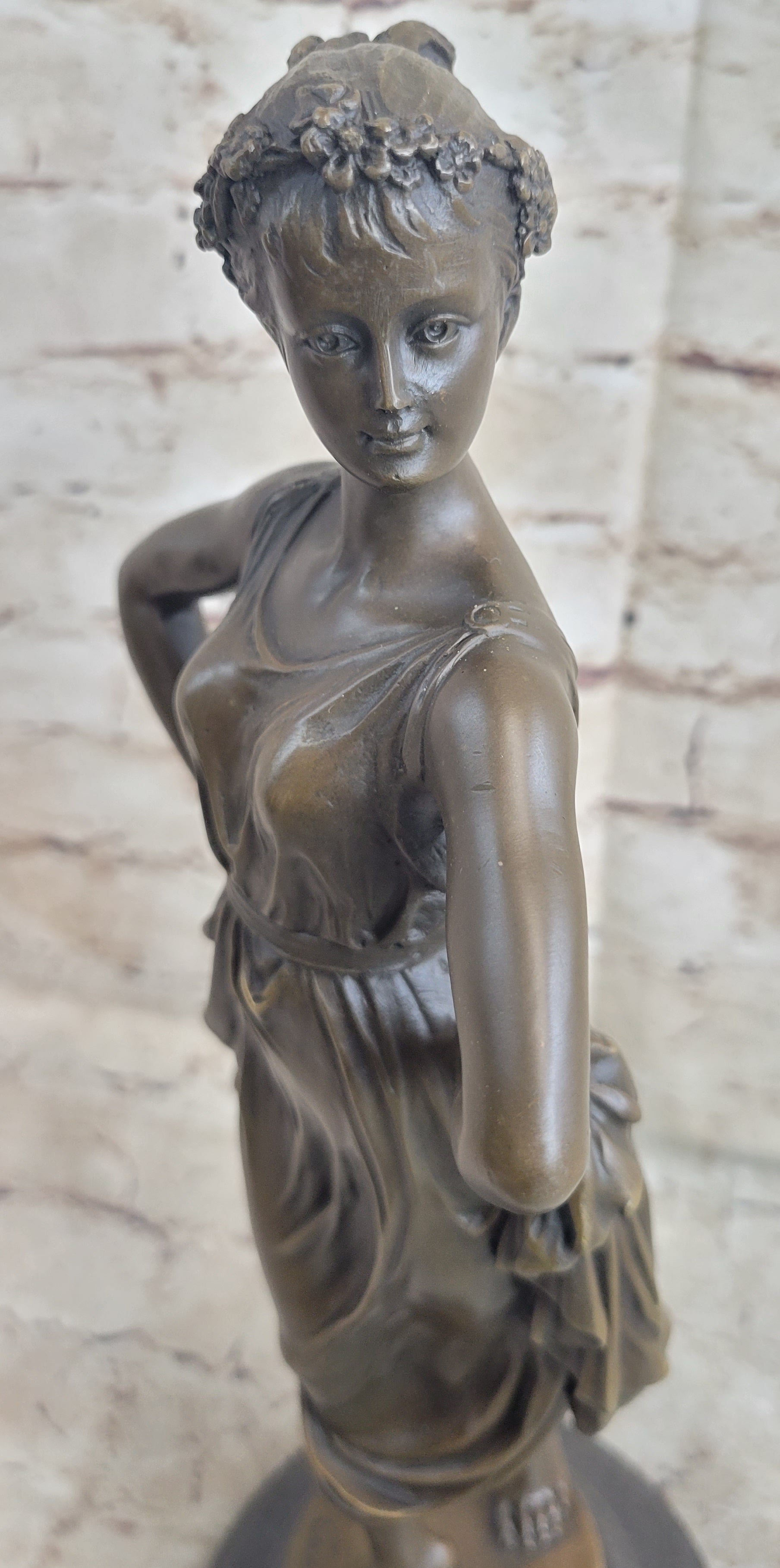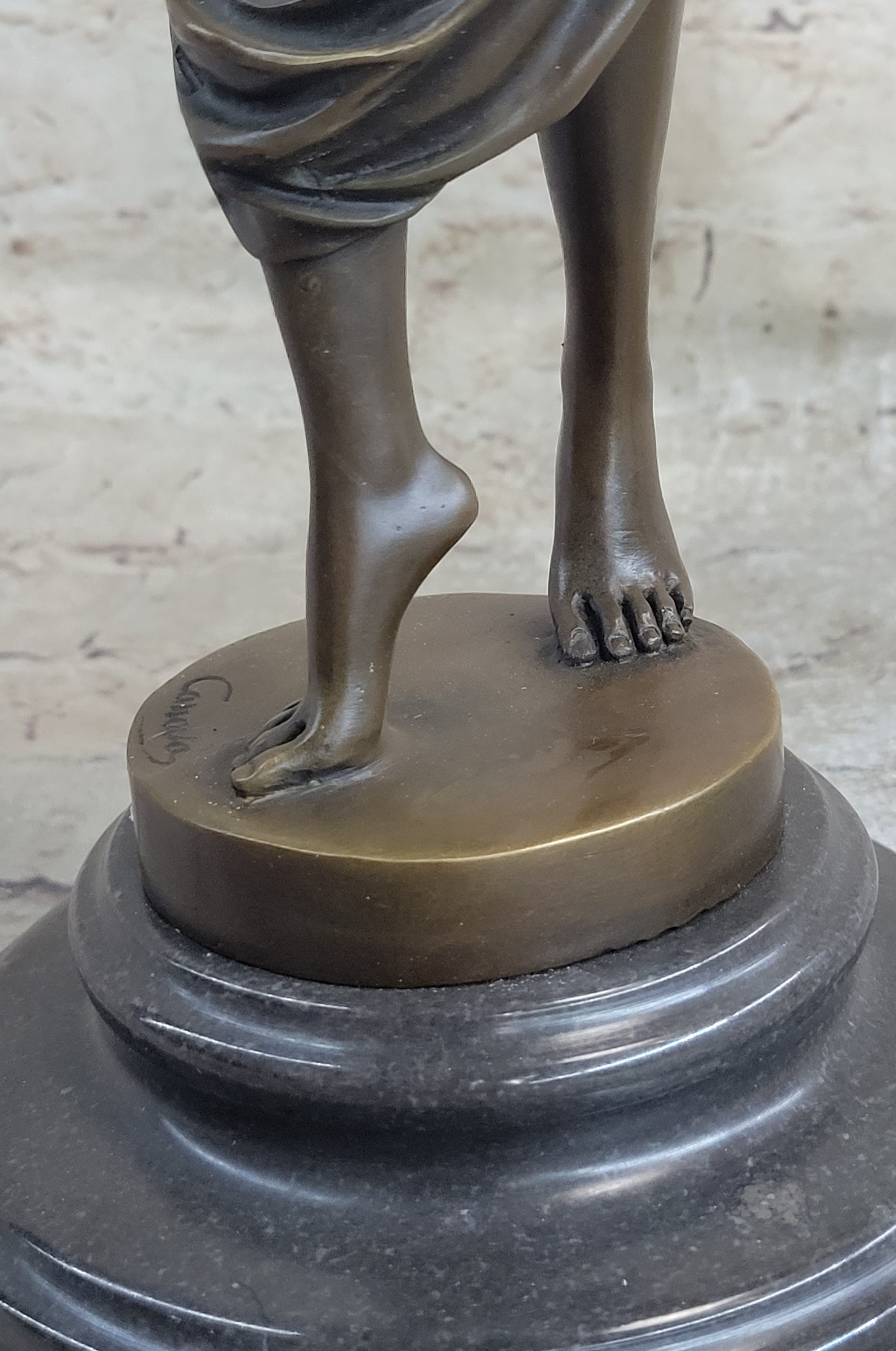 In Roman mythology, Venus is regarded not only as the goddess of love and desire, but also as something of a maternal figure, a mother of their people. In the Bronze Venus by Canova Statue, we see a modest yet beautiful side of the goddess of desire. This statue depicts Venus standing on a circular platform, covering herself with a flowing, elegant robe. Her head is turned to the side, as though thoughtfully watching a distant act, while her hair is pulled back into a simple pony tail. This modest yet beautiful statue is made entirely from Hot cast bronze, . The statue stands 14.5inches tall. The Bronze Venus signed Canova Statue is a tasteful and elegant representation of the Roman goddess of love, one that any mythological or artistic collector would certainly want to add to their collection, making this a great gift to give to the enthusiasts in your life.Bronze Dimensions with Marble Base: Height 14 1/2" x Width 6"