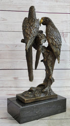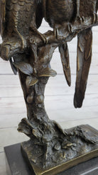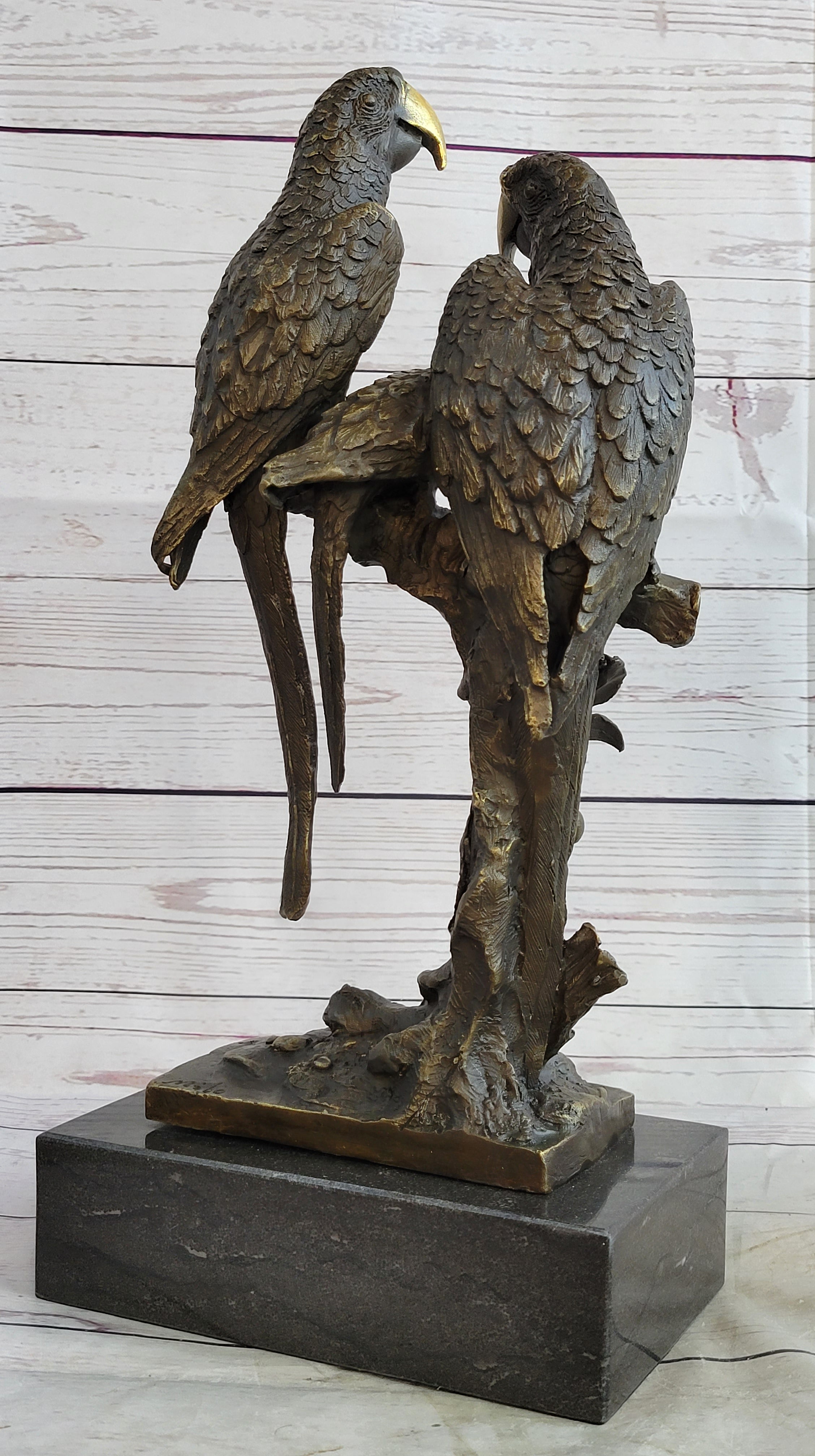 Every feather and stroke of color comes to life with meticulous craftsmanship, thanks to the revered "Lost Wax Method" employed in creating this masterpiece. The sculpture, signed by the esteemed artist Milo, elegantly rests on a sleek dark marble base, exuding a modern aesthetic that enhances its overall allure. Immerse yourself in the enchantment of these marvelous Macaws—a testament to the beauty of nature and the profound love shared among avian companions. Let this sculpture adorn your space, infusing it with vibrant colors, impeccable craftsmanship, and a touch of artistic finesse, complemented by a beautiful brown patina.Bronze Dimensions with Marble Base: Height 15.5" X Width 7.5"