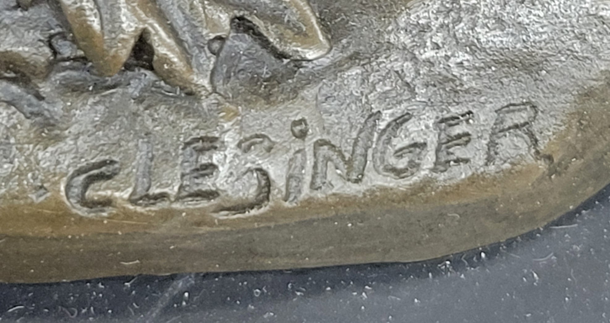 Handcrafted and cast using the "Lost Wax Method," this bronze sculpture is a testament to the artist's dedication to his craft. The dark brown patina enhances the richness of the sculpture, adding depth and texture to the overall composition. The fact that it is signed by Clesinger further authenticates its provenance and contributes to its value as a collectible work of art. This remarkable piece not only showcases the artistry of Clesinger but also captures the timeless allure and drama of a bullfight in an enduring form.Bronze Dimensions with Marble Base: Height 5" X Width 10"