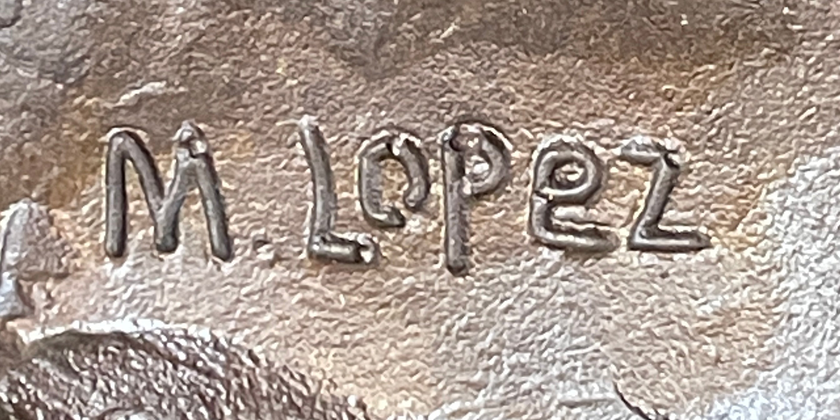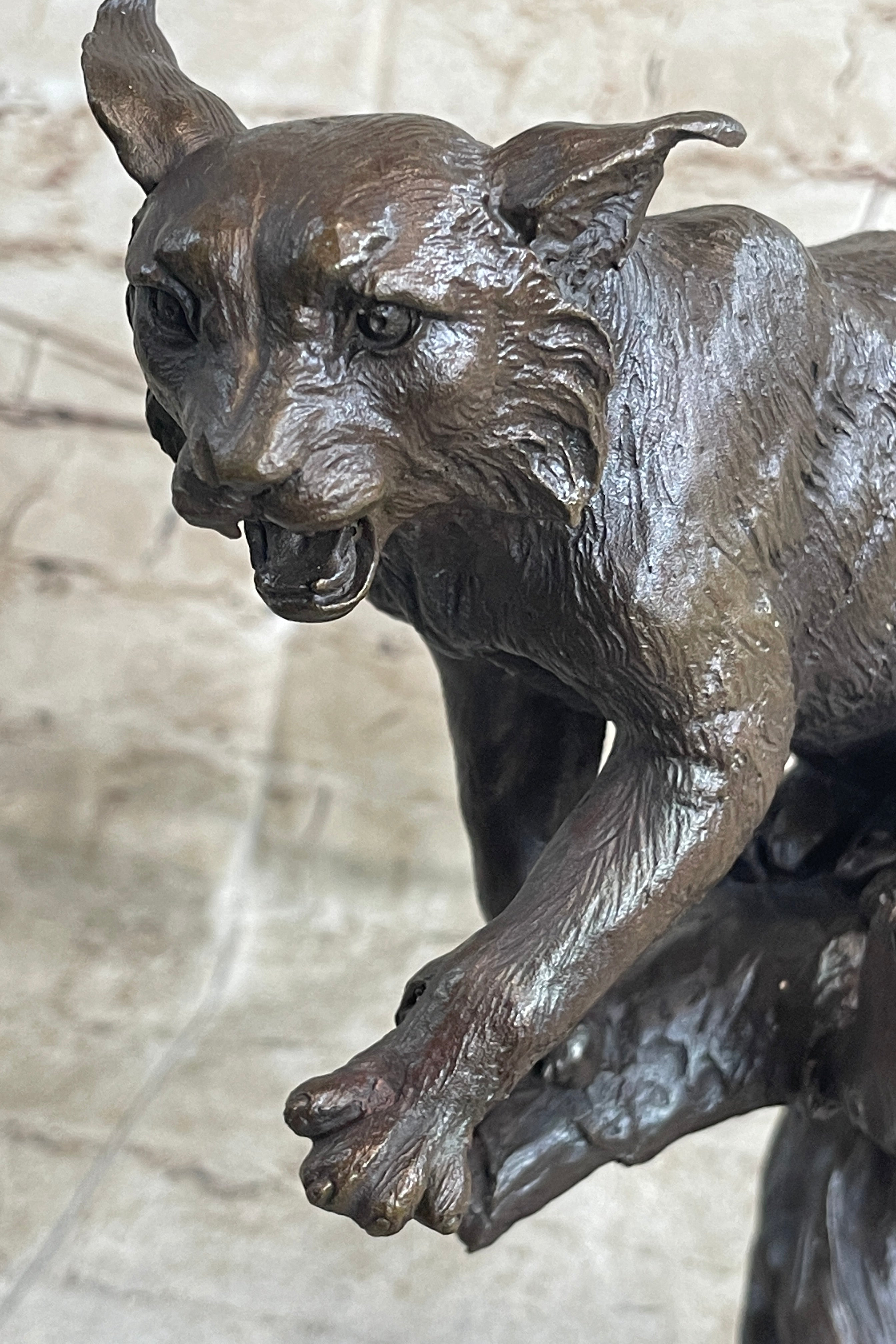 Experience the captivating world of the wild with this stunning bronze sculpture, capturing the essence of a determined bobcat marking its territory. Poised on a sturdy branch, the bobcat's fierce growl resonates as it extends its sharp claws, ready to leave its indelible mark on the surrounding landscape. This piece portrays the bobcat's territorial nature, a powerful reminder of the untamed beauty of the animal kingdom. Intricately detailed, every element of this sculpture is a testament to the artist's skill and dedication. The bobcat's fur is meticulously rendered, with each strand brought to life through the masterful use of the "Lost Wax Method." Even the gnarls and textures of the tree branch showcase an astonishing level of craftsmanship. Mounted on a solid black marble base, this sculpture commands attention and offers a unique glimpse into the world of the bobcat's domain. Crafted from 100% bronze, this sculpture not only captures the spirit of the bobcat but also pays homage to its natural habitat. The artist's signature, M. Lopez, attests to the authenticity and quality of this masterpiece. Whether displayed in a wildlife enthusiast's collection or as a statement piece in any space, this bronze sculpture invites you to explore the untamed allure of the bobcat's world.