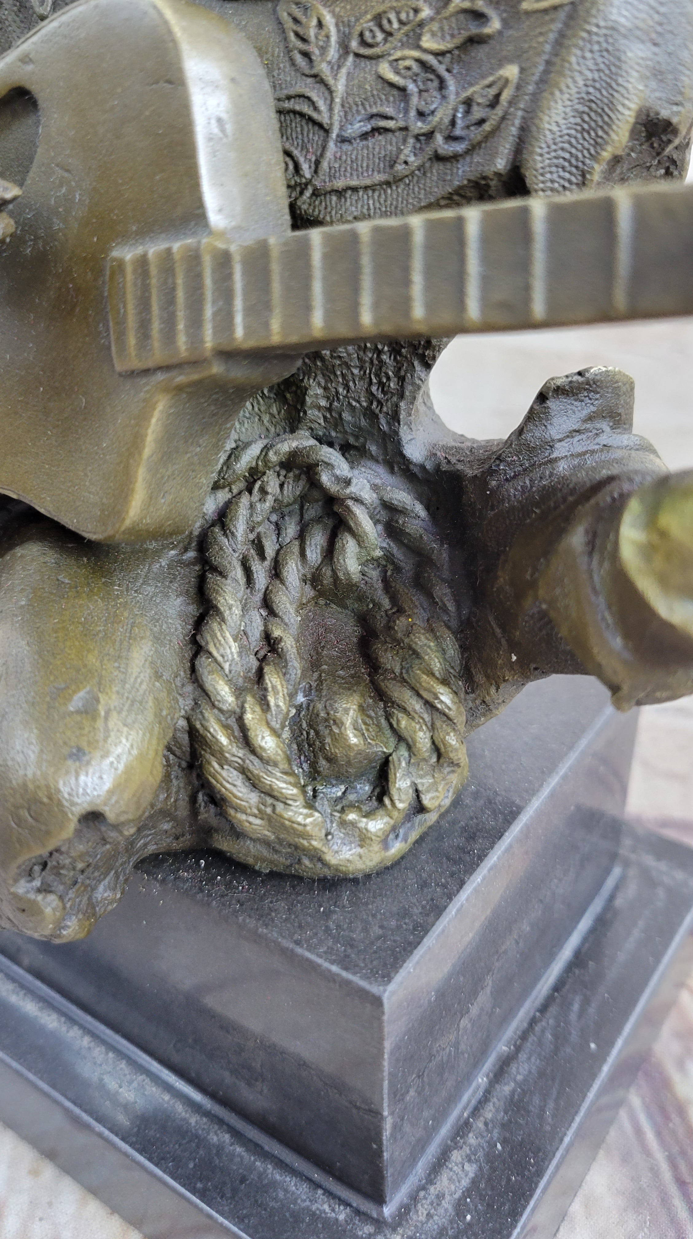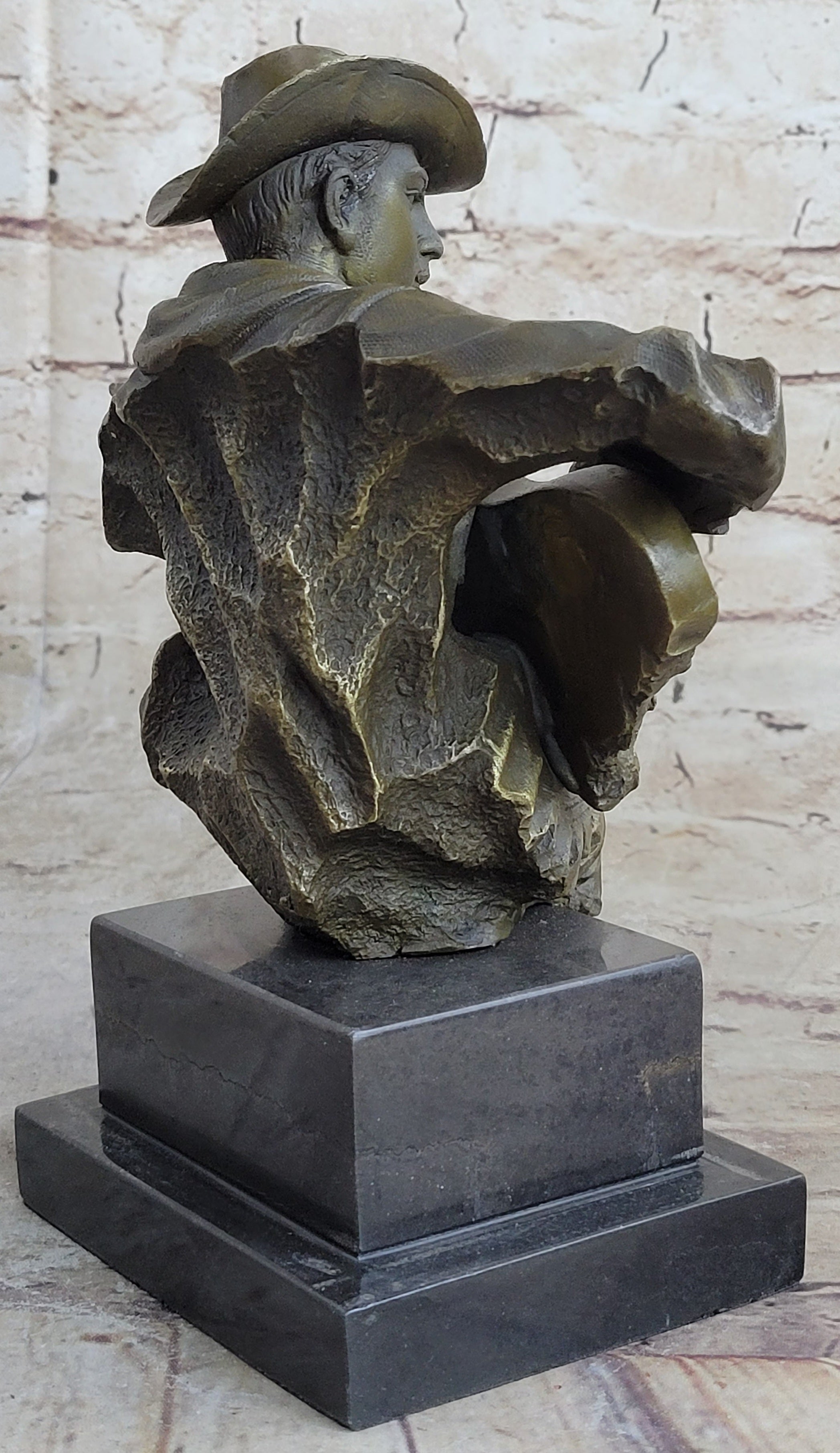 Step into the world of western allure with this remarkable bronze sculpture that beautifully portrays a cowboy musician strumming his guitar. The intricate details in this piece showcase the artist's creative prowess, capturing the cowboy's intense focus as he delicately touches each guitar string. Every nuance of his expression, from the concentration in his eyes to the assured positioning of his hands, reflects the devotion and passion he pours into his music.